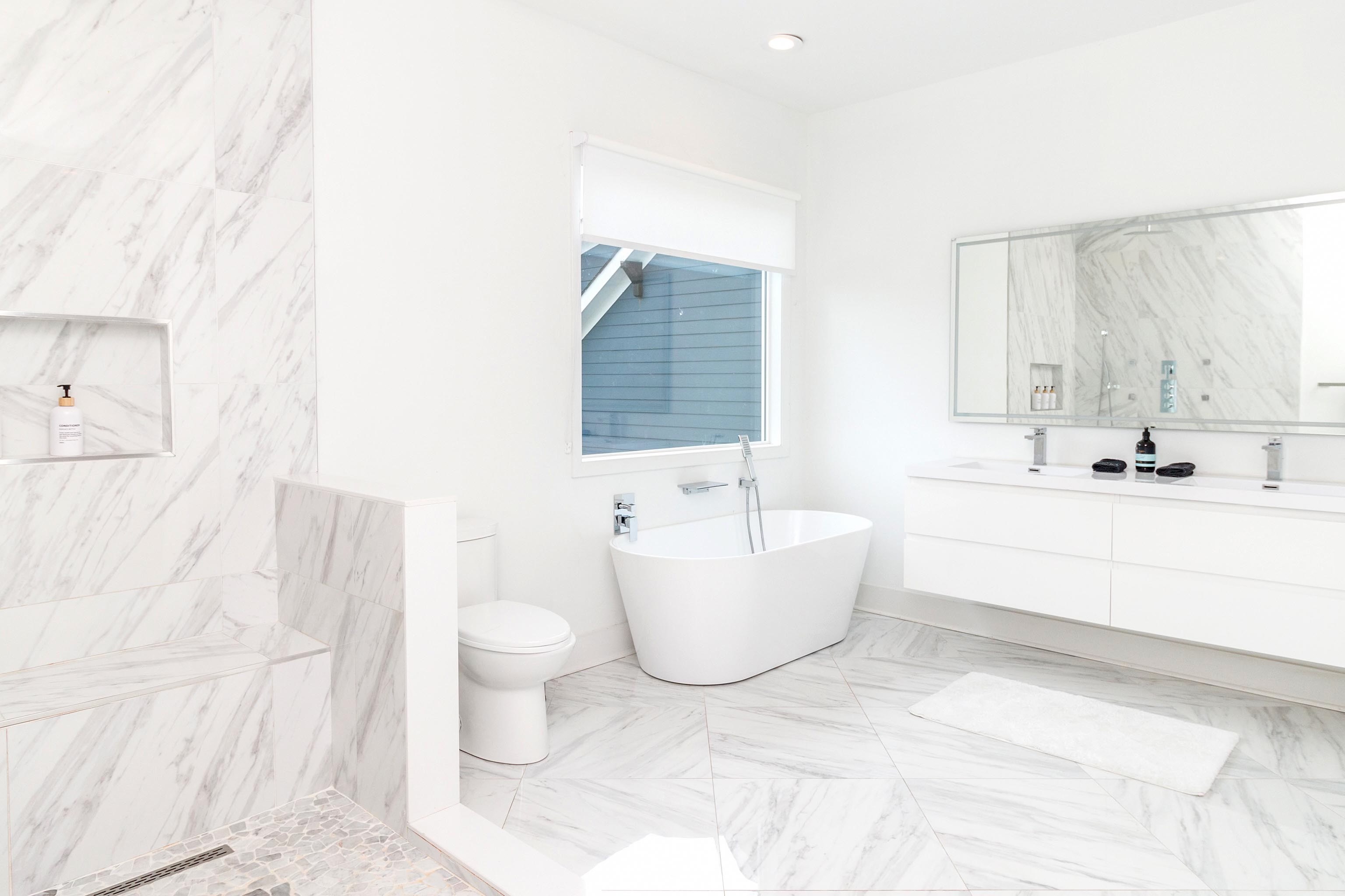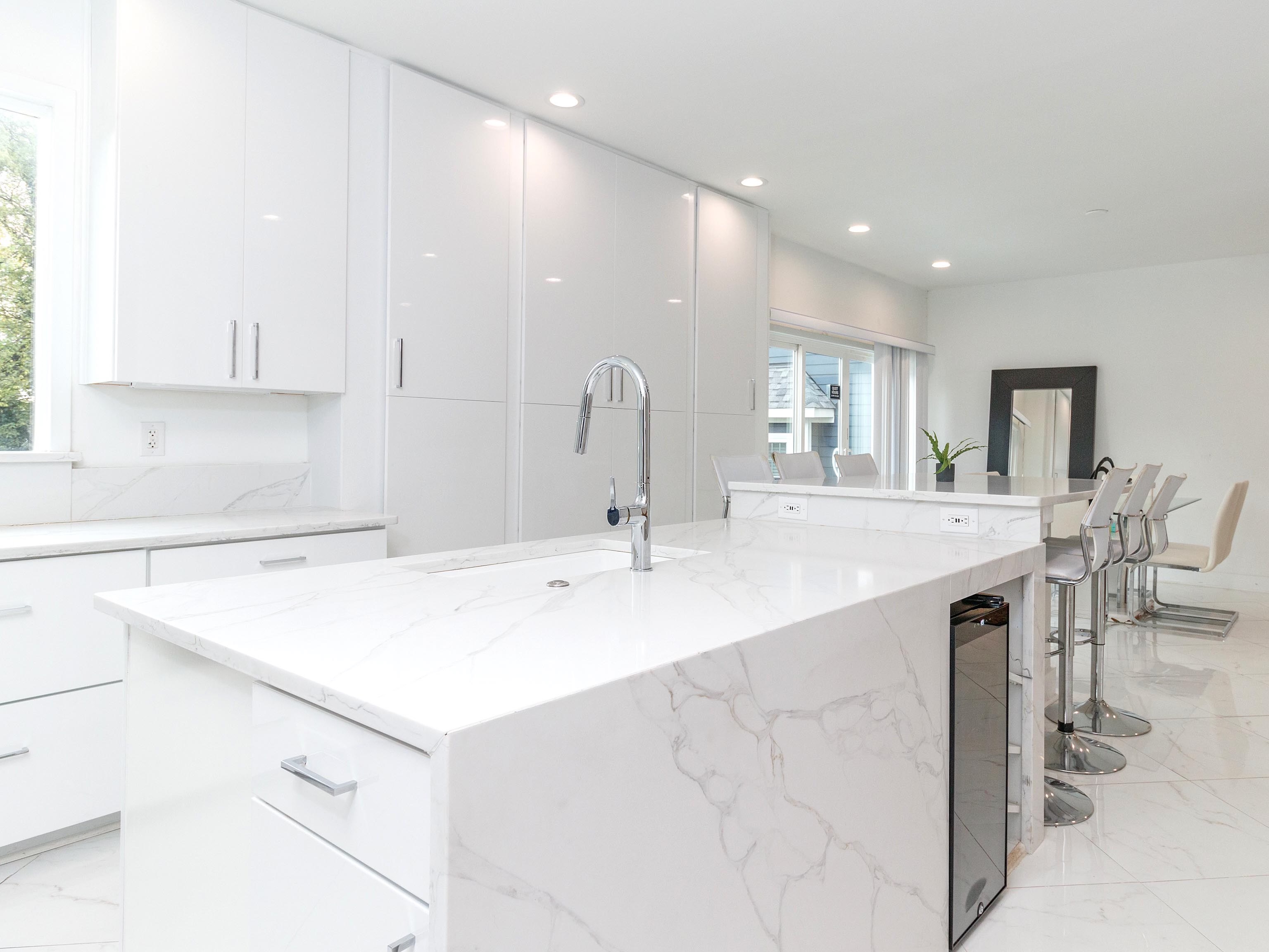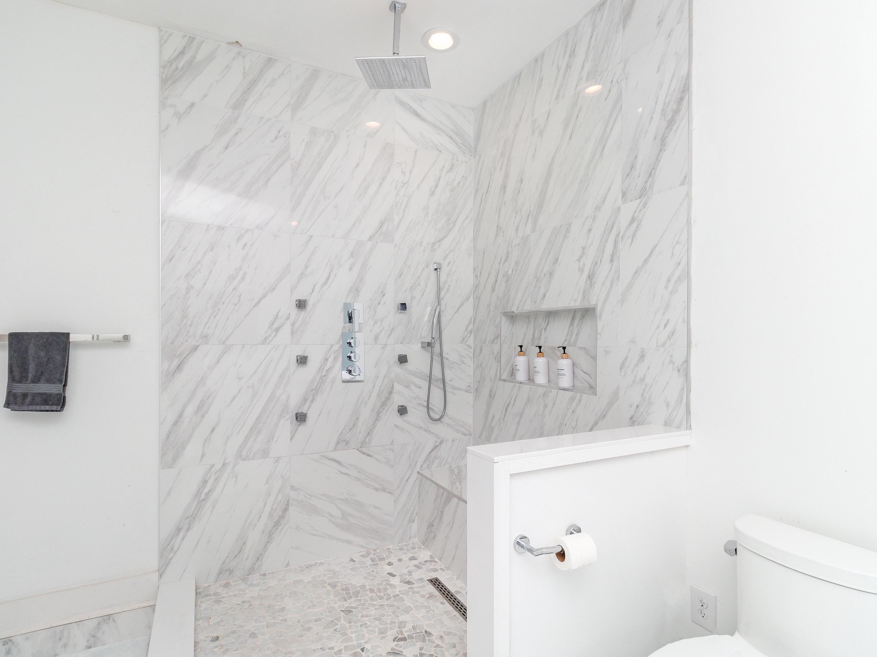 -White marble & stone, hardwood floors