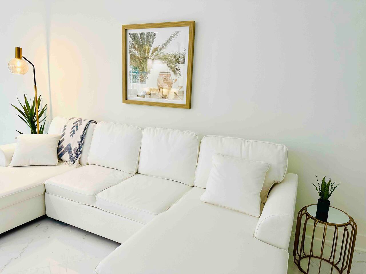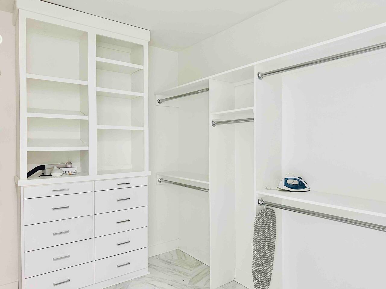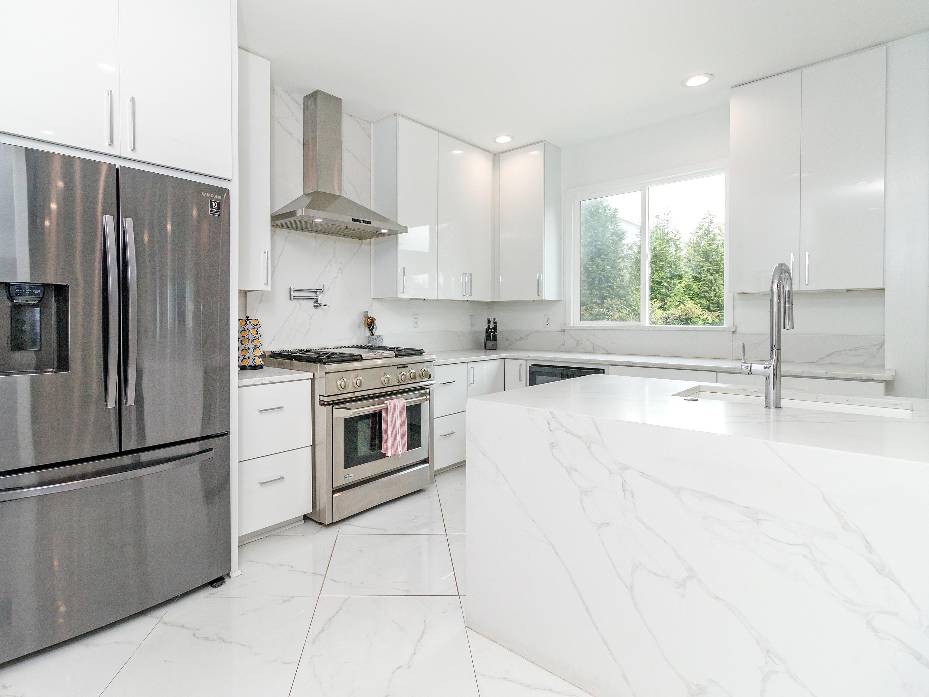 -White marble & stone, hardwood floors