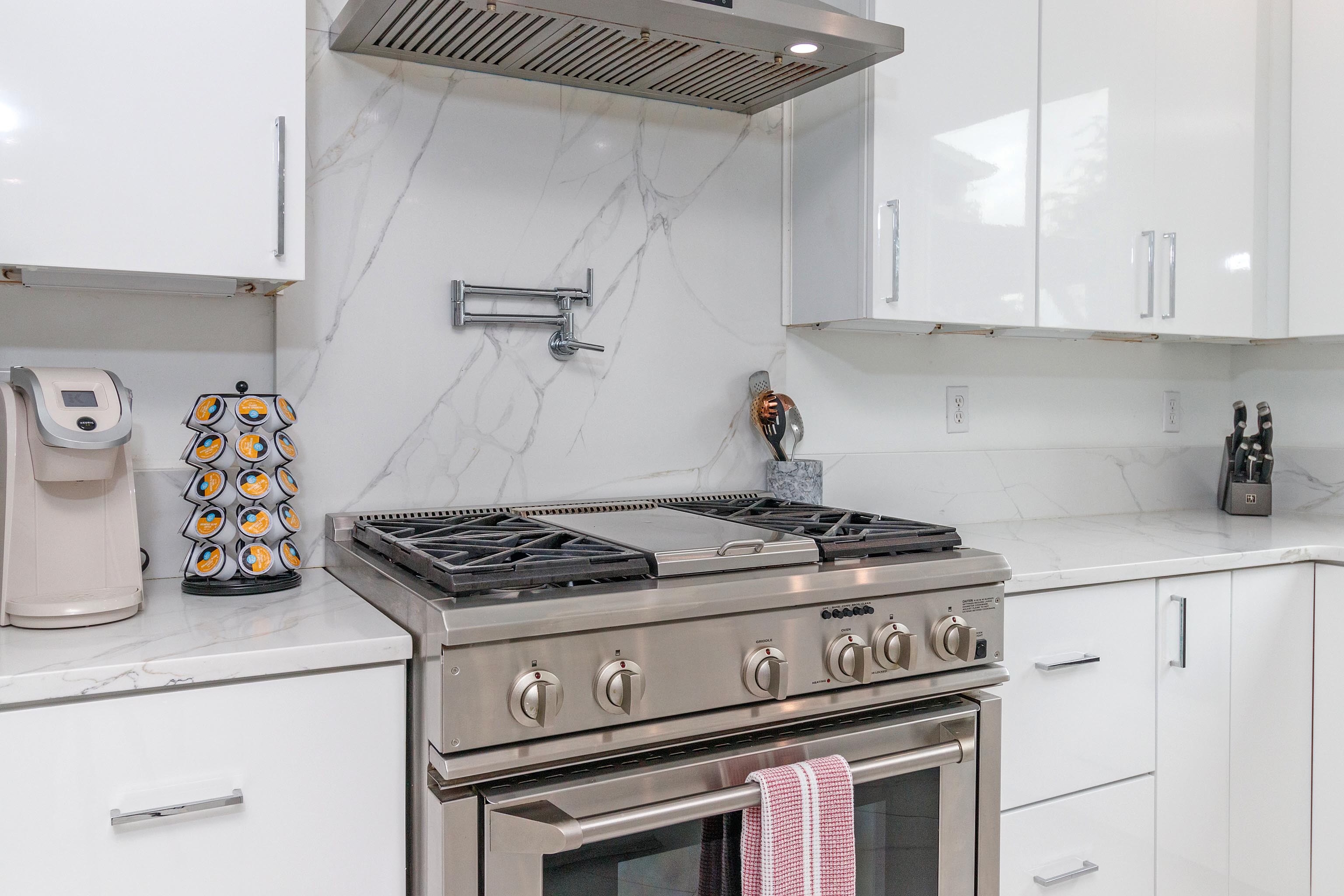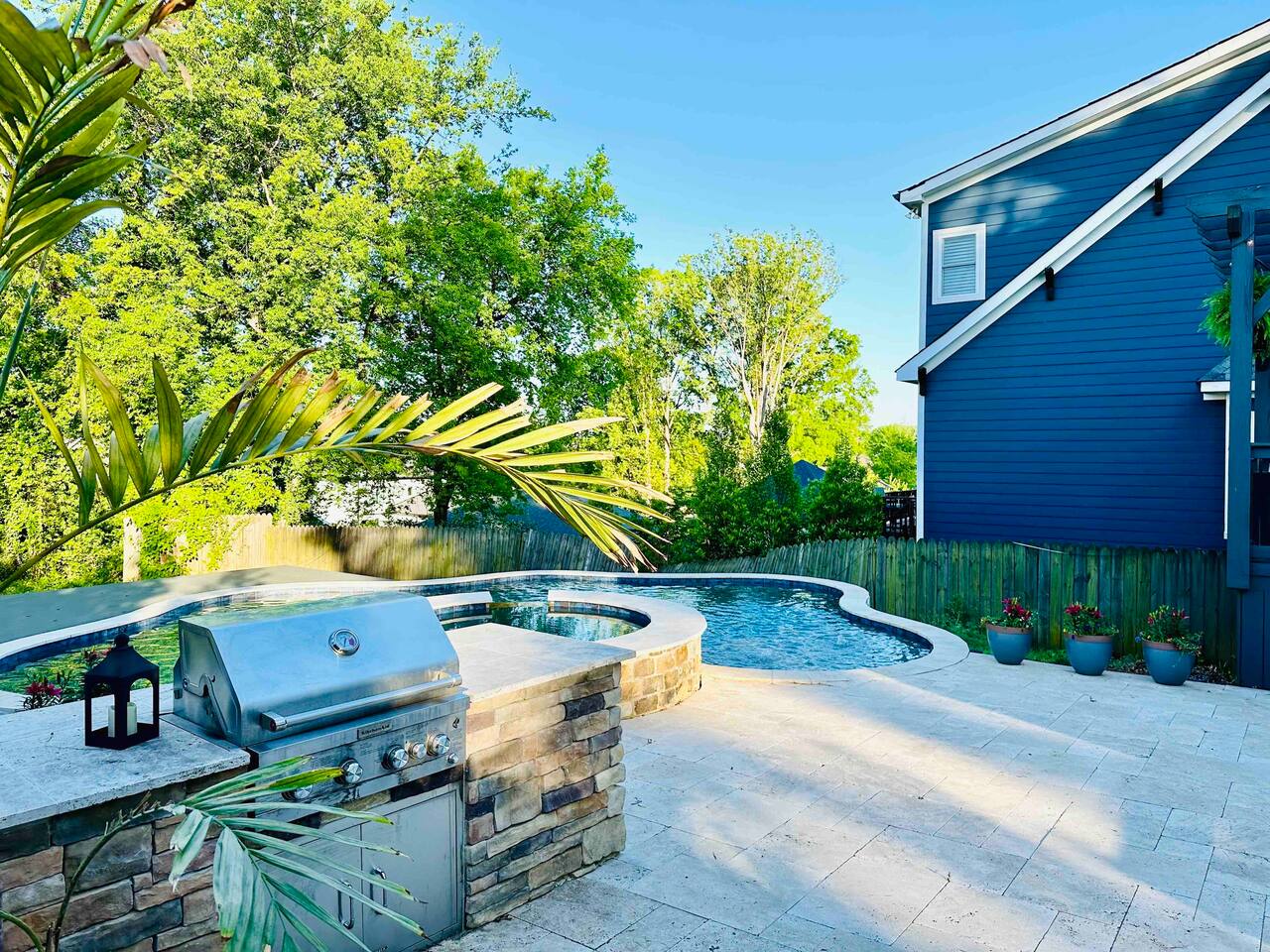 With marble countertops, stainless steel appliances, and a gas range, this is the perfect entertainer's kitchen. Fully stocked with pots, pans, silverware, dishes, sharp knives, kitchen shears, and important extras like toaster, blender, and even food processor. You’ll also find both a Keurig coffee machine (with K-cups) and a French press — coffee is provided! Also find pool and hot tub friendly acrylic glasses for safe and lively outdoor fun. Ice maker on fridge. The 13 foot island also has its own TV.