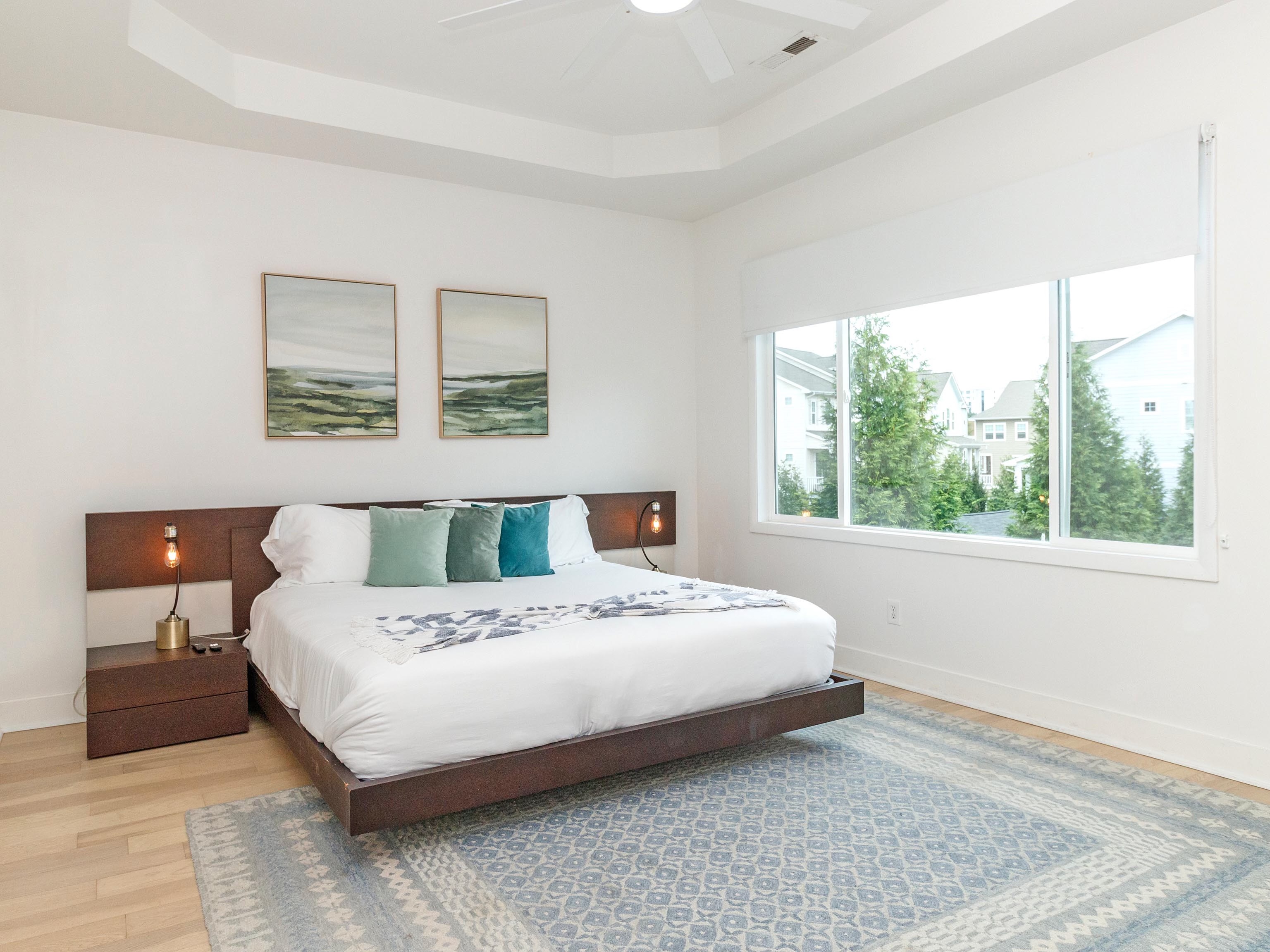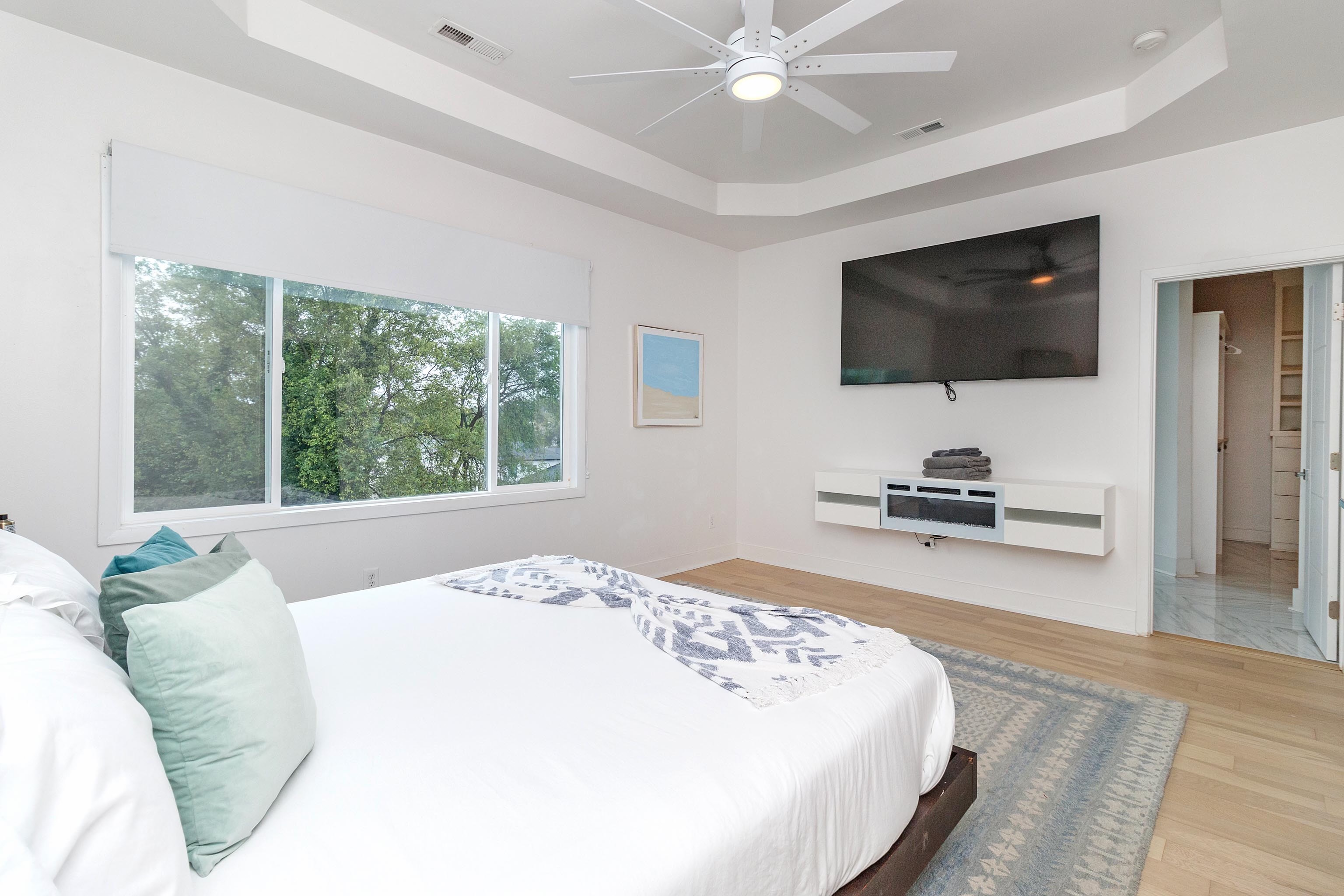 The spacious primary suite overlooks the backyard complete with pool, hot tub, outdoor kitchen, and patio. You can also catch a view of uptown Charlotte! King bed with dramatic bed frame stretches across the back wall. Wood floors and plush rug for the comfort of your feet. Bedside lamps and built in lighting on your bedframe, too. Pull the blackout shade for shut eye. Overhead fan for air movement. Giant smart TV for watching your favorite shows in bed, mounted high on the wall so that you don't get a crick in your neck. It's perfect.