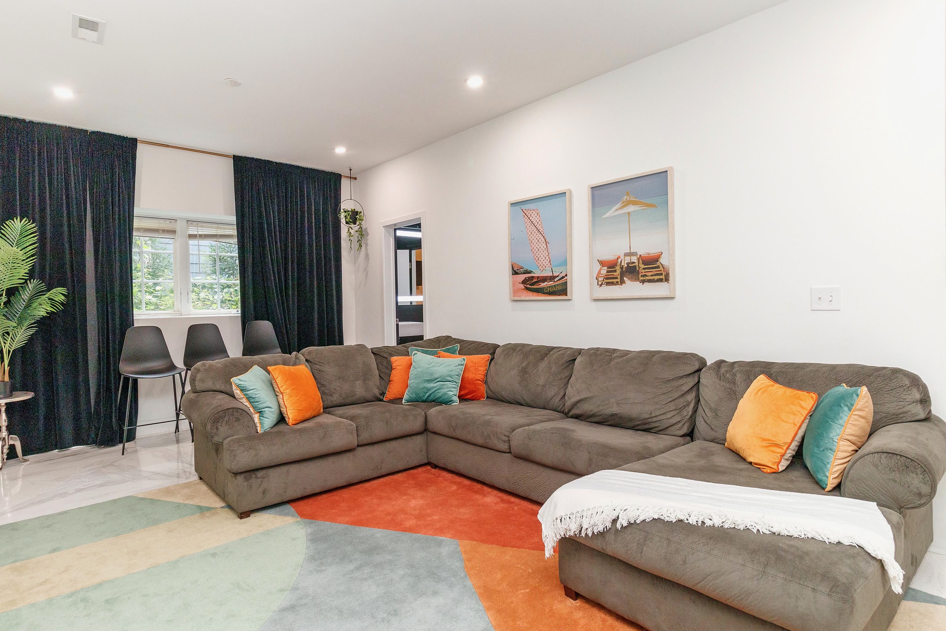 Stretch out on the massive 12 foot couch for movie night! The wall of blackout curtains brings in a movie theatre feel and a flair of drama.