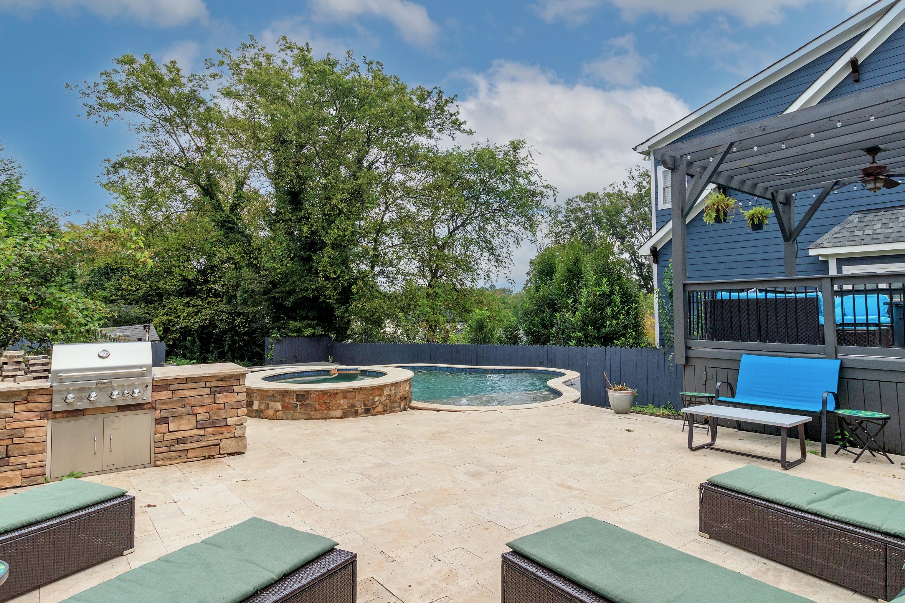 Outside you'll find the back patio, outdoor kitchen, pool, and hot tub. The patio is adorned with a large outdoor couch and propane fire pit. Patio lights shine overhead. Built in gas grill surrounded by chaise loungers. Set the hot tub to a temp of your choice - and swim in the lovely pool. (Can be heated upon request.)