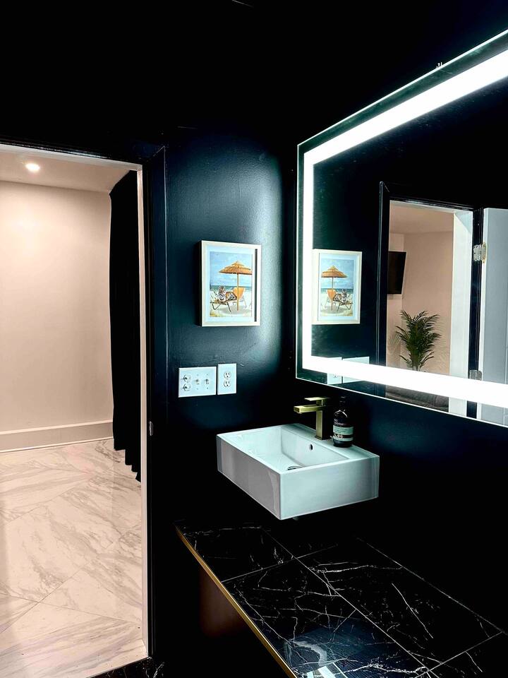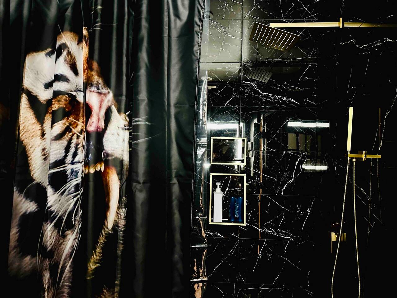 The downstairs bathroom is ALL BLACK. Rainfall style shower head and tiger decor make this next level.