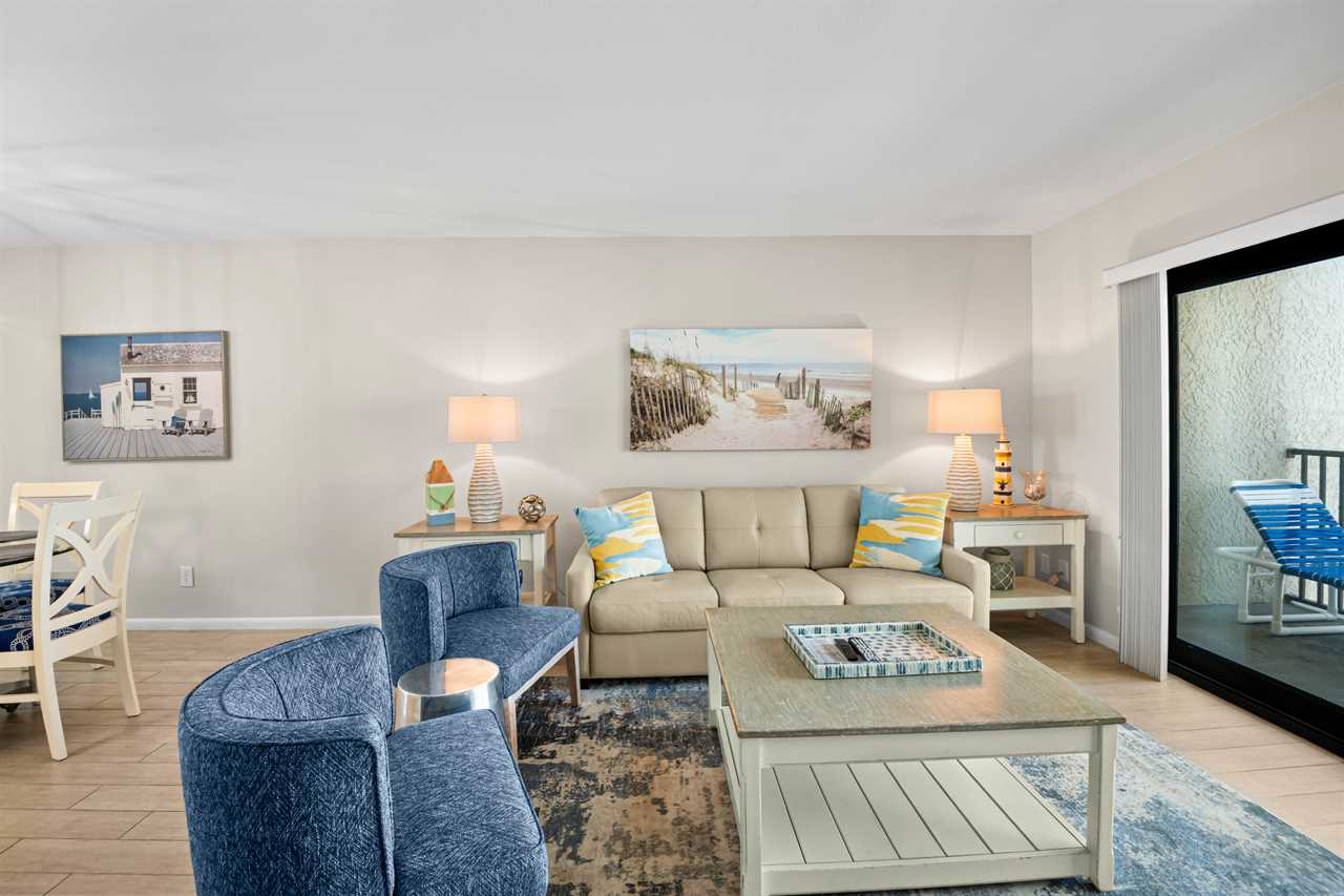 - Living Room β Sleeper sofa + loveseat, 50β flat screen TV, balcony access