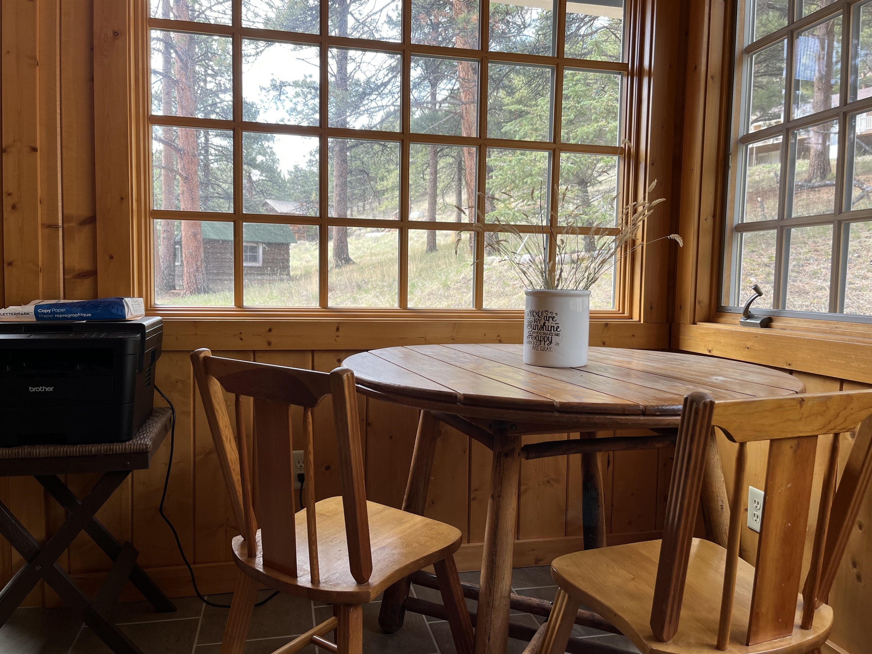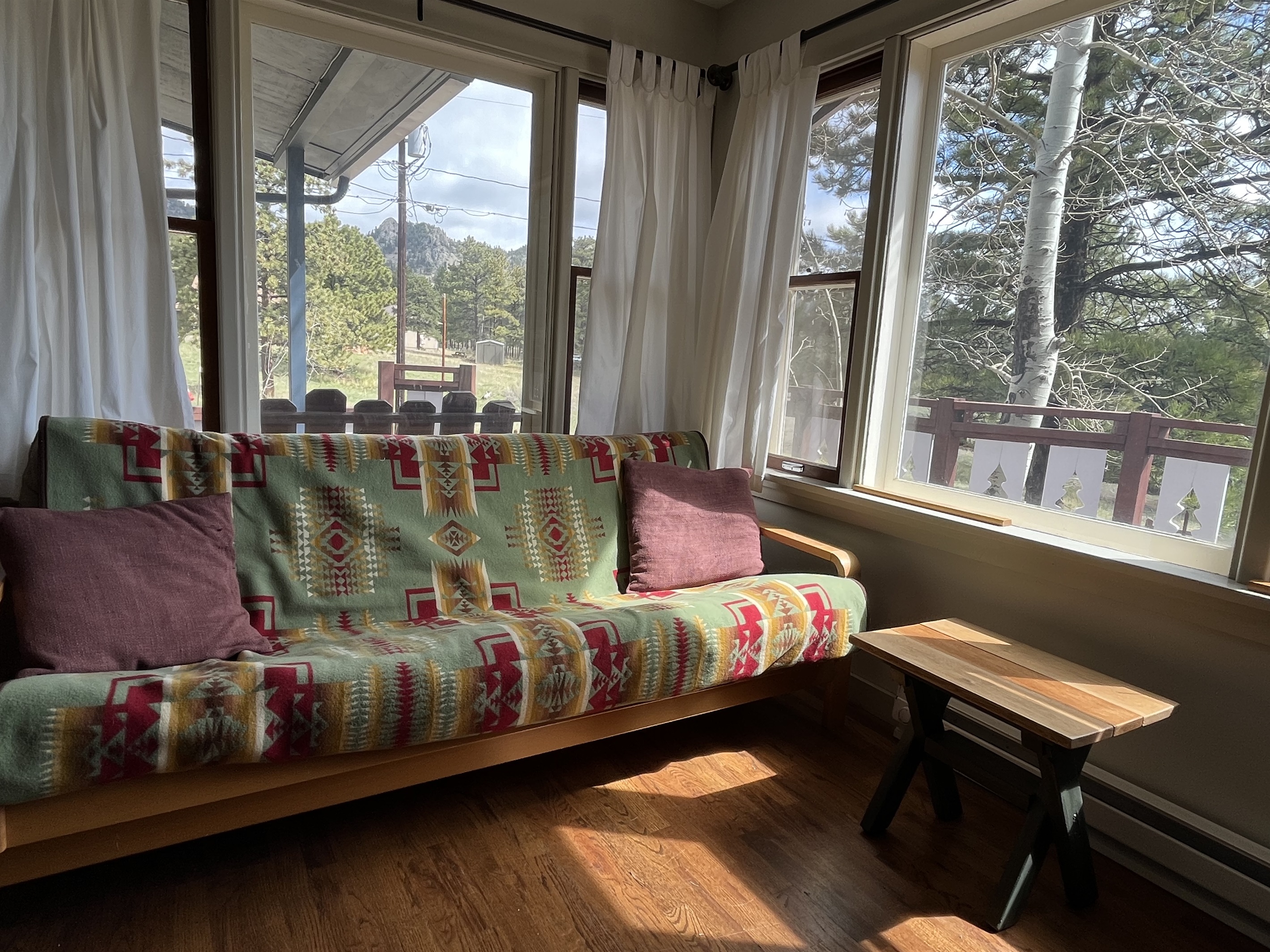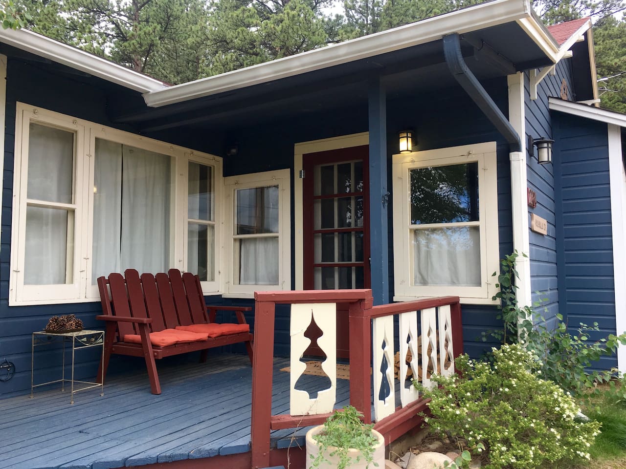 Tons of character in this adorable mountain home! (STR license 22-ZONE3294) Located on the edge of Rocky Mountain National Park in Estes Park, CO - hike right into the park or enjoy the mountain surroundings from your deck. You will love all the personal touches and little details throughout this cabin. Spacious king bedroom, additional bedroom with full bed and ensuite half bath, plus shared full bathroom with tub/shower combo. Comfortable living room with futon, wood burning fireplace, Smart TV, and nice views. Fully stocked kitchen with separate dining area in the adjacent sun room. Gas grill and outdoor dining on the back patio. Printer available for remote office work.