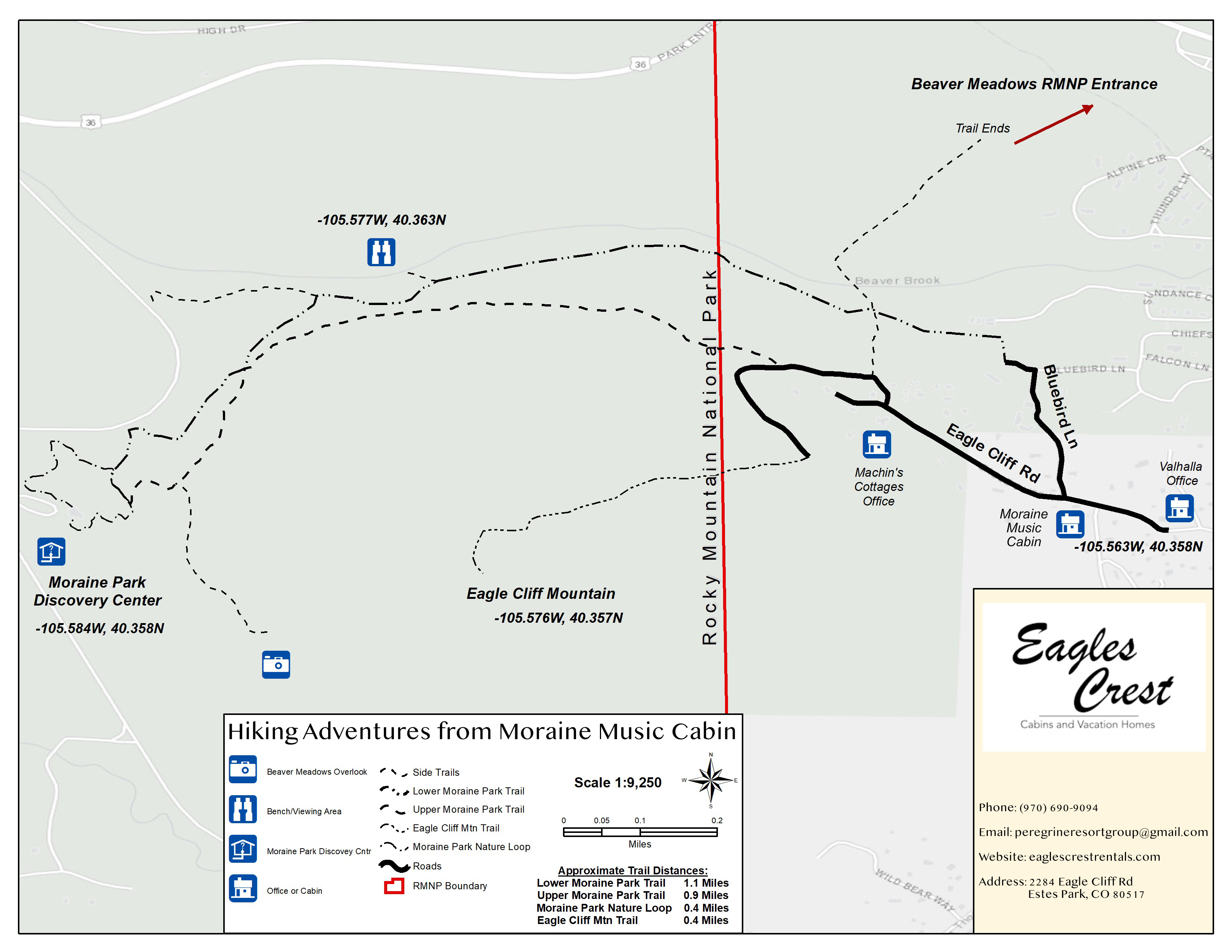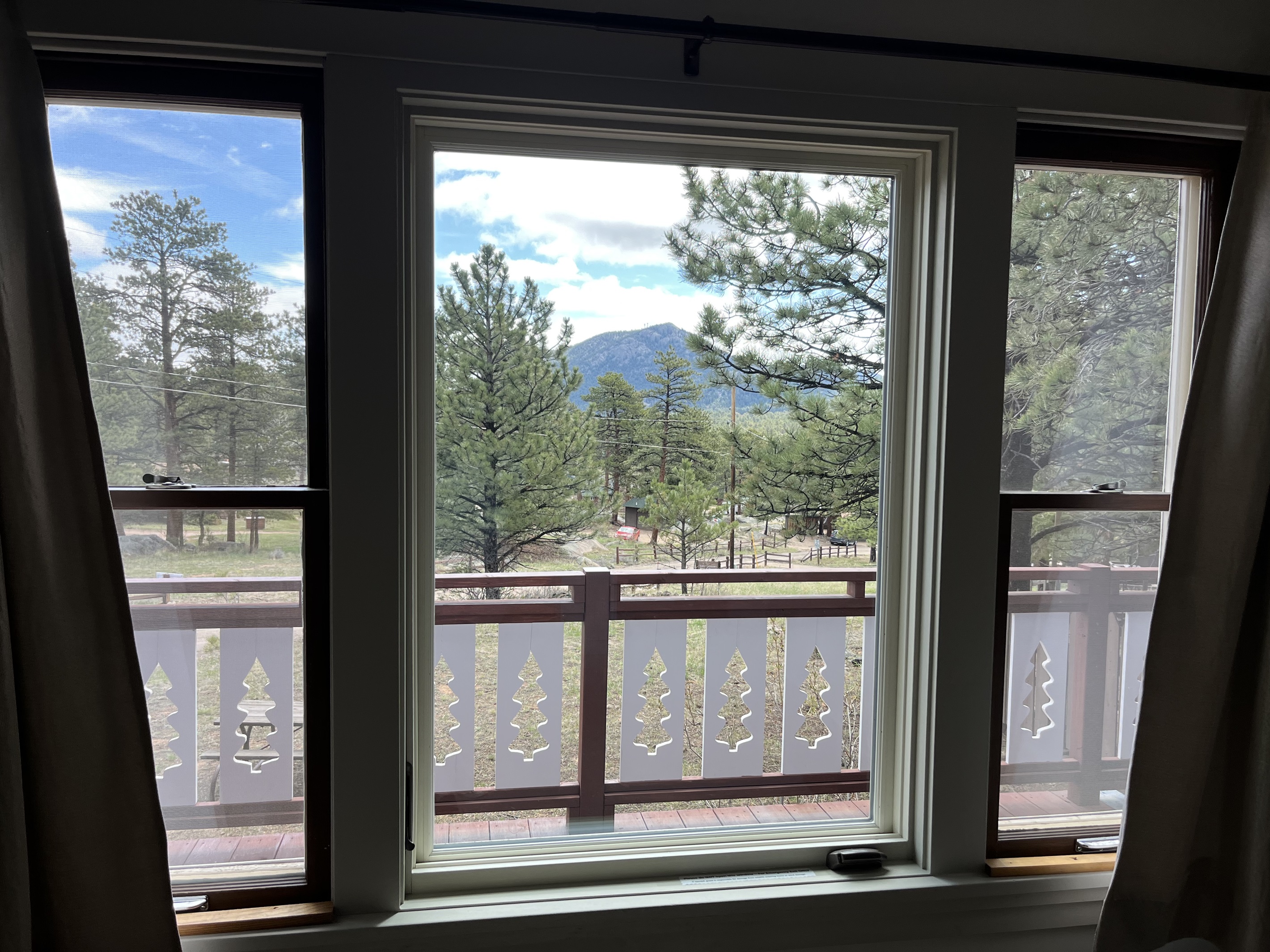 The property sits at the base of Eagle Cliff Mountain, away from the busy section of town, in a quiet, spread out, residential area. Frequent wildlife. Downtown Estes Park is about 2.5 miles away. Beaver Meadows entrance is less than 2 miles. Walk up the road to access hiking trails into RMNP.