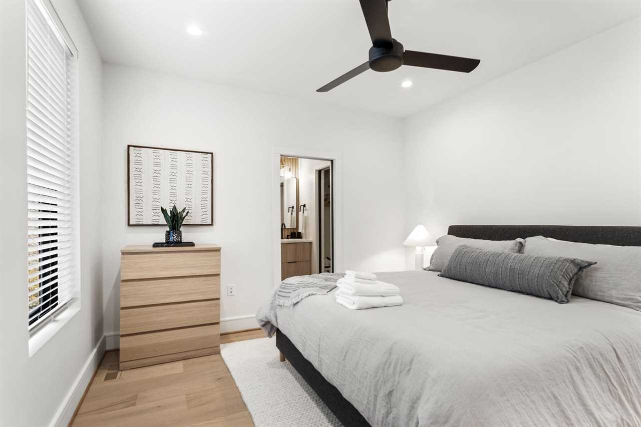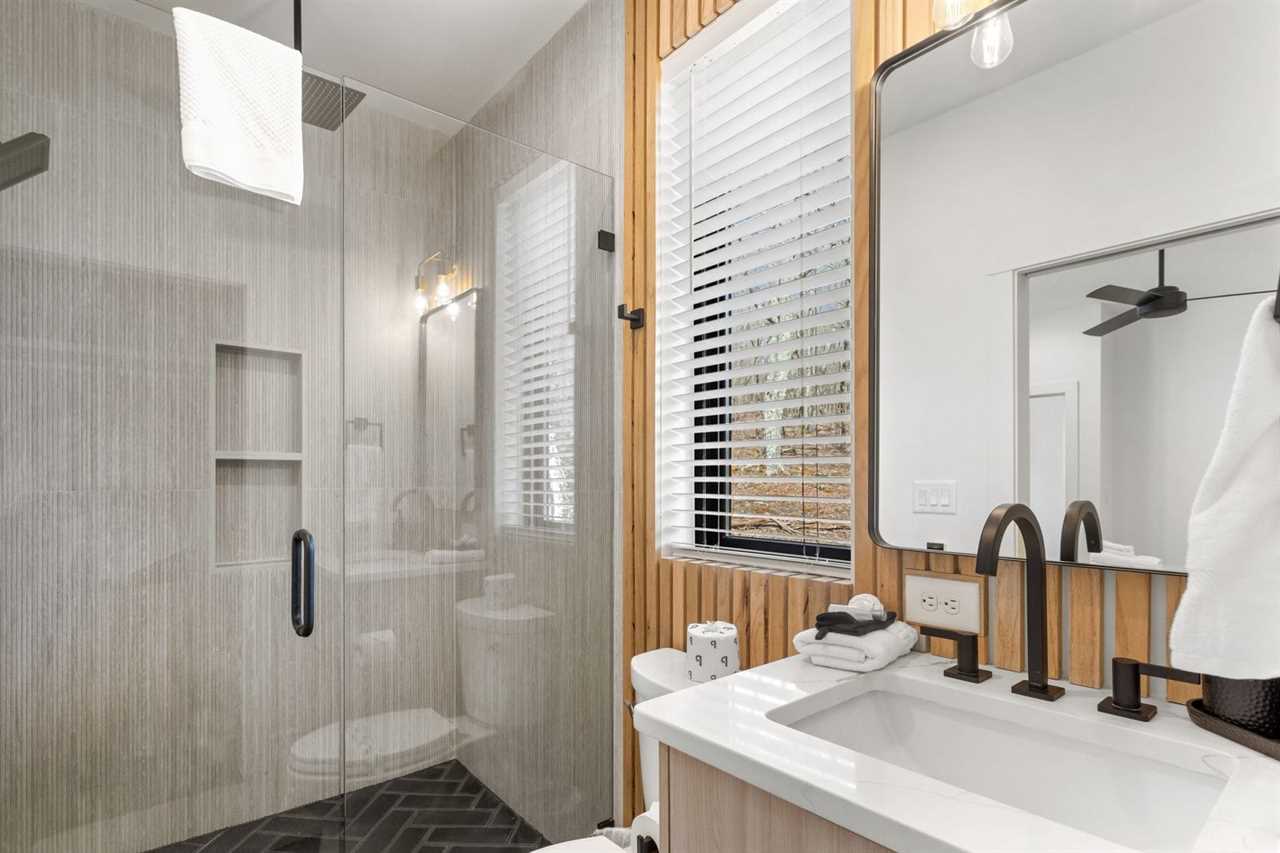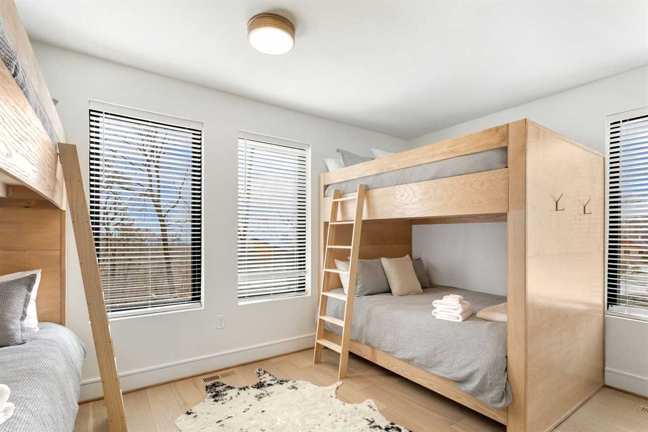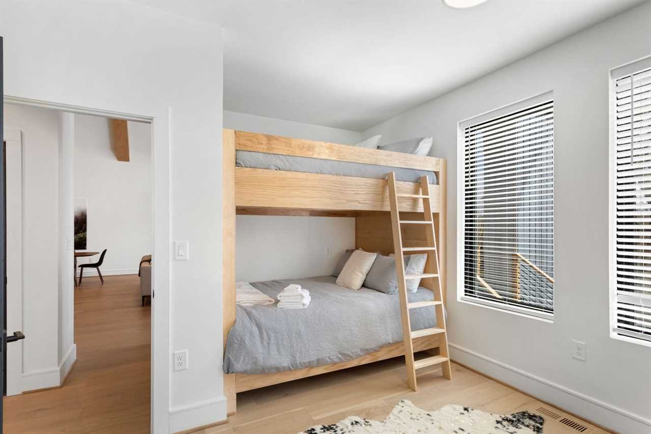 The Bear at Sugar Mountain features four spacious bedrooms, including two master suites, and can accommodate up to twelve guests. The master bedroom, located off the living room has a king bed and private ensuite with a level entry shower. The back deck and hot tub can be accessed from this bedroom. The second master bedroom also has a king bed and private ensuite with a level entry shower. A third king bedroom shares a full Jack-N-Jill bathroom with a bunk room. The bunk room houses two built-in queen-over-queen bunkbeds.