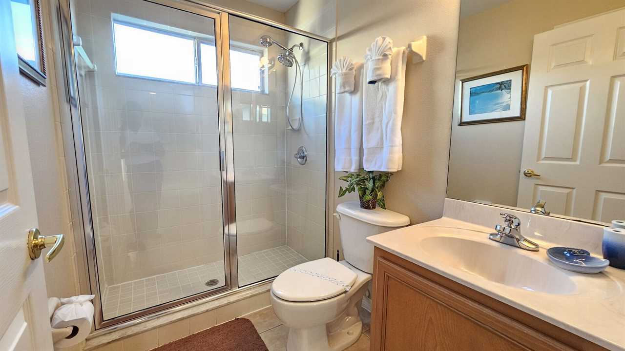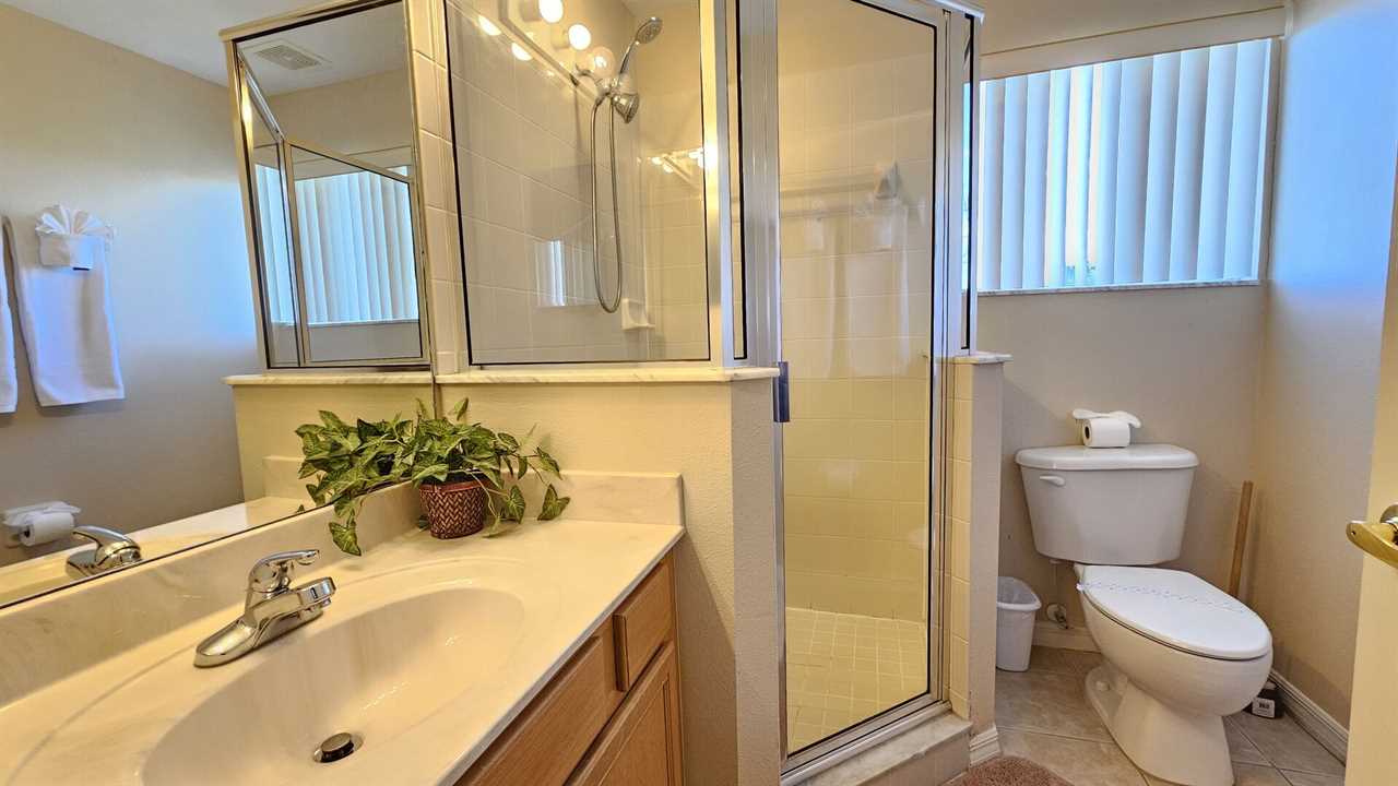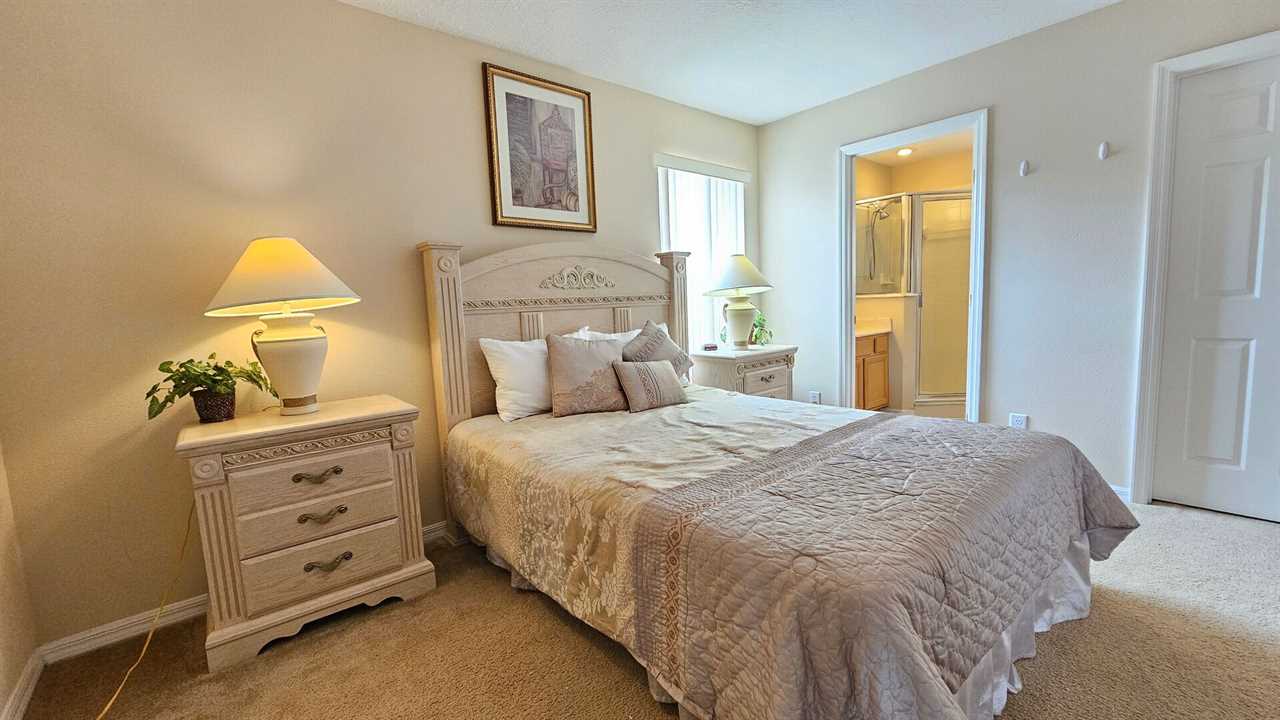 Queen master bedroom with a walk in corner shower