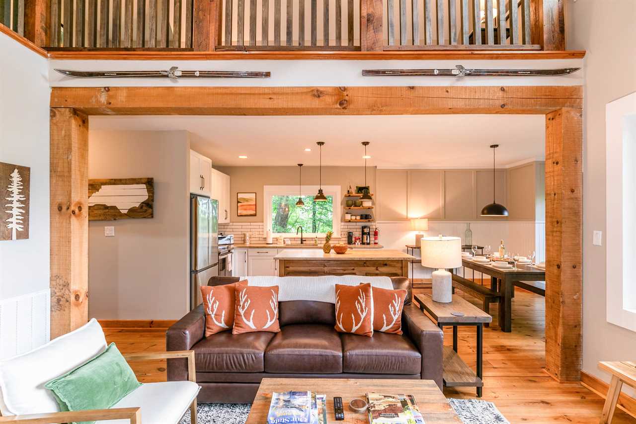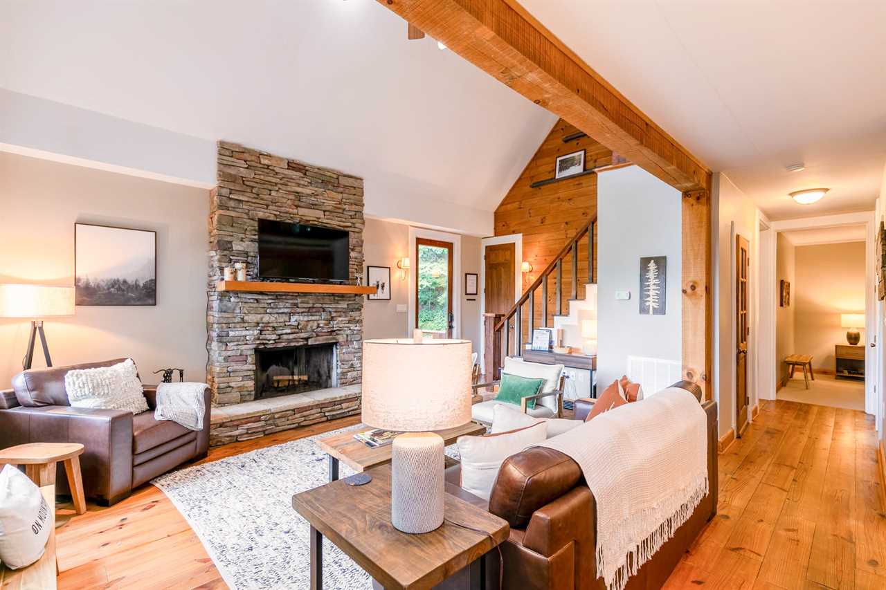 The main level of this home features an open and airy great room with vaulted ceilings, rustic hardwood floors, leather furniture facing a stone wood-burning fireplace, and a SmartTV mounted above. The