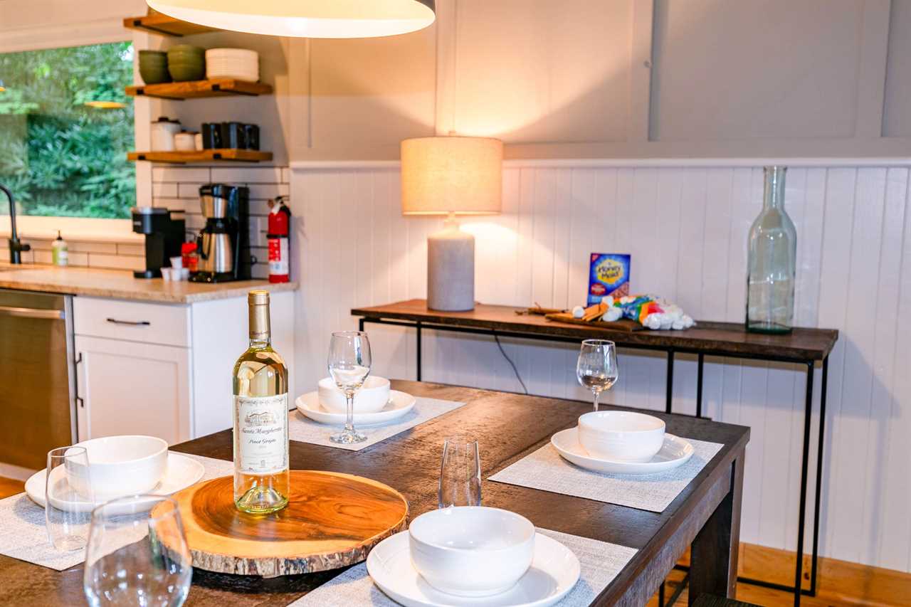updated kitchen offers granite counters and a spacious island, stainless steel appliances including a double-door refrigerator, and all the items you need to prepare everything from a quick snack to a delicious dinner. There's room for everyone to enjoy a meal together between the bench-style dining room table and the three stools at the island.