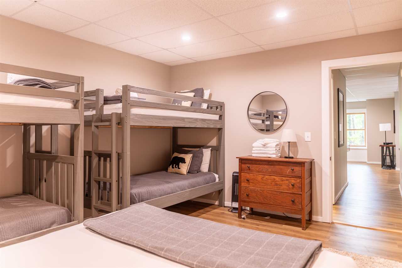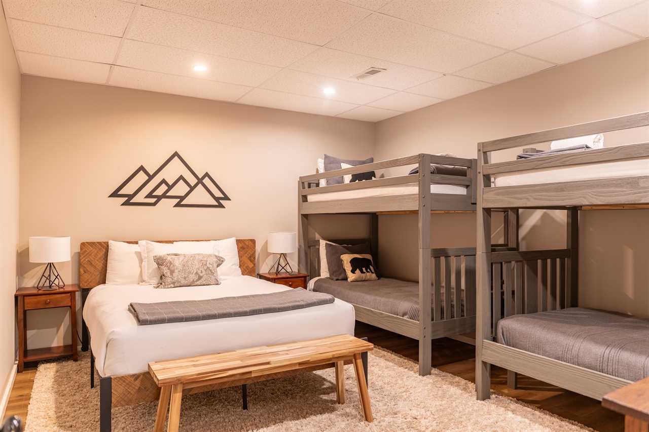 Downstairs: "The Wolves Den"; bedroom, a homage to NC State and the city of Raleigh. This room has a Queen bed and two sets of Twin/Twin bunks and there is a full bath down the hall with a shower.