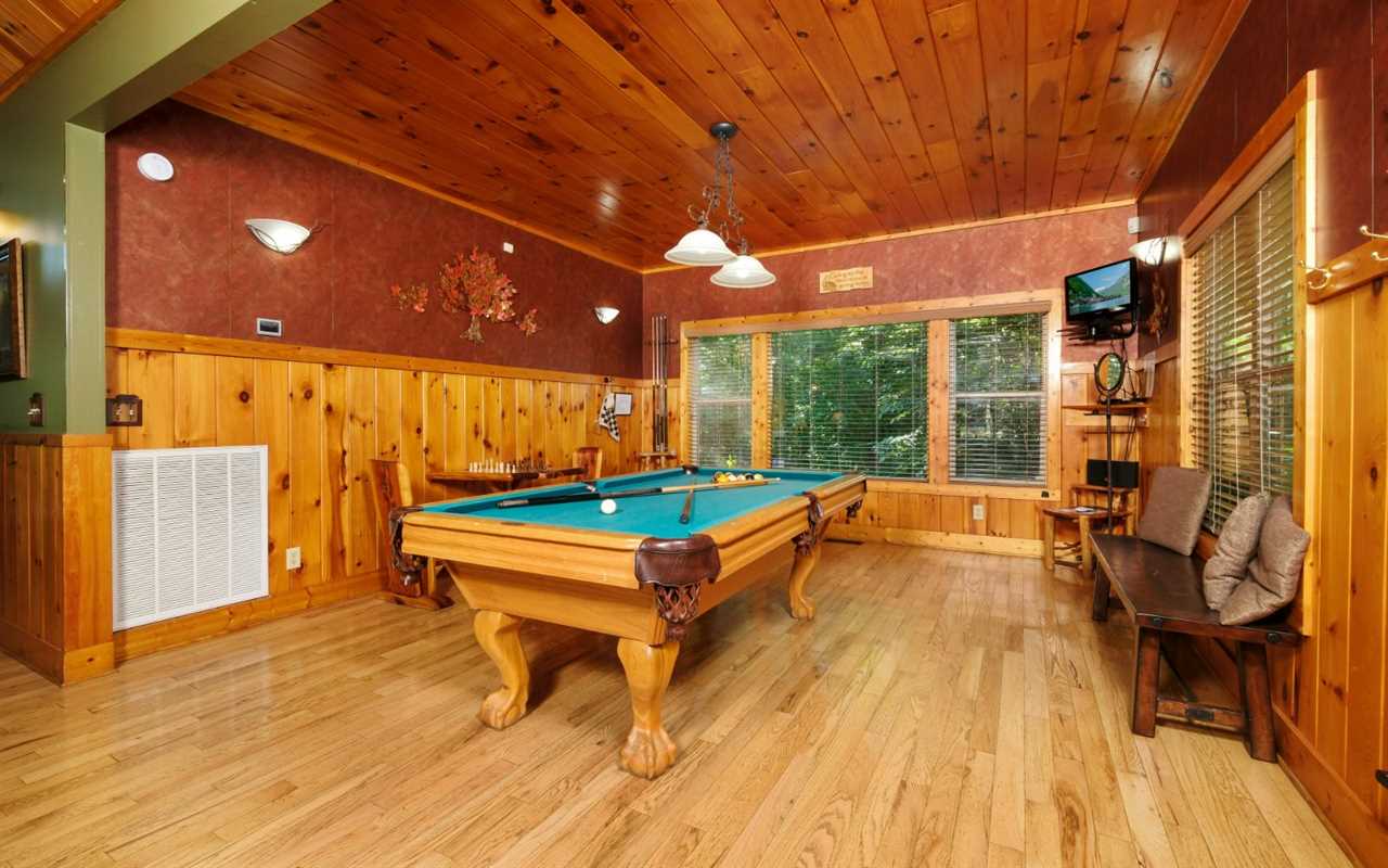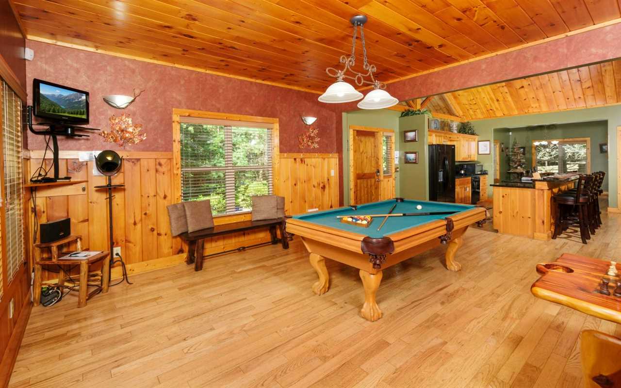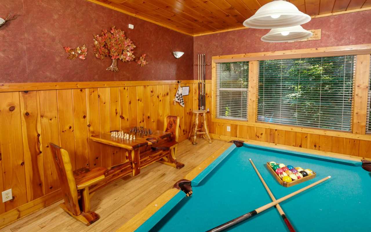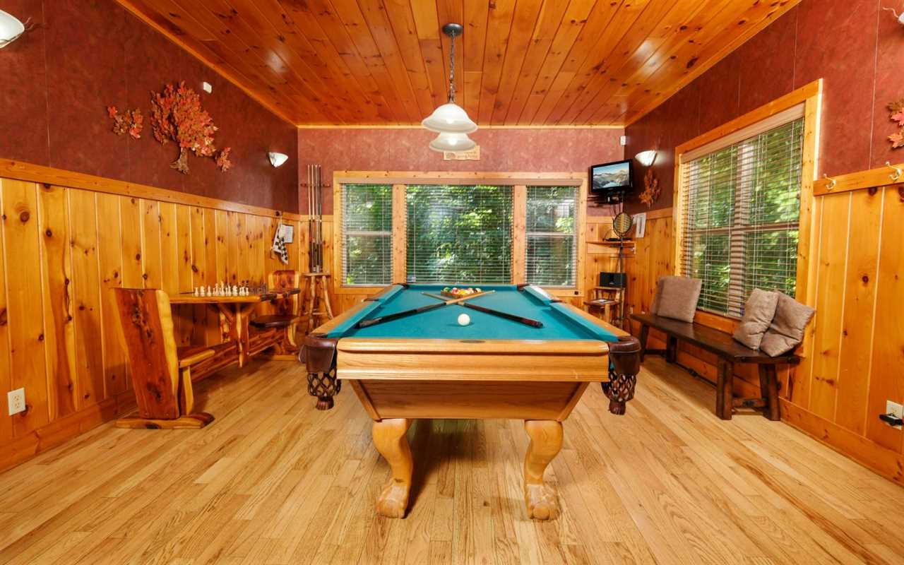 Gorgeous mountain views, relaxing deck spaces, a fenced-in yard, a game room, modern mountain finishes, charming details, a fully equipped kitchen…have it all at Riversong Retreat! This beautiful 2-bedroom, 2-bathroom Gatlinburg cabin rental can sleep up to 4 guests and is outfitted with lots of great amenities for a wonderful stay. Get some fresh air and enjoy the views on your fantastic deck, where you'll have a nice grill, outdoor dining, a TV mounted on the wall, rocking chairs, and a steaming hot tub. There are even tiki torches to light at night! Need a little time to yourself? Head to the front porch to relax on the swing. You'll also have a fenced-in yard for your dog to play in at this pet-friendly cabin. Back inside, get comfortable on the plush leather sofas around the fireplace, turn on the big screen TV, gather around the dining table for meals together, and find all the essentials in the fully equipped kitchen. The game space has a beautiful chess table and a pool table, and you'll also have a washer/dryer, board games, Wi-Fi, king beds, TVs in the bedrooms, keyless entry for self check-in, and decorations during Christmas! Important Pet Information Only Dogs Allowed Restricted Breeds: Pitbull, Rottweiler, German Shepherd, Doberman, Chow, and Husky There is a strict 50-pound weight limit (each) for up to 2 dogs max.