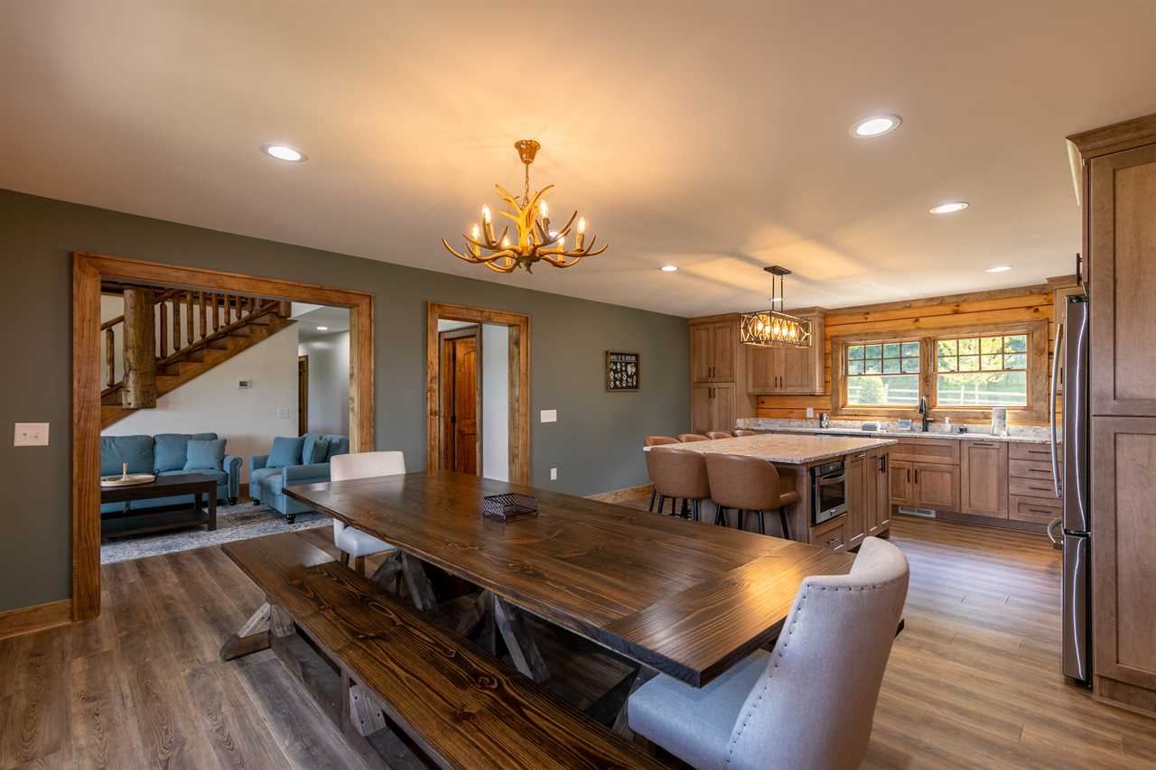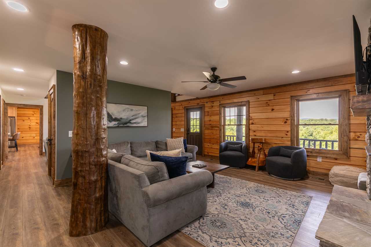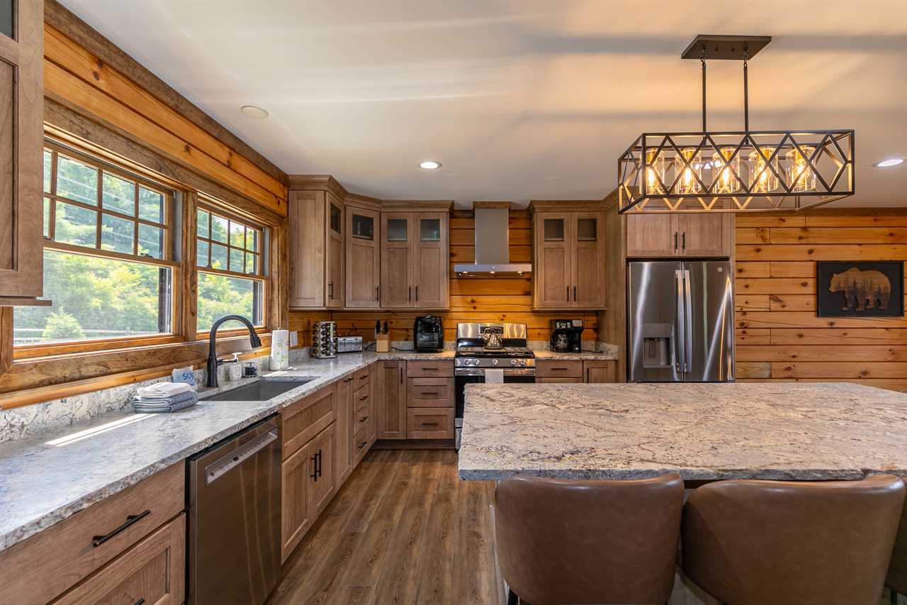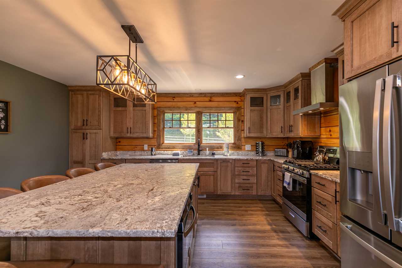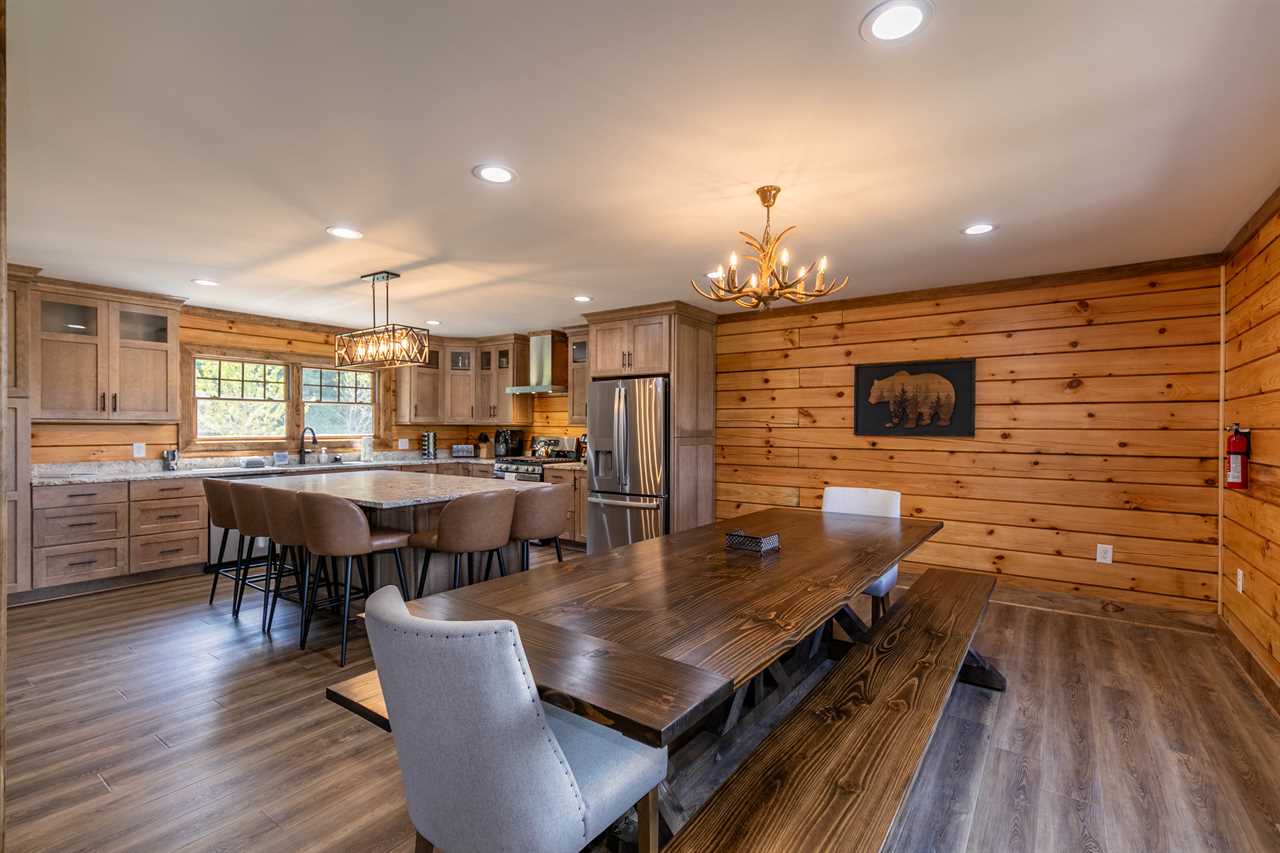 The main level features a unique layout with two areas intended to gather and fellowship with loved ones. Beautifully vaulted ceilings, a log-lined great staircase, gas fireplace with HDTV mounted above, and cozy couches & easy chairs provide plenty of space for everyone. There's room for the entire group to enjoy meals together, between the picnic-style table with Captains chairs and long bench-style seating as well as five leather stools at the oversized kitchen island. And those meals everyone enjoys will be a snap to prepare in the open, airy kitchen offering expansive granite countertops, stainless steel appliances including a French door refrigerator with icemaker and a gas range.