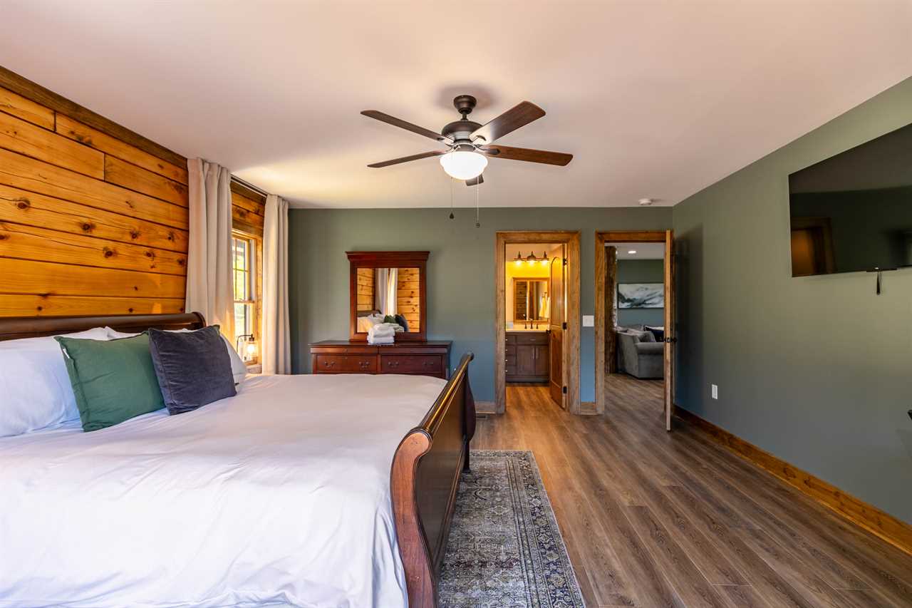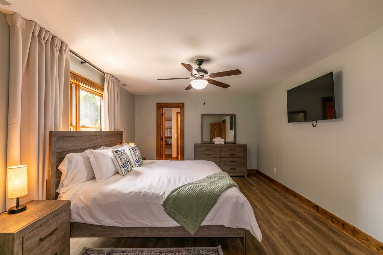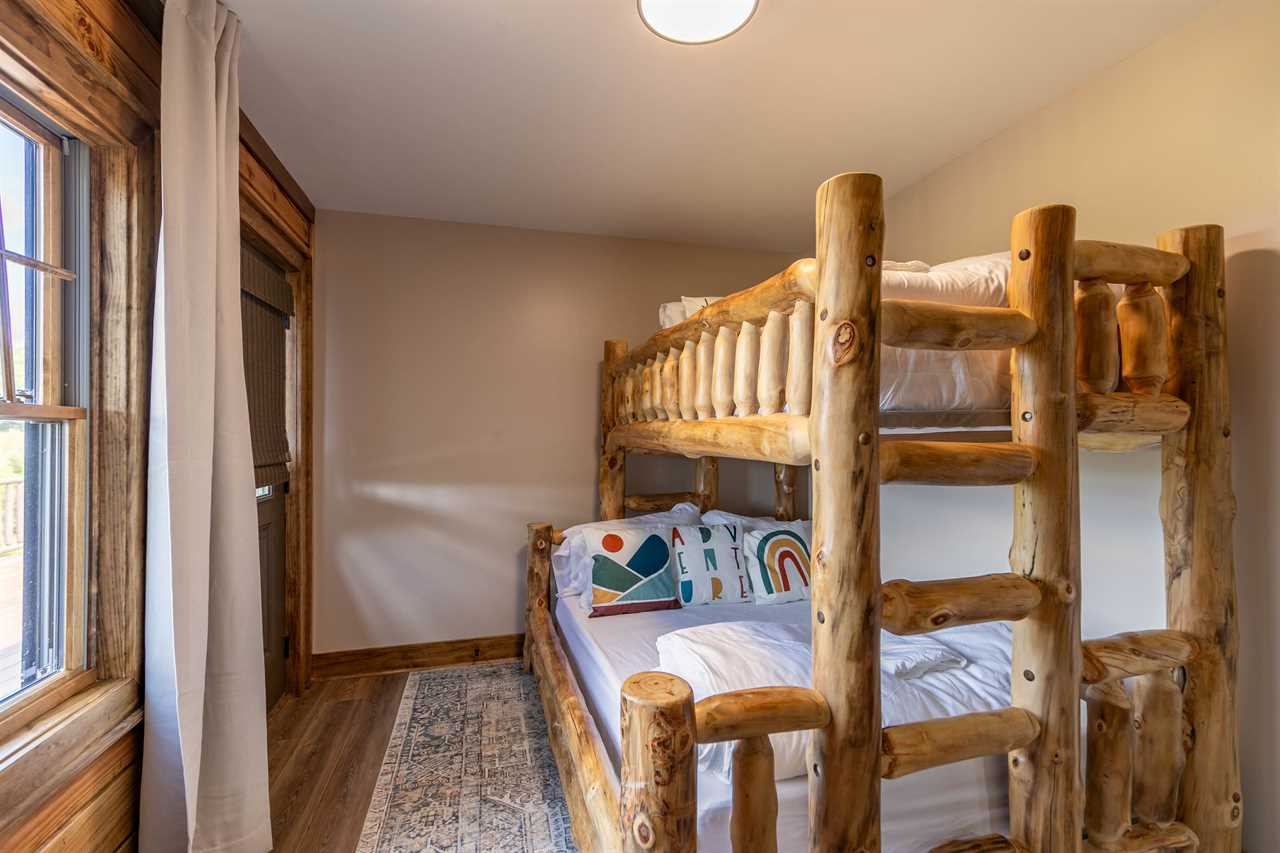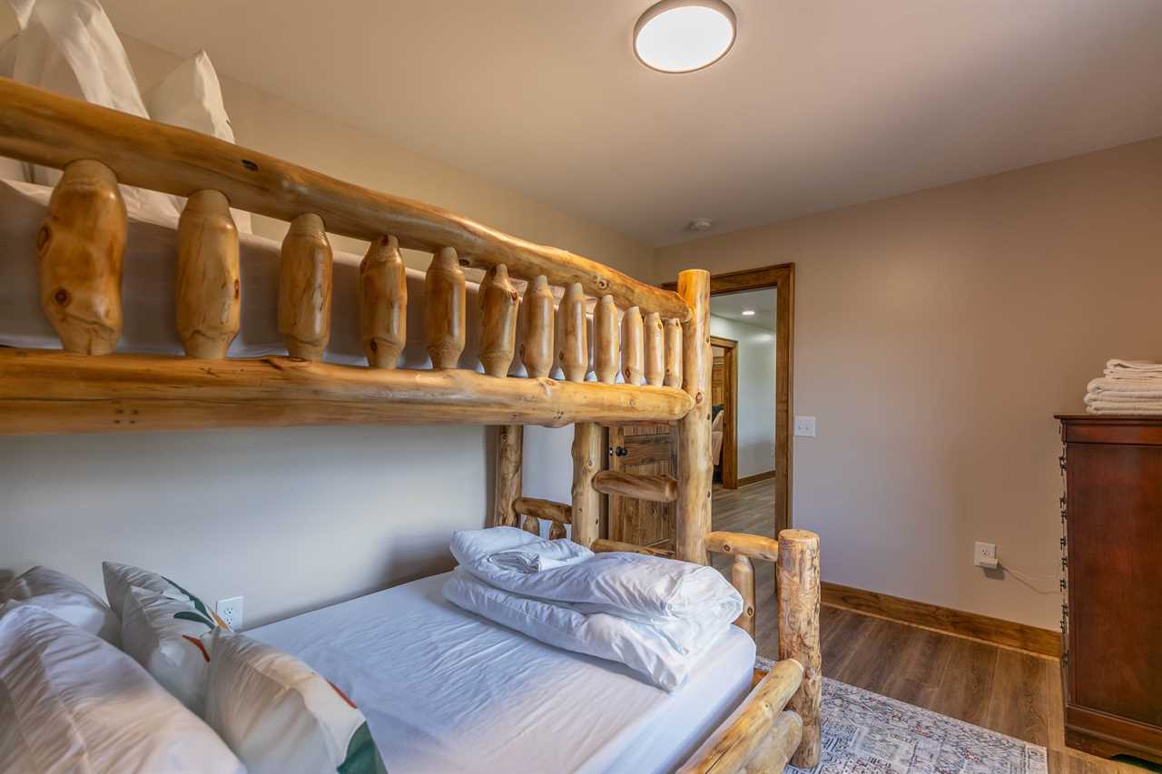 Time for bed? Sweet Serenity offers a total of six sleeping areas. On the main level you'll find a King suite with a little desk & chair, TV, and deck access with its private bath featuring a tub/shower; as well as a Queen bedroom and a Twin/Full bunk bedroom that share a hallway bath with shower. Upstairs the sleeping accommodation is designed to be suitable for a family with multiple kids, as you'll find a second King suite with private bath with shower and separate tub, as well as two more spaces that share a half bathroom. One has two Full beds and the other has a Twin Daybed with Trundle bed.