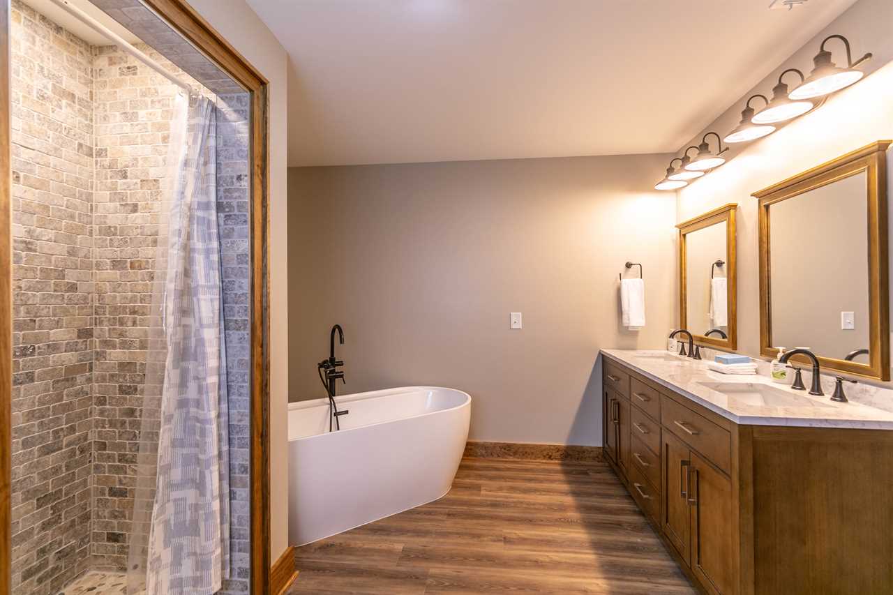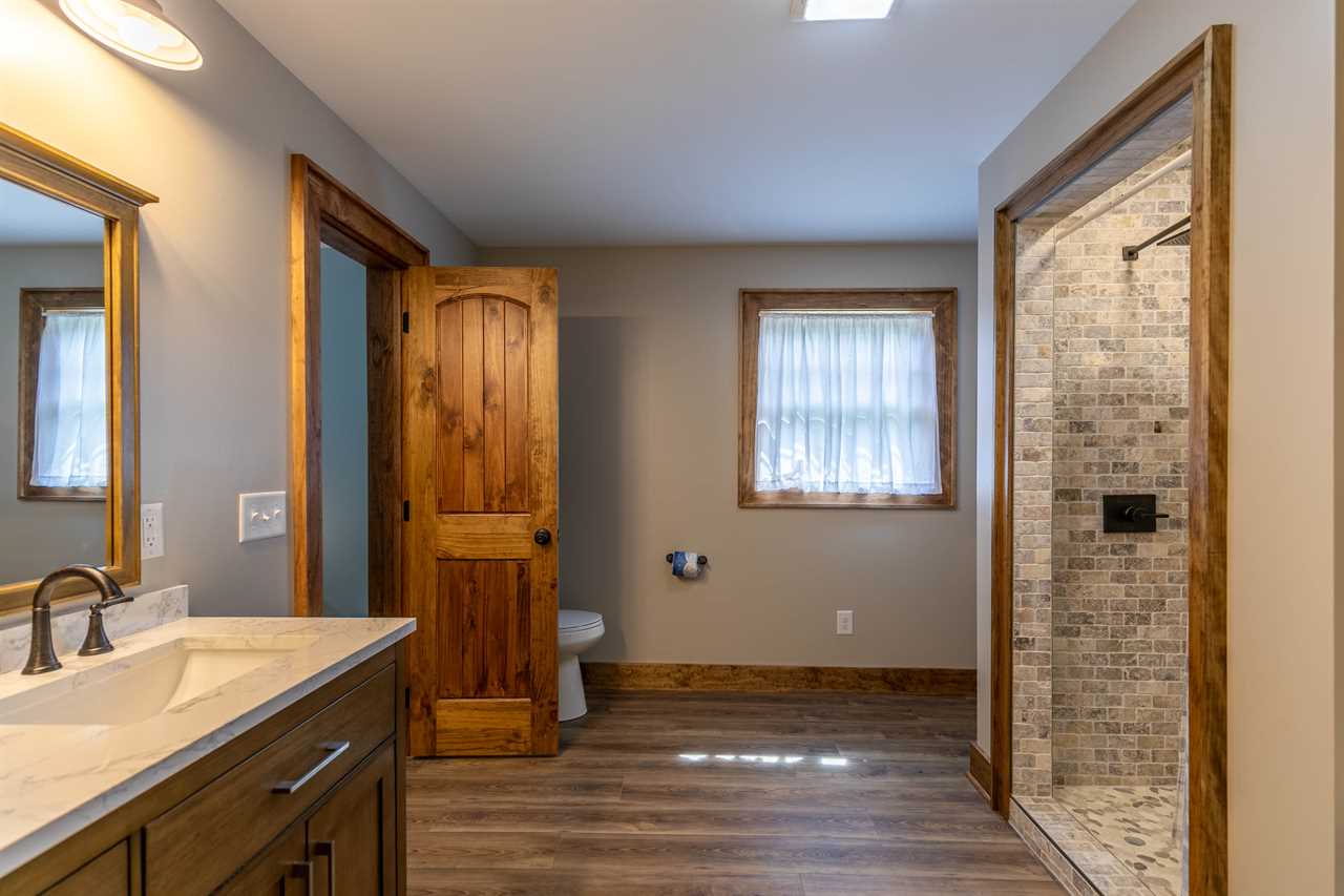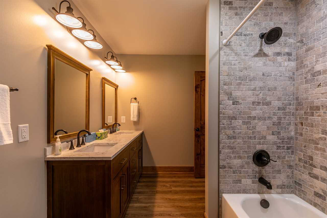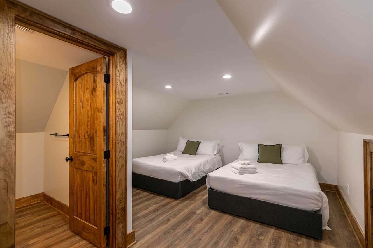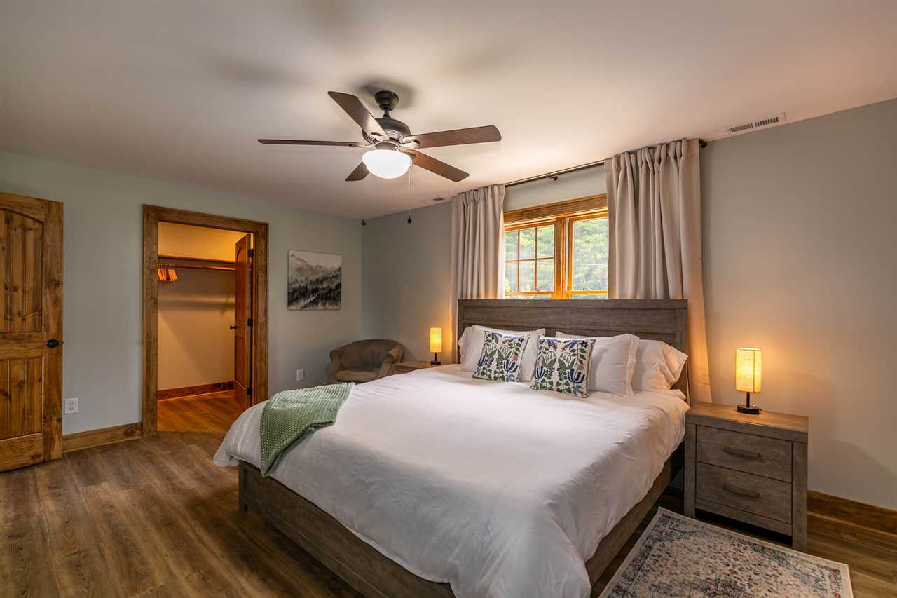 Time for bed? Sweet Serenity offers a total of six sleeping areas. On the main level you'll find a King suite with a little desk & chair, TV, and deck access with its private bath featuring a tub/shower; as well as a Queen bedroom and a Twin/Full bunk bedroom that share a hallway bath with shower. Upstairs the sleeping accommodation is designed to be suitable for a family with multiple kids, as you'll find a second King suite with private bath with shower and separate tub, as well as two more spaces that share a half bathroom. One has two Full beds and the other has a Twin Daybed with Trundle bed.