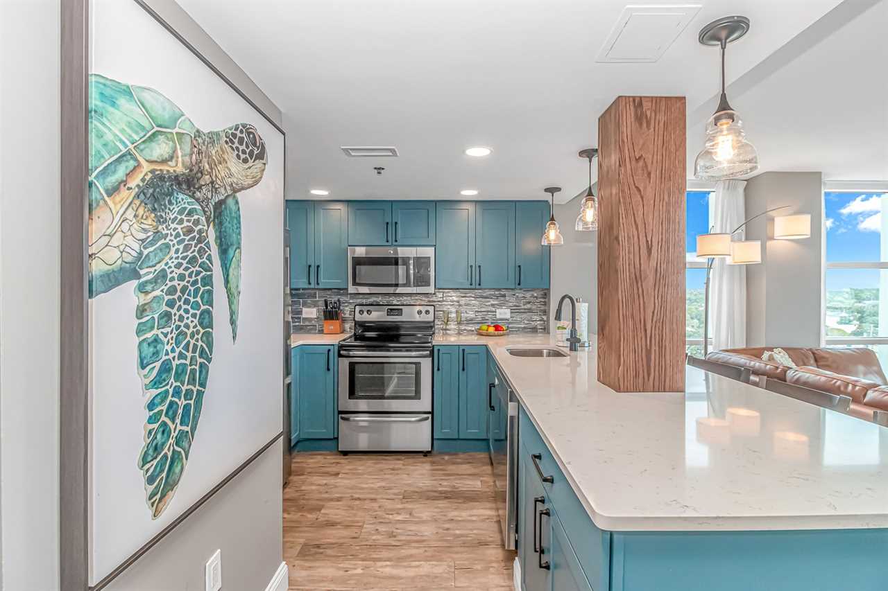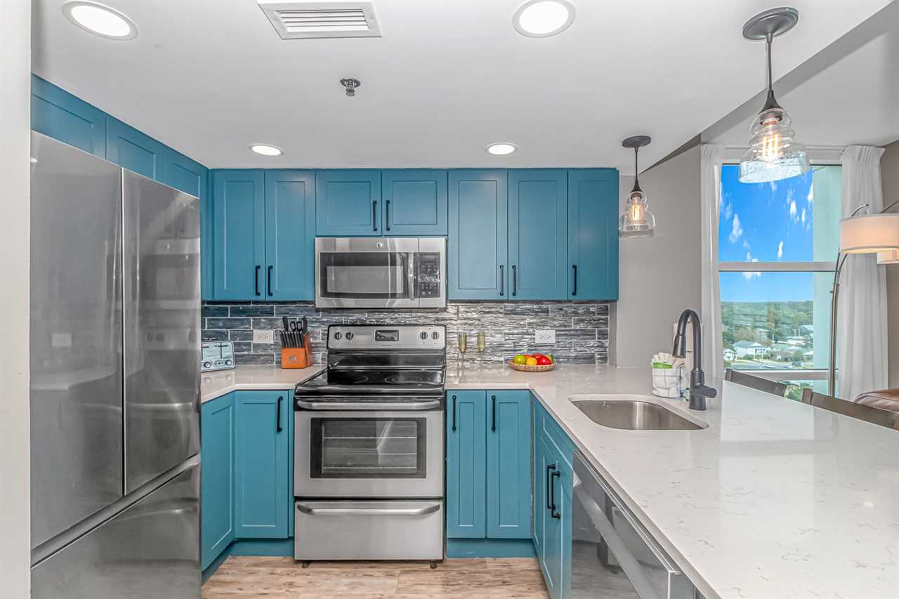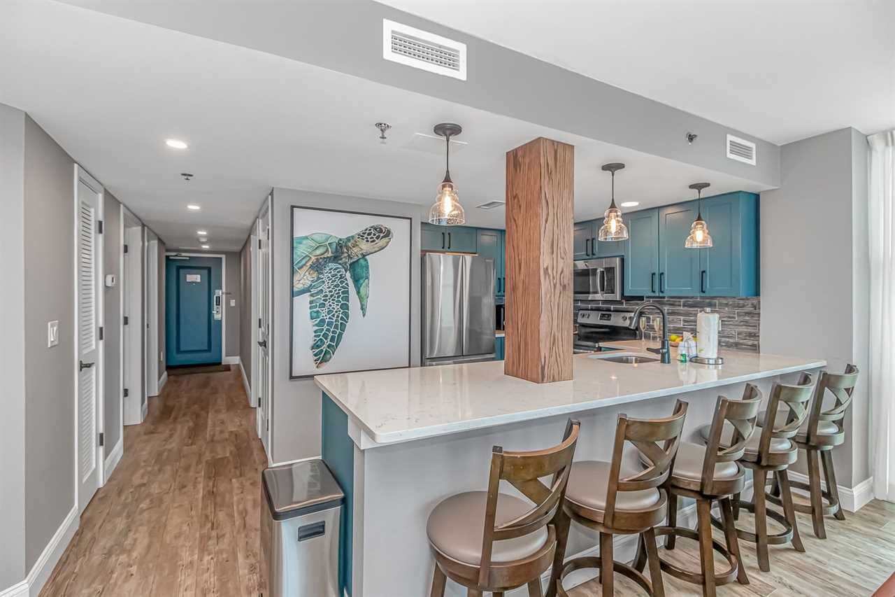 Updated in 2024, this condo offers a fresh and inviting atmosphere. For starters, the entire condo has been repainted with warm, welcoming tones. The condo features brand-new furniture, including a leather, convertible sofa, nightstands, dressers, and both king and queen beds. New curtains, decorative wall art, and updated flooring, add to the appeal. Both bathrooms, showcase new vanity's, sink, and mirror, while the master bath boasts a stunning, custom tiled walk-in shower with a rainfall shower head! The kitchen was completely remodeled with new tile backsplash, beautiful blue cabinets, countertops with bar seating, and stainless-steel appliances.