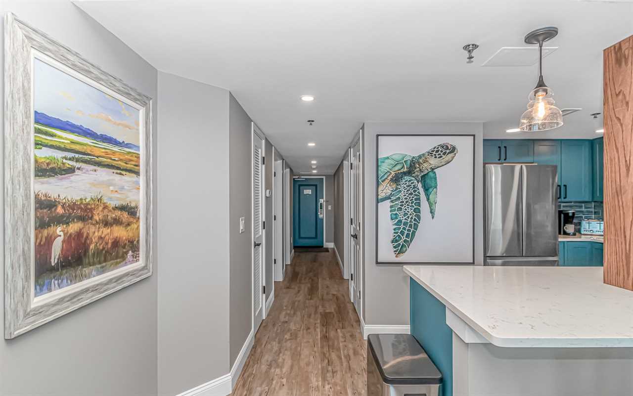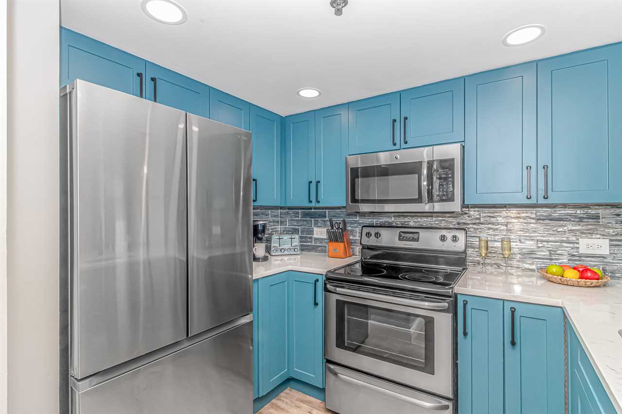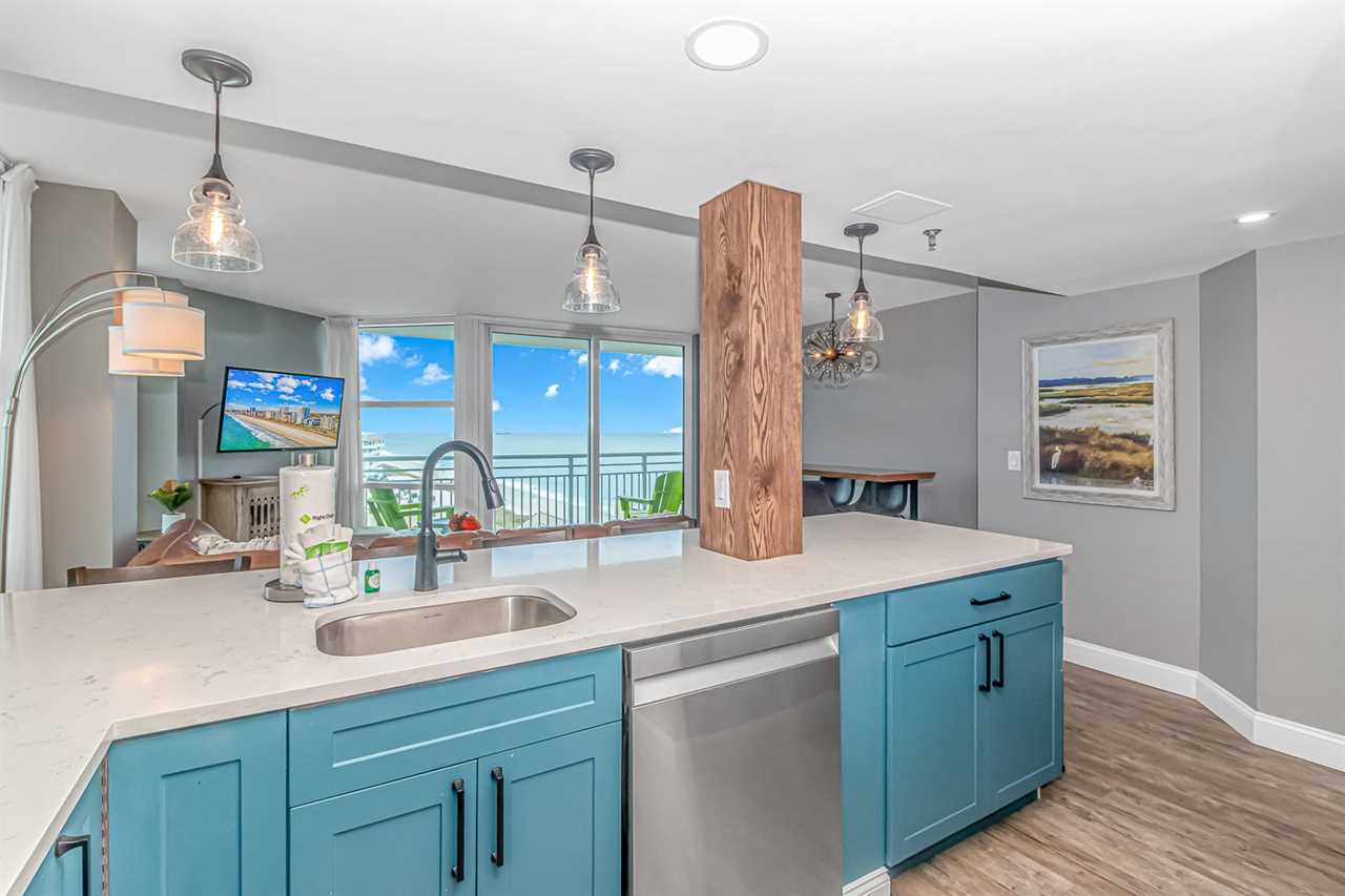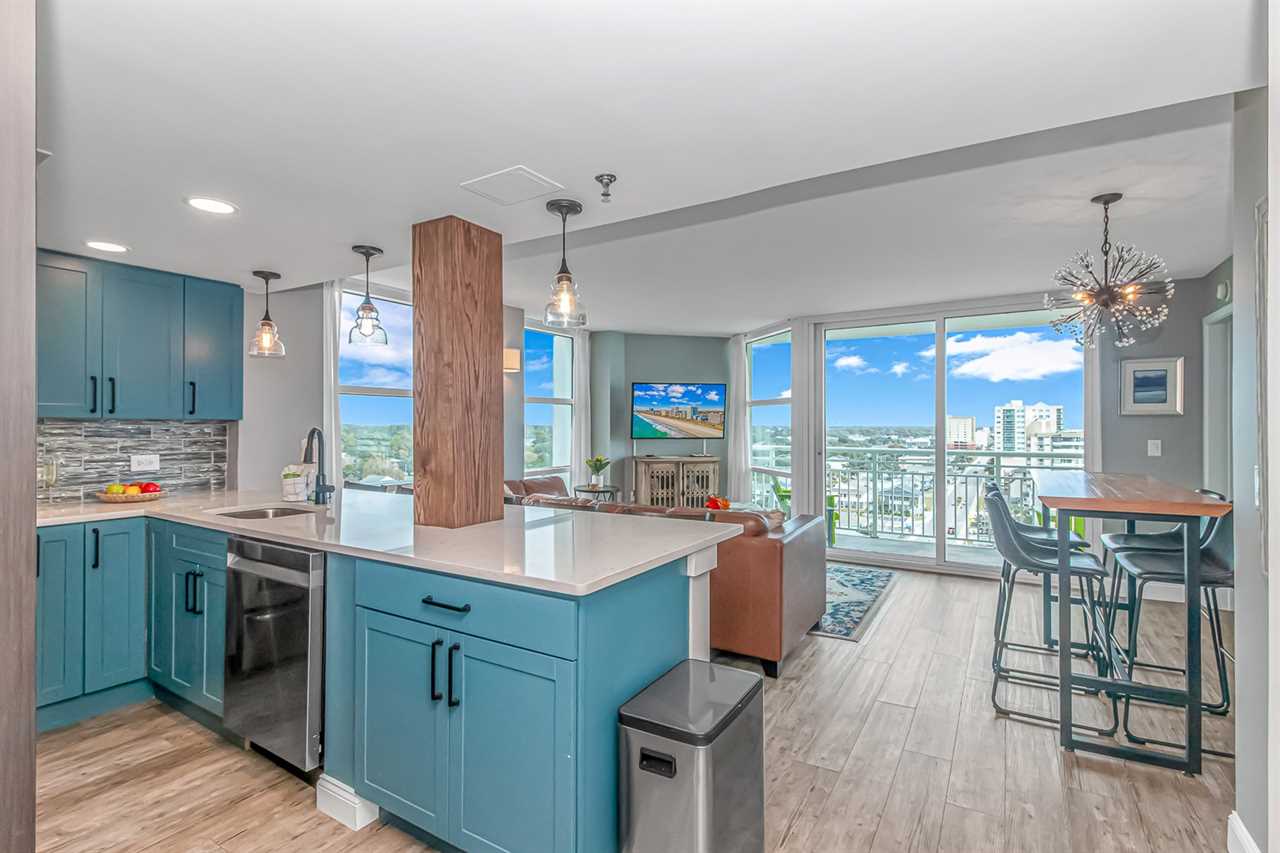 Updated in 2024, this condo offers a fresh and inviting atmosphere. For starters, the entire condo has been repainted with warm, welcoming tones. The condo features brand-new furniture, including a leather, convertible sofa, nightstands, dressers, and both king and queen beds. New curtains, decorative wall art, and updated flooring, add to the appeal. Both bathrooms, showcase new vanity's, sink, and mirror, while the master bath boasts a stunning, custom tiled walk-in shower with a rainfall shower head! The kitchen was completely remodeled with new tile backsplash, beautiful blue cabinets, countertops with bar seating, and stainless-steel appliances.