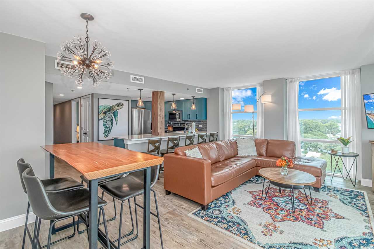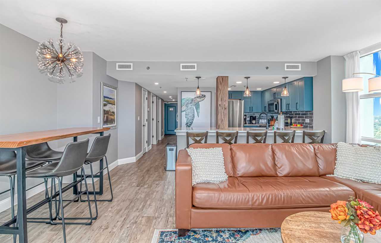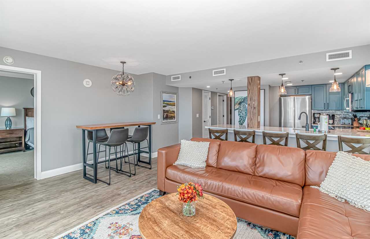 Past the kitchen is the main living area, perfect for unwinding and relaxing. This space features a large, leather couch, side tables, coffee table, large wall-mounted TV, table and chairs for eating, and access to a private balcony with breathtaking ocean views. Guests often spot dolphins and enjoy stunning sunrises and sunsets from here.