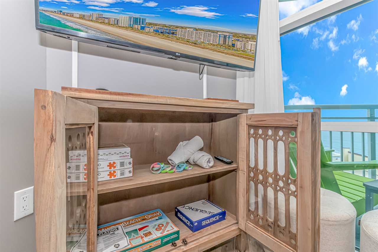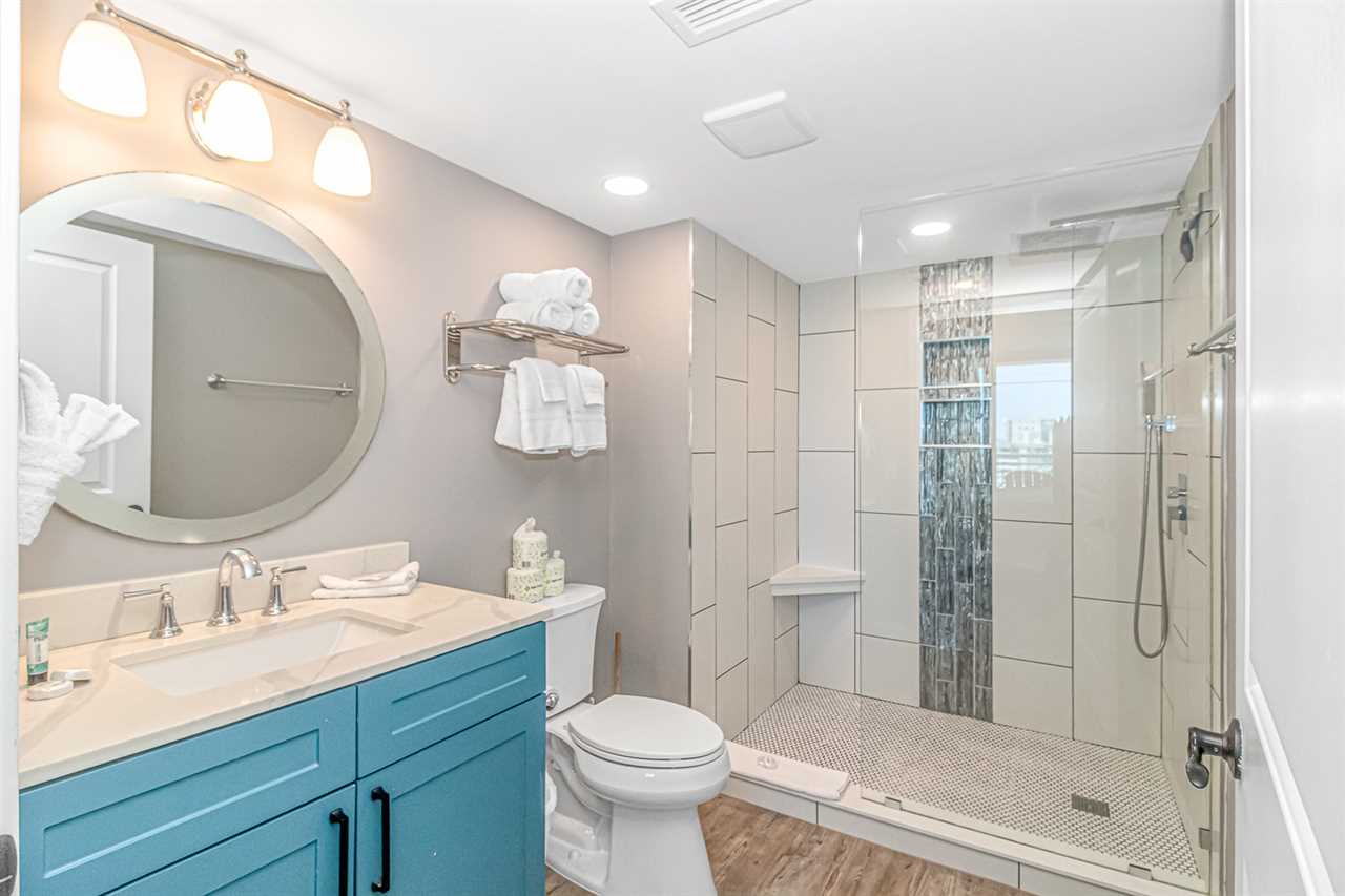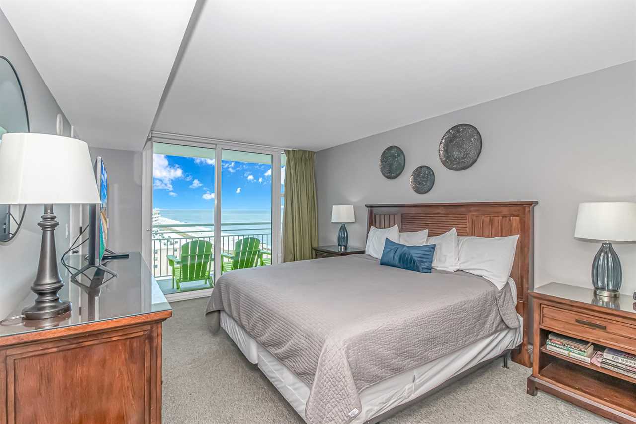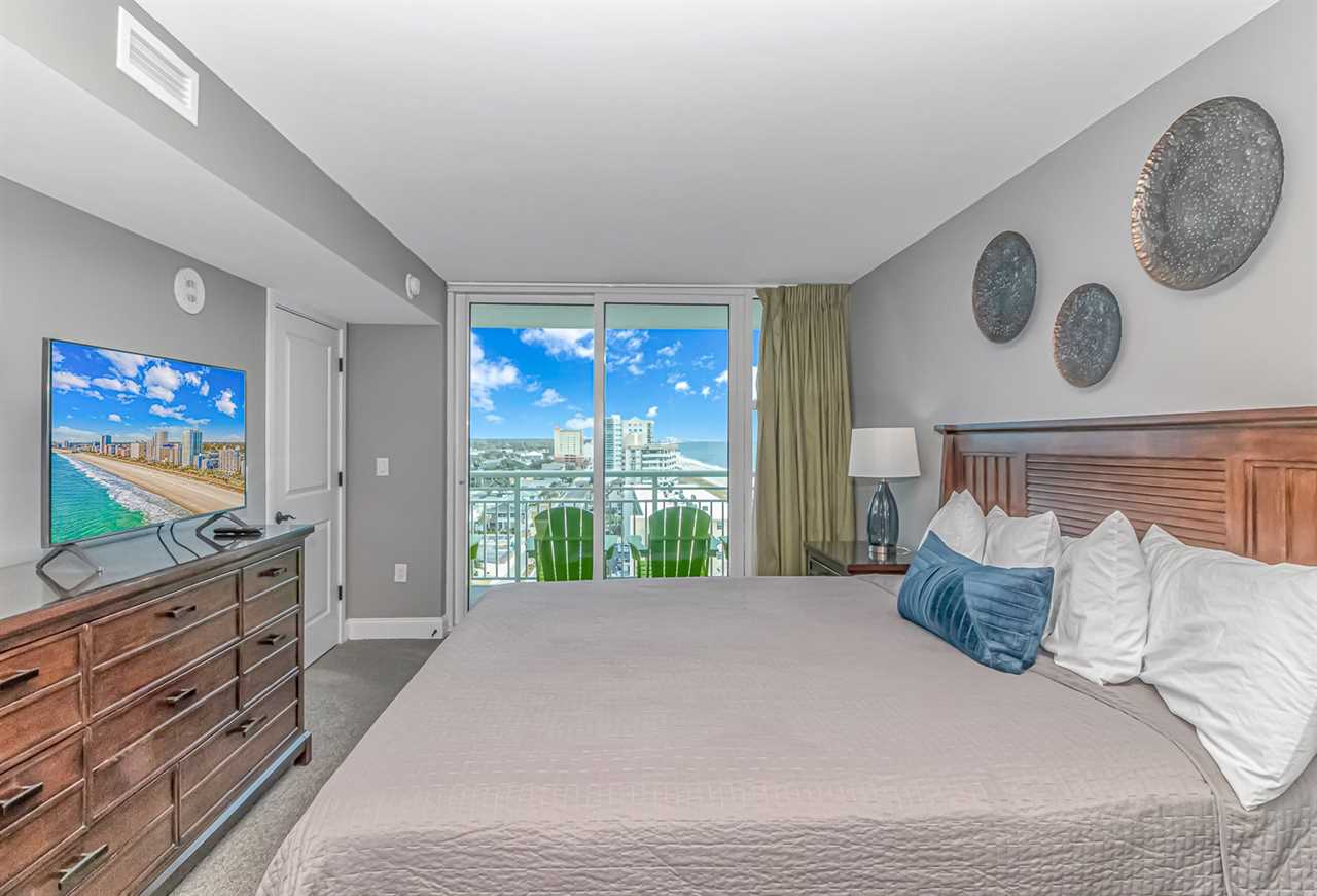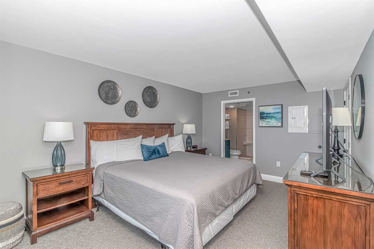 Bedroom 1: This bedroom is considered the master and is located at the very front of the condo off the living room. This bedroom features a king-sized bed, two nightstands, a large dresser and closet for storage, a flatscreen TV, access to the private ocean view balcony, and access to the ensuite bathroom. The bathroom features a stunning walk-in shower with custom tile and a rainfall shower head, vanity, hair dryer, sink, mirror, and toilet.