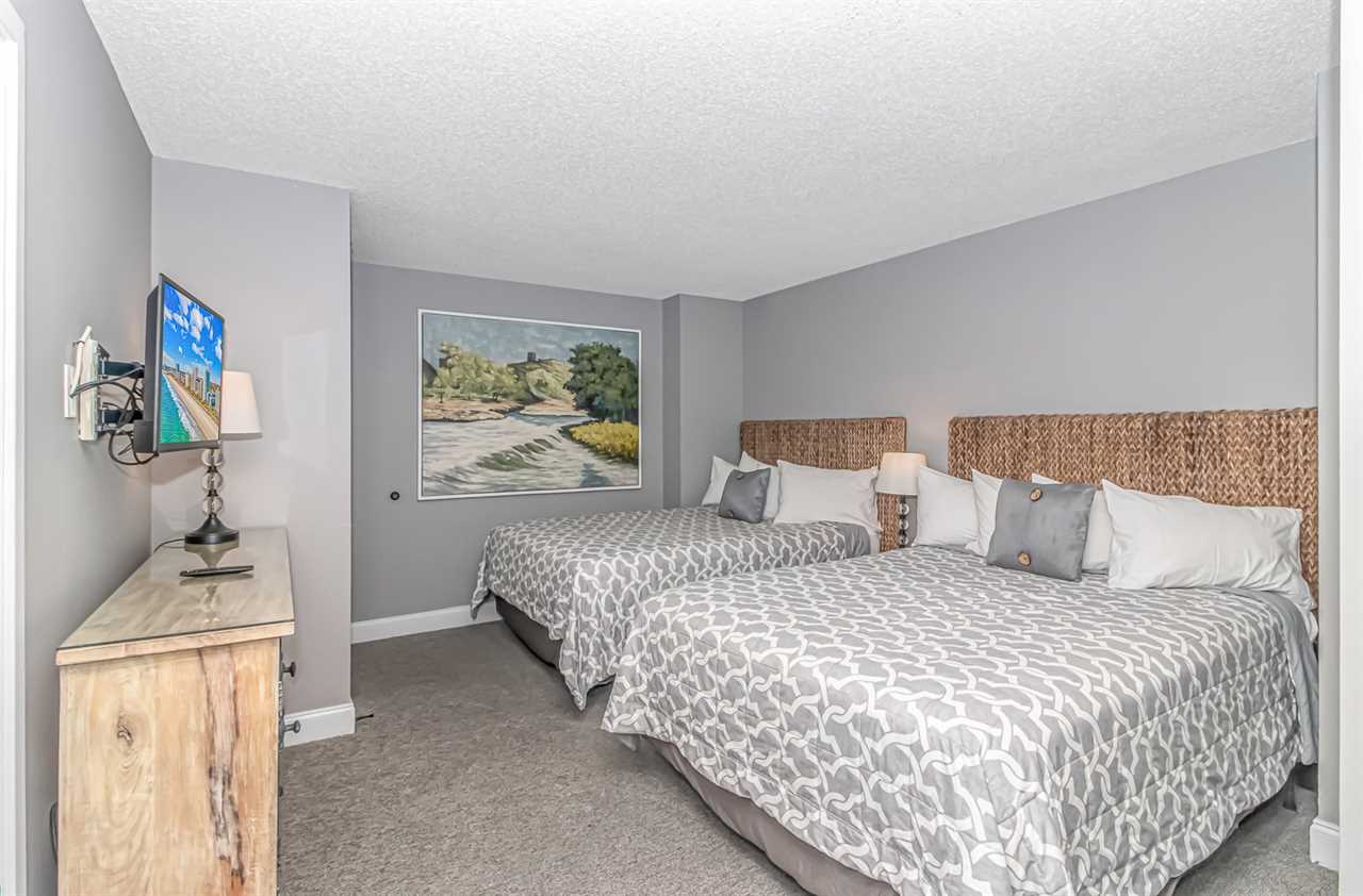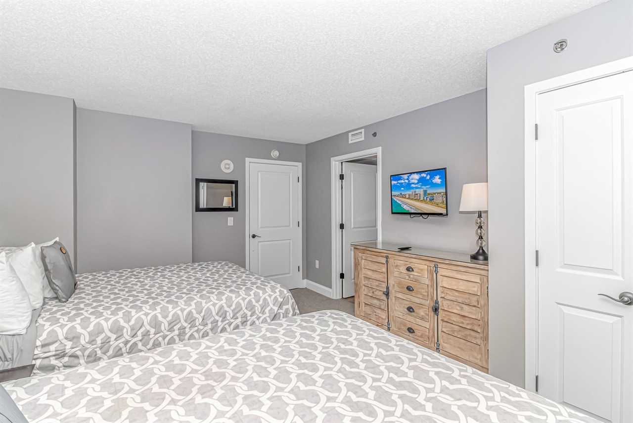 Bedroom 3: This bedroom is considered one of the guest bedrooms and is located down the main hallway upon entry. This bedroom features two queen sized beds, a nightstand, a dresser and closet for storage, and a wall mounted, flat screen TV.