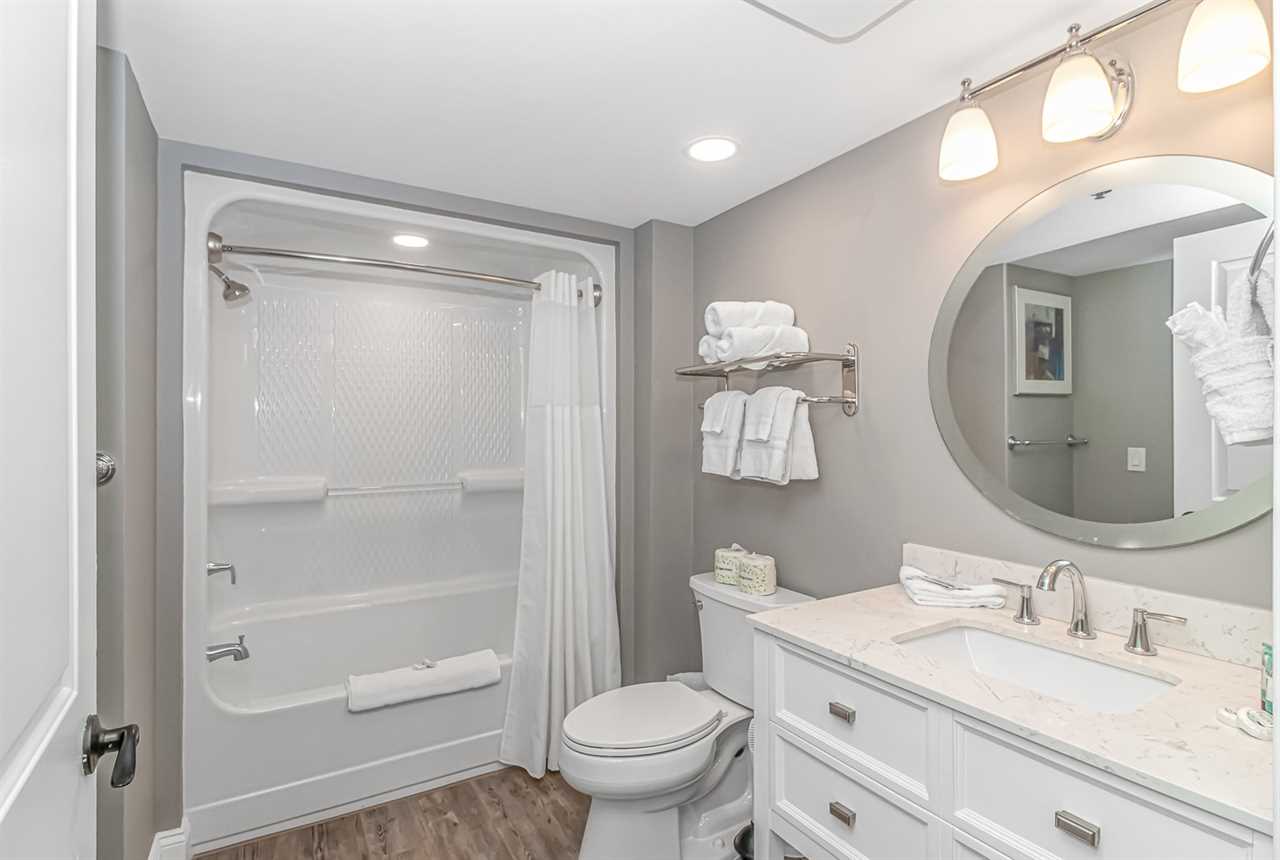 Just down the hall is the second full bathroom that bedrooms 2 and 3 share. This bathroom features a tub/shower combo, vanity, hair dryer, sink, mirror, and toilet.