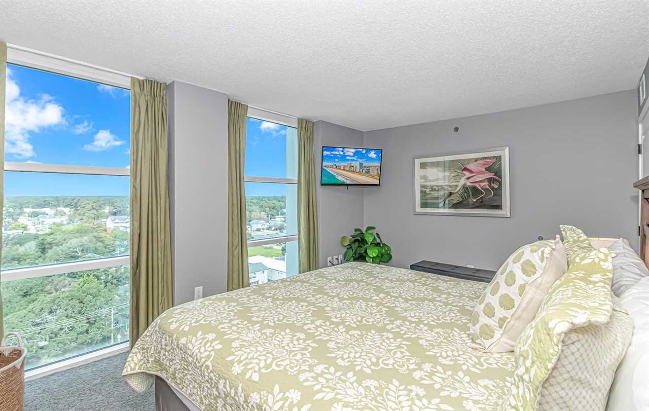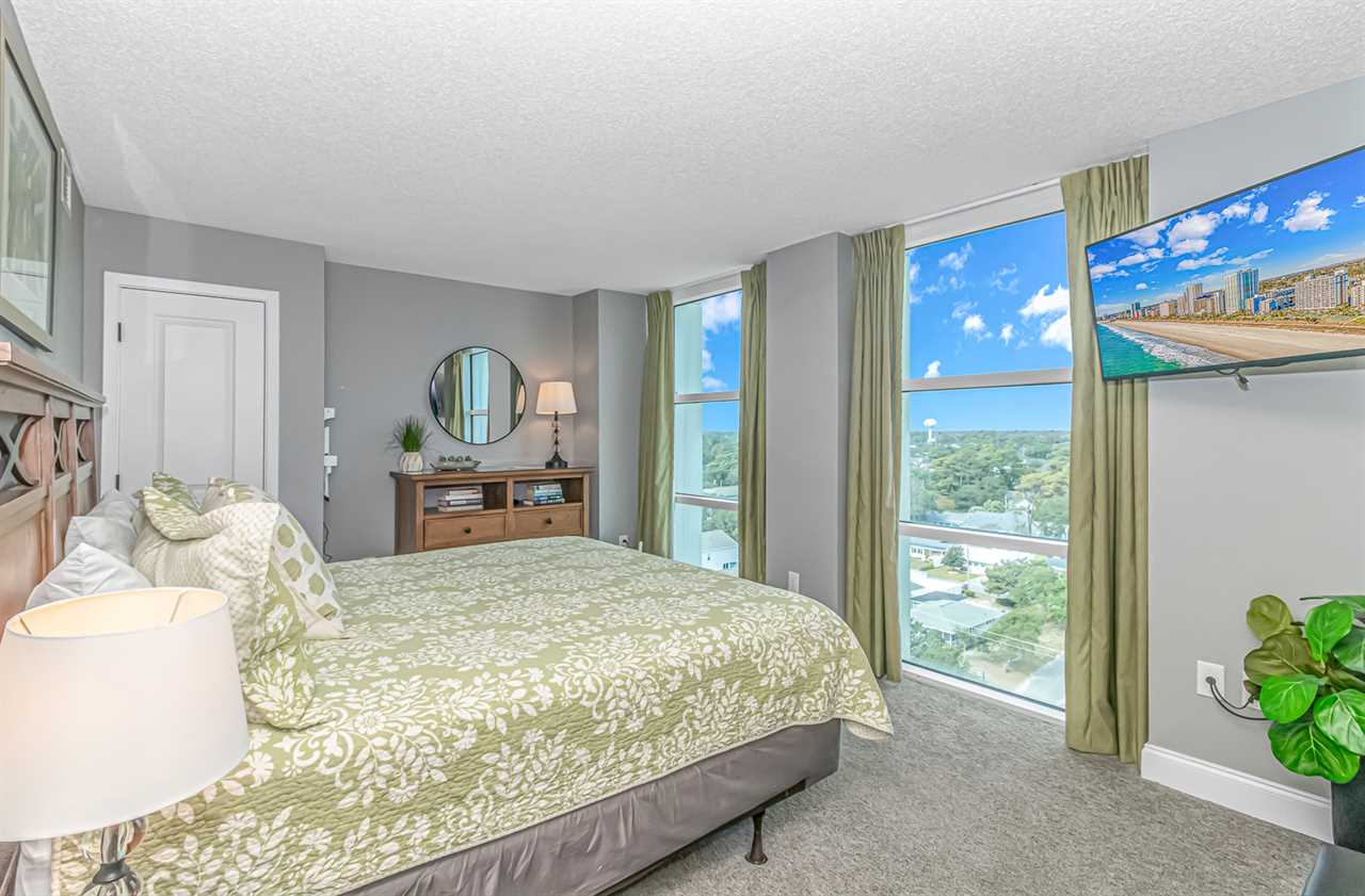 Bedroom 2: This bedroom is considered one of the guest bedrooms and is located down the main hallway upon entry. This bedroom features a king-sized bed, dresser and closet for storage, two ceiling to floor windows for ample natural light, and a wall mounted, flatscreen TV.