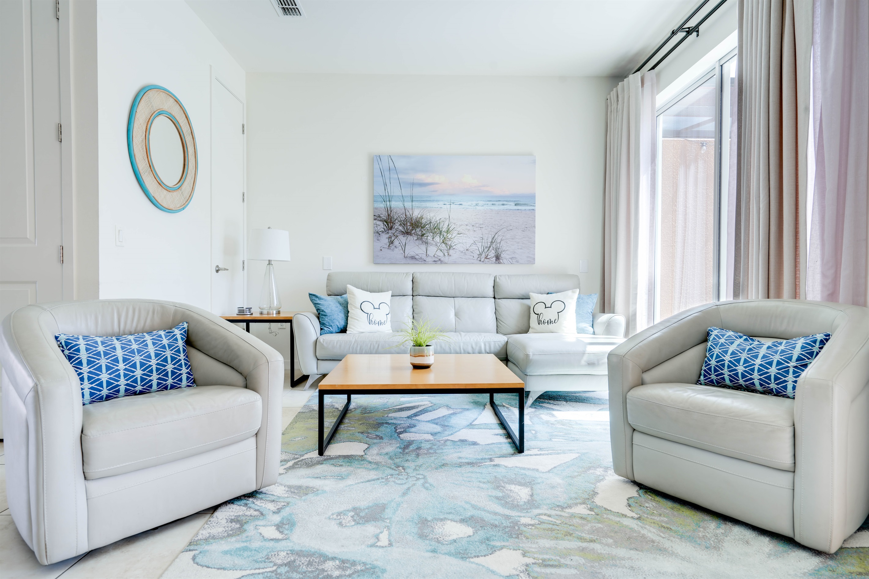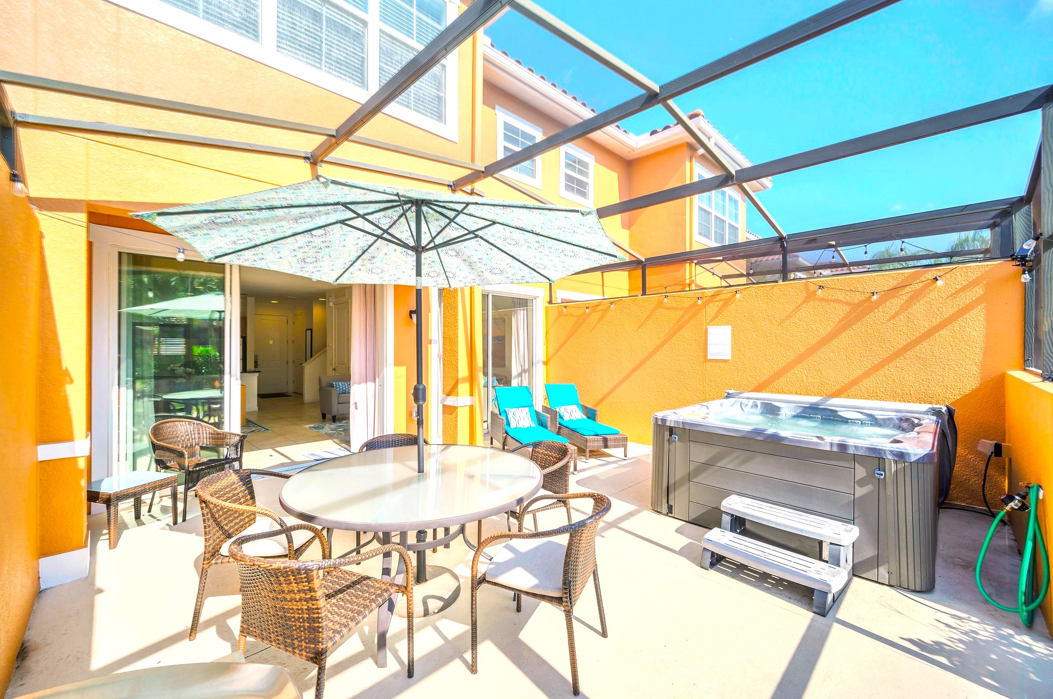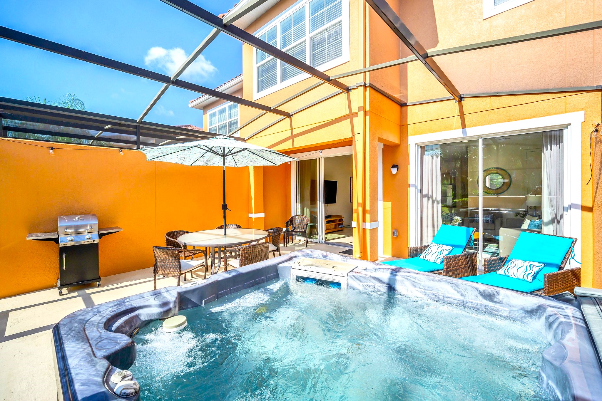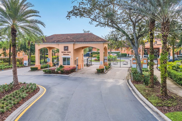 Escape to this charming 2-bedroom, 2-bathroom townhome in the gated Regal Oaks resort community, just minutes from Disney World. This inviting home features a bright, open-concept living space with fresh beach decor, seamlessly blending the dining, living, and kitchen areas. Each bedroom offers its own ensuite bathroom for ultimate comfort and privacy. Step outside to your private lanai, complete with a hot tub and serene courtyard view—perfect for relaxing or dining al fresco. Enjoy the perfect blend of modern convenience and coastal charm in this ideal vacation retreat