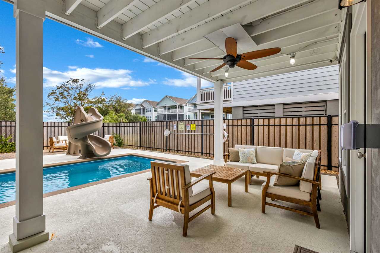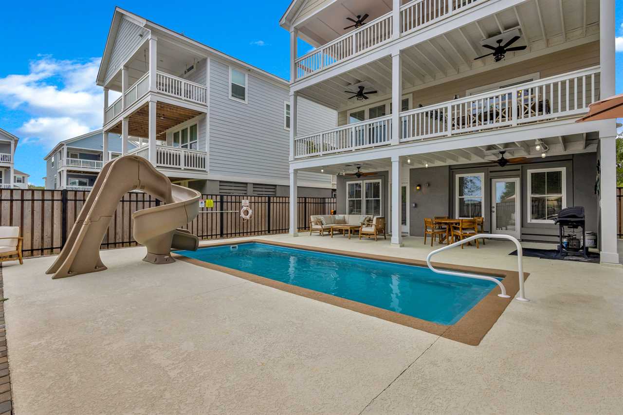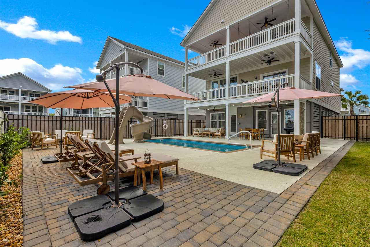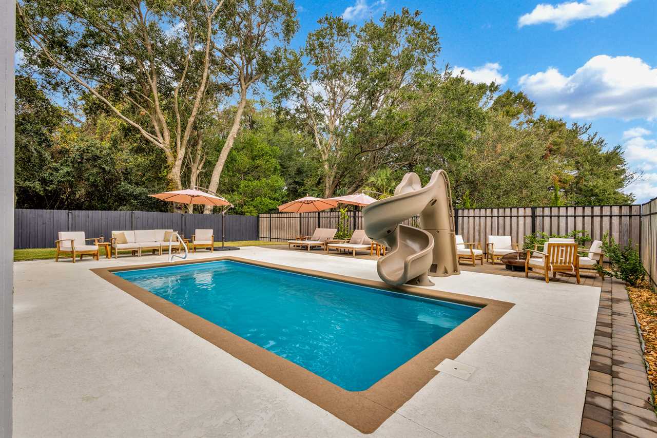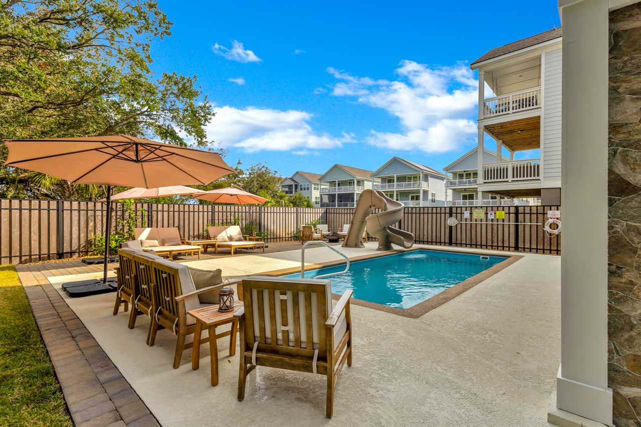 Welcome to Spinner's End located at 6 Talon Court, just a .5 mile walk from Fish Haul Beach with stunning ocean views from multiple decks. This 3,800 sq ft beauty hosts up to 18 guests and welcomes your pet too! Enjoy its unique layout designed for the comfort of a big group, including a fenced yard with a pool, waterslide, and a fire pit. The home is loaded with family-friendly amenities like cinema room, ping pong and more! Book your dream Hilton Head Island getaway with Host Home! ☆☆ HIGHLIGHTS ☆☆ ✹ 6 bedrooms for up to 18 guests: 2 King En-suites + 3 Queen Rooms + 1 Bunk Room with 2 Full over Queen Beds + 1 Queen Sleeper Sofa in the cinema room on 2d floor ✹ Pet-friendly: Bring your furry dog! 1 dog 60lb or less, or 2 dogs where their combined weight does not exceed 100lbs is allowed. There is an additional non-refundable pet fee of $300 for up to 2 dogs ✹ Outdoor Oasis: fenced yard, heated pool with a slide, fire pit, and outdoor furniture ✹ Family-friendly amenities: beach and baby gear, cinema room, ping pong, family room with a wet bar by the pool ✹ Chef s kitchen with high end appliances ✹ Spacious living areas with multiple large deck access and Atlantic ocean views ✹ High-speed Wi-Fi w/ 9 smart TVs in very room and common area ✹ Location: Hammock Breeze Community, historic Mitchelville section, Hilton Head Island. ✹ Beach Access: Just a short .5 mile walk to the peaceful Fish Haul Beach. ✹ Local Attractions: Learn American History at Fort Howell or go Clamming with the fam on Port Royal Sound - all within walking distance! Eager to Read More? Here Are A Few Kind Words From Our Previous Guests: Our family had a great stay at one of the Host Home homes. We loved the welcome basket with snacks, wine, and flowers upon our arrival. The kitchen is stocked with everything needed, the space is roomy and modern, and several beach items like towels, toys, chairs, and a wagon made going to the beach easy. We highly recommend it and hope to come back for another visit soon! Tanner (Other Location) We had amazing communication from Host Home. They were great to deal with answered our questions very promptly. Everything was organized very well organized. I would highly recommend them. Karen (Other Location) Really enjoyed our stay!! Condo is clean and well decorated. Love the beach towels available. Love how helpful and friendly Host and Home was from booking to the end. Would book here and with Host and Home again for sure! Stephanie (Other Location) ☆☆ COASTAL LIVING AT IT S FINEST ☆☆ Located near the historic Mitchellville section of Hilton Head Island, this hidden gem of a home with views of the Port Royal sound is perfect for sunset strolls on a secluded beach, just a 10-minute walk away. This spacious residence extends its charm beyond its interiors. Surrounding porches offer cozy spots for socializing, diving into a good book, or simply enjoying the Lowcountry breezes and ocean views. ☆☆ LIVING AREA ☆☆ Ground floor features a spacious Family Room off the pool deck, complemented with a full-sized refrigerator in kitchenette. It also boasts a sleeper sofa for extra guests or movie nights together, and hall bathroom with walk-in shower. On the 1st floor, discover a sanctuary with a newly appointed kitchen featuring state-of-the-art appliances and ample pantry storage, perfect for entertaining a big group. The spacious living room, complete with a smart TV, is ideal for movie nights, while the adjoined porch provides ample seating for outdoor gatherings. If it s not enough, the 2d floor offers another living room with oversized TV and upper deck access offering stunning ocean views. It is decorated as a cinema room and would be a perfect place to entertain your kids. Just imagine yourself chilling on large porch swings with a beverage of your choice after a day full of island fun. What a life! Ground Floor: ✓ Family room off pool deck with sectional sofa ✓ Full sized refrigerator in kitchenette with sink off pool deck ✓ Smart TV ✓ Garage with ping-pong table and beach gear First Floor: ✓ Indoor-Outdoor concept with large windows that flood the space with natural light ✓ Kitchen and Dining areas ✓ Comfortable furniture with Smart TV for catching a game ✓ Deck with additional dining area, comfortable outdoor furniture and ocean views Second Floor: ✓ Cinema Room with extra large TV ✓ 2 Sleeper Sofas in the cinema room ✓ Covered deck with 2 large porch swings and wicker furniture overlooking Atlantic Ocean ✓ Fully equipped laundry room for the comforts of home ✓ Hall bathroom with tub/shower combo ☆☆ OUTDOOR PRIVATE OASIS From the Family Room on the ground floor, step outside onto the private oasis overlooking the shimmering pool, adorned with comfortable seating, lounge chairs and outdoor shower perfect for relaxation and leisure. Fenced yard with plenty of outdoor furniture is an ideal place to play gather with your loved ones and let your fido roam off leash. ✓ Private heated 10 x 25 , 5 deep pool (fees apply, see below) ✓ Pool slide ✓ 2 double lounge chairs ✓ Covered deck with outdoor seating and plenty of outdoor furniture throughout ✓ Fire Pit ✓ Propane grill station ☆☆ KITCHEN AND DINING ☆☆ At the heart of the home lies a chef s kitchen, featuring top-of-the-line appliances like 6-burner gas range and double oven. Its open-plan layout transforms mealtime into a joyous occasion, offering ample seating at the island and adjacent dining tables. Perfect for shared moments and lively conversations, it creates an inviting atmosphere for gatherings and dining experiences. ✓ Brand new stainless appliances and granite countertops ✓ Everything necessary to cook and serve most meals ✓ Dripping and Keurig coffee makers ✓ Dining table seats up to 10 ✓ Kitchen island with additional 6 seats ✓ Outdoor dining area with seating for 6 ☆☆ BEDROOMS BATHROOMS ☆☆ Gorgeous Primary bedroom adorne