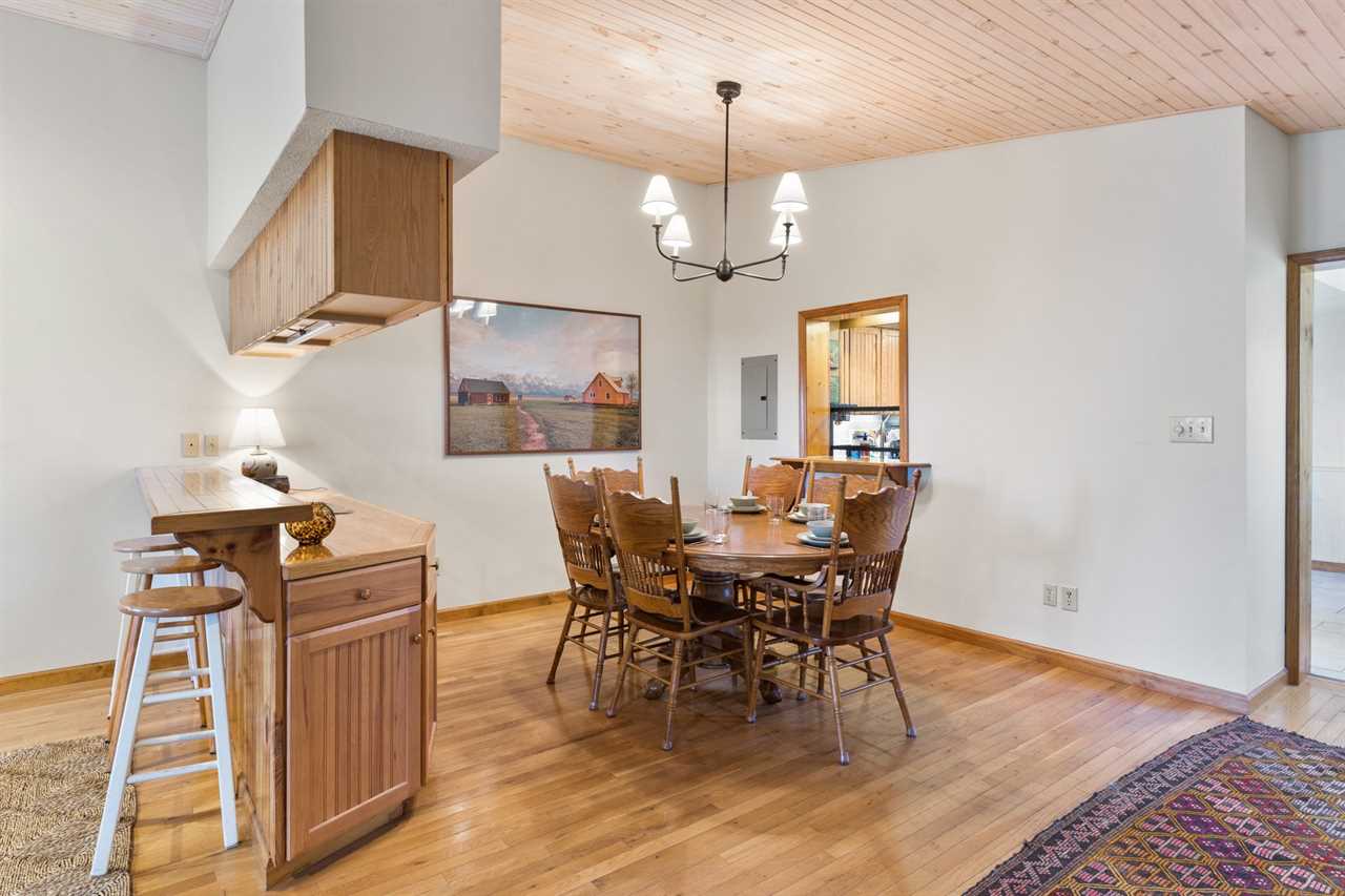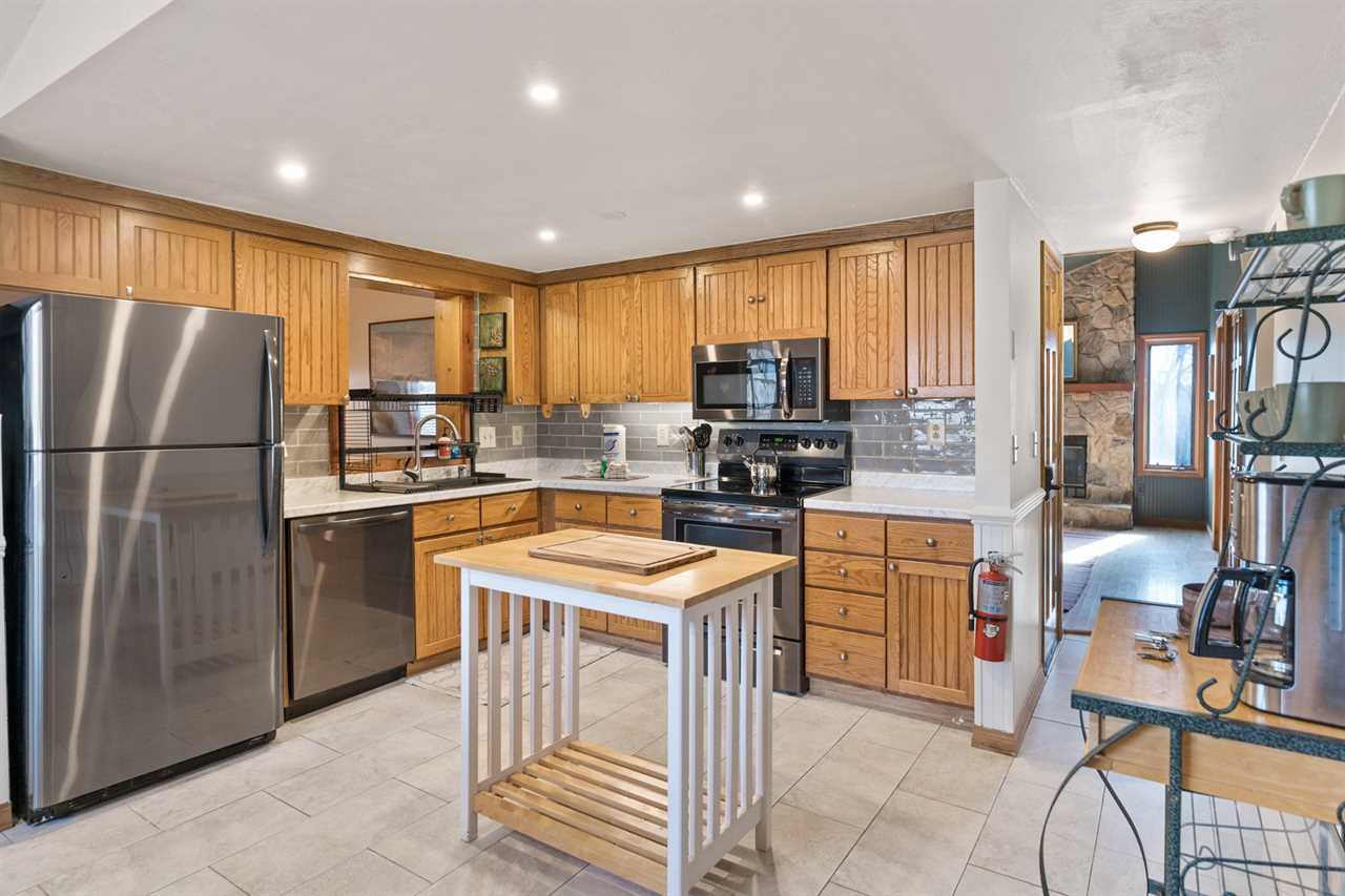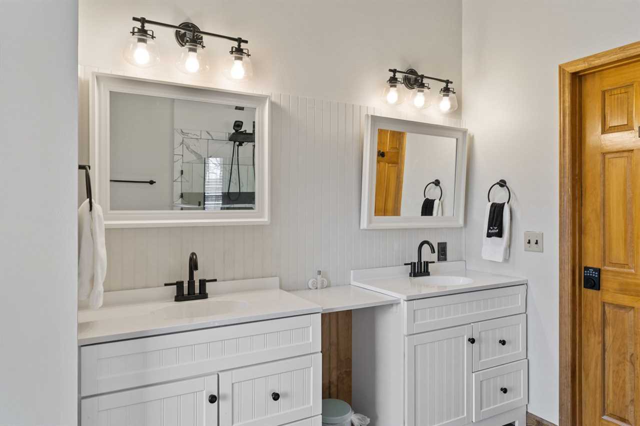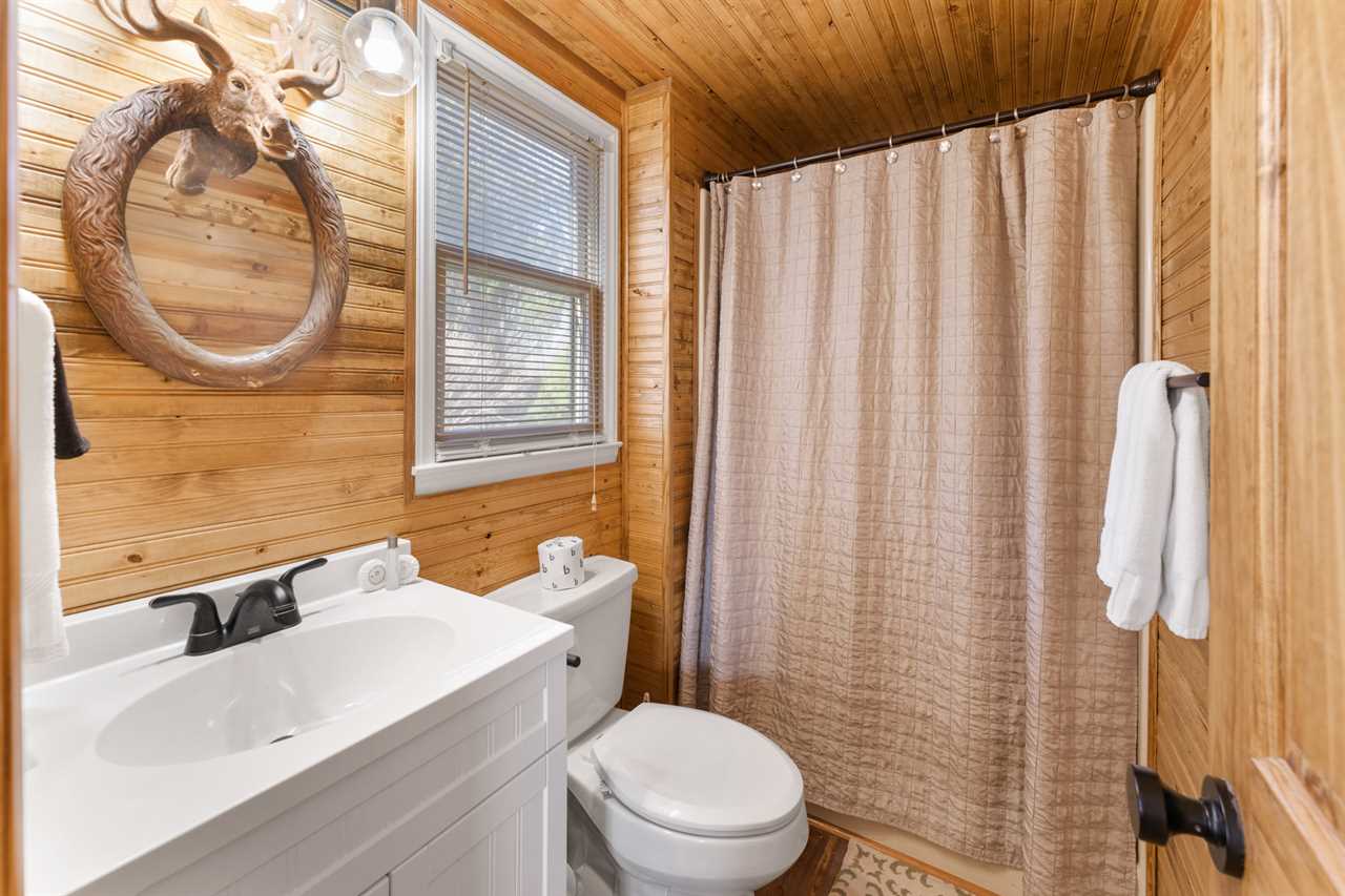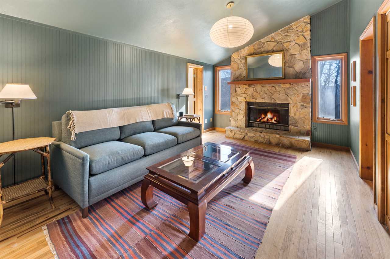 The Wydown House offers one-level living with mountain views and an abundance of natural sunlight. Enter the cabin through the mud room, allows for a convenient place to hang coats, and keep shoes and adventure gear. The living room features comfortable furniture to sit back and enjoy the stacked stone gas fireplace and big screen TV. The well equipped kitchen includes updated appliances, a coffee bar and a nook with a kitchen table. The pass through window from the kitchen makes it easy to bring the dining room and kitchen together.