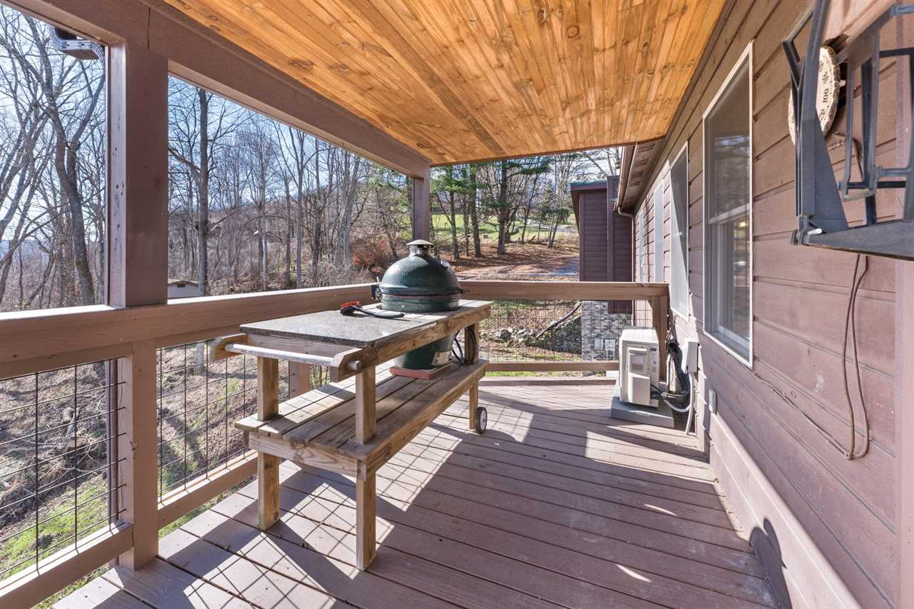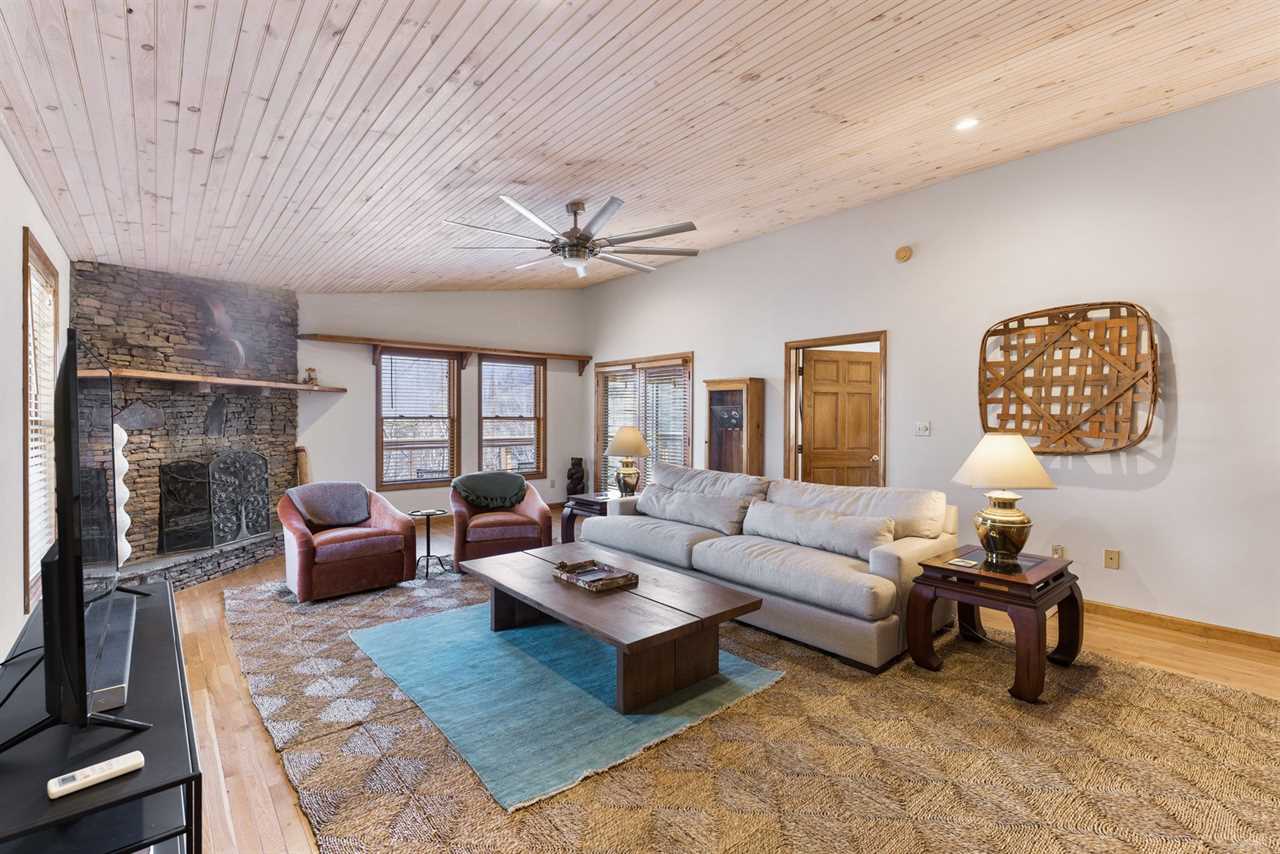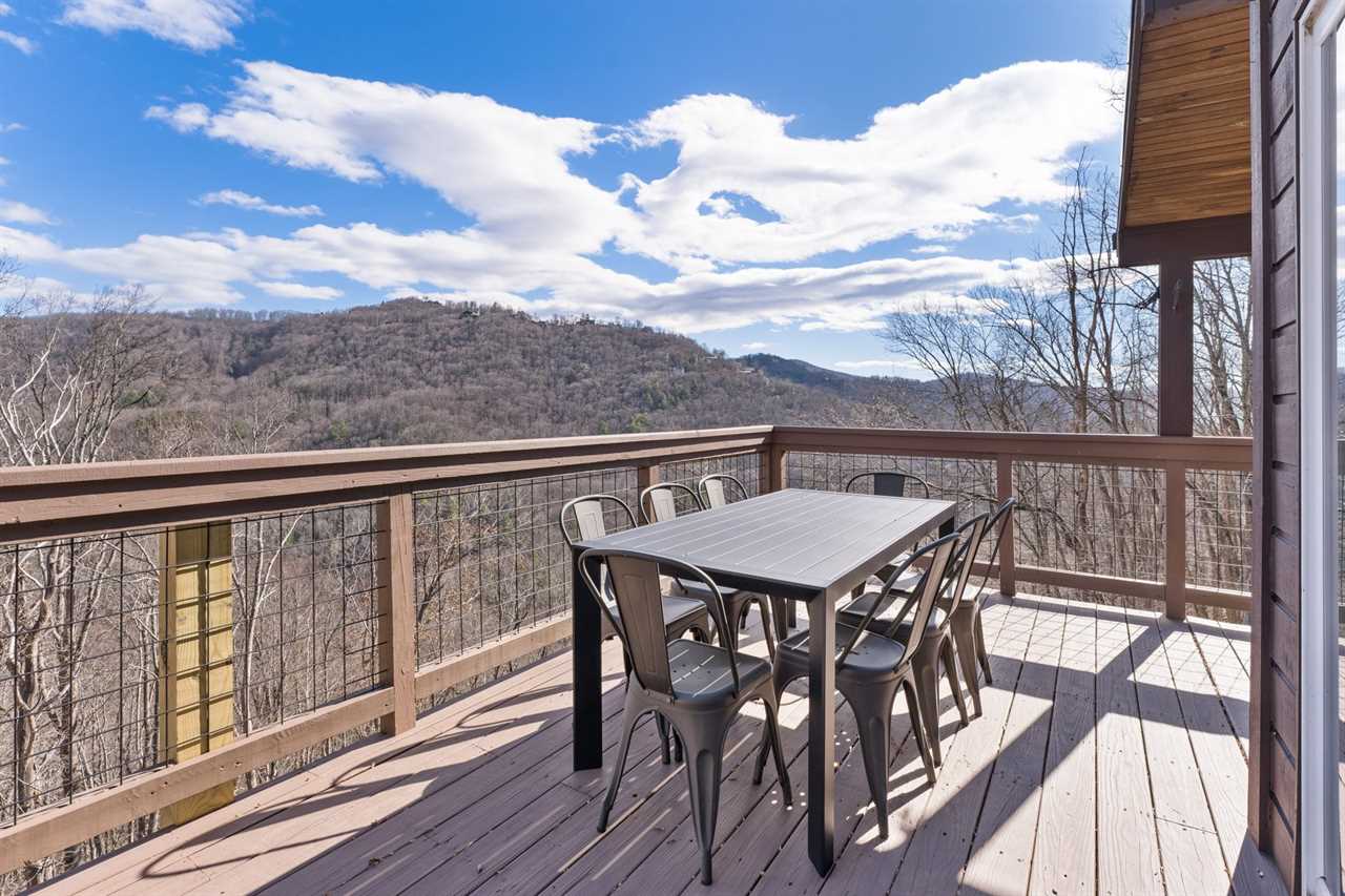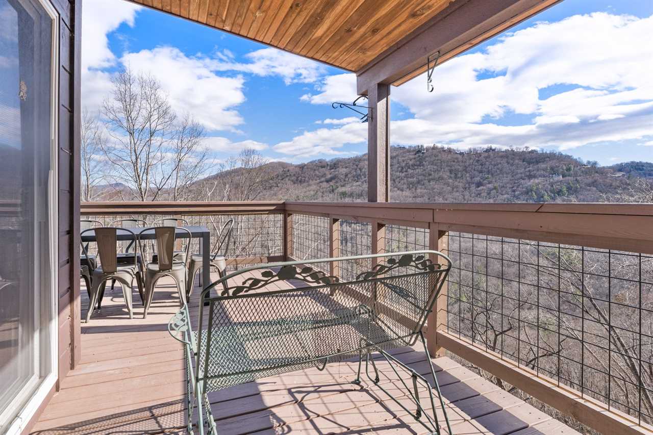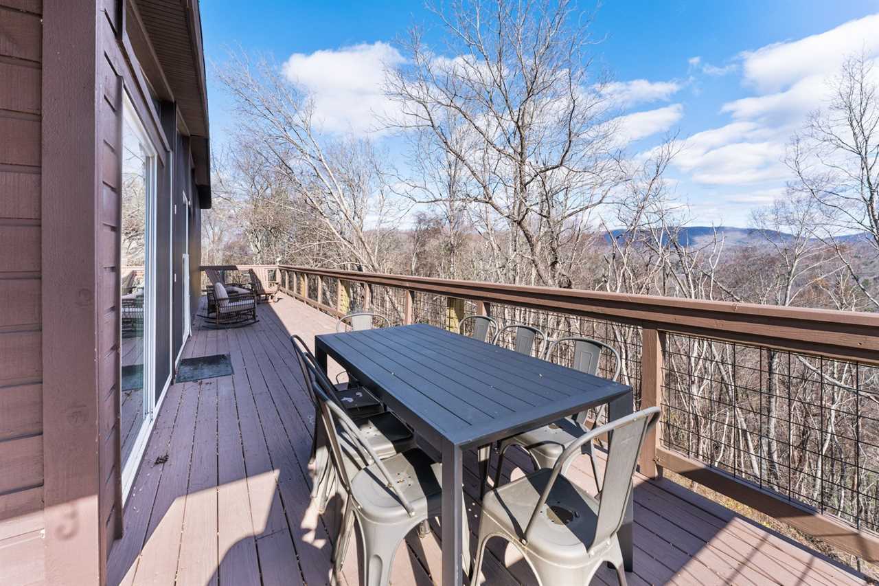 A large sunroom with huge sliding glass doors lets in the sun and leads out to the expansive deck with mountain views and plenty of outdoor seating. The sunroom is accessed via the main living area or the master bedroom. In the master bedroom, guests will enjoy a spacious room with a king bed, tv, and private bathroom. A second king bedroom has a tv and private bathroom, the third bedroom has a queen bed. A semi-private sitting room has a gas fireplace and comfortable sofa that converts to a king bed for flexible sleeping arrangements.