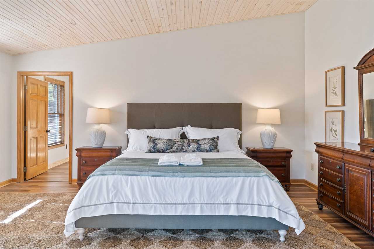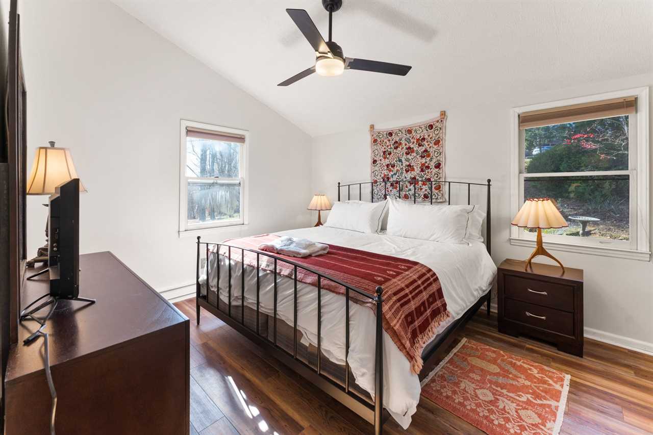 The Wydown House is flanked by a gently sloping yard and is perched perfectly to enjoy rolling mountain views from the back. Up to two dogs are allowed to be included with a reservation for an additional pet fee. Heating and cooling is offered via mini-splits for year round comfort, with two bedrooms also having baseboard heat. Winter travelers should be prepared with 4WD or AWD vehicles. The road leading to the home is a steep gravel road. YouTube TV service is offered on both the living room and master bedroom TVs. This home is equipped with a backup power generator.