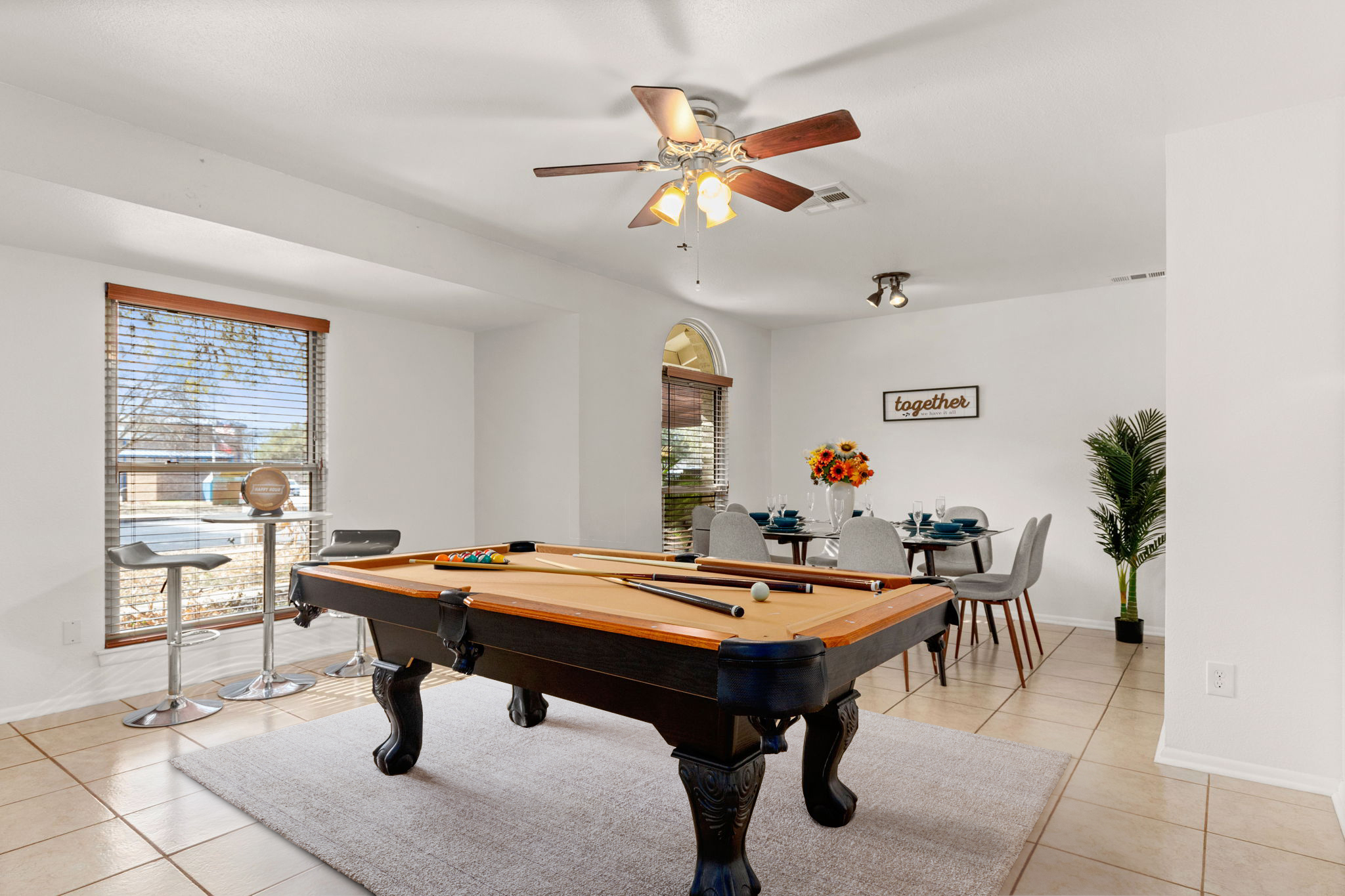 There's also plenty of dining space. We have a large family table as well as a really cool dining space in the indoor patio that overlooks the backyard! The living area also features a large 4k smart TV.