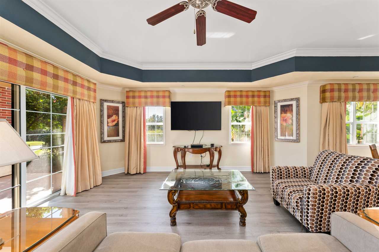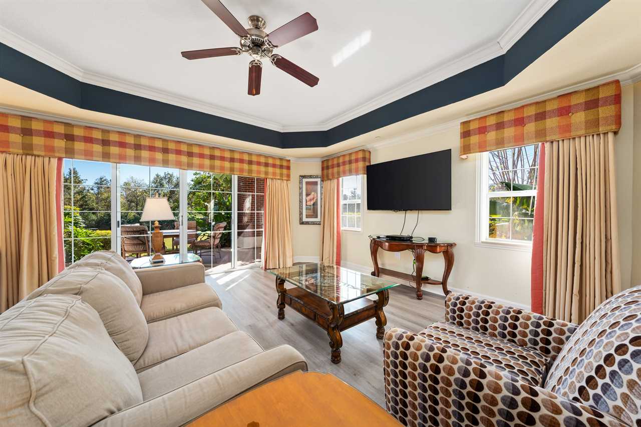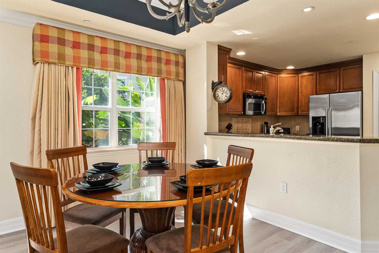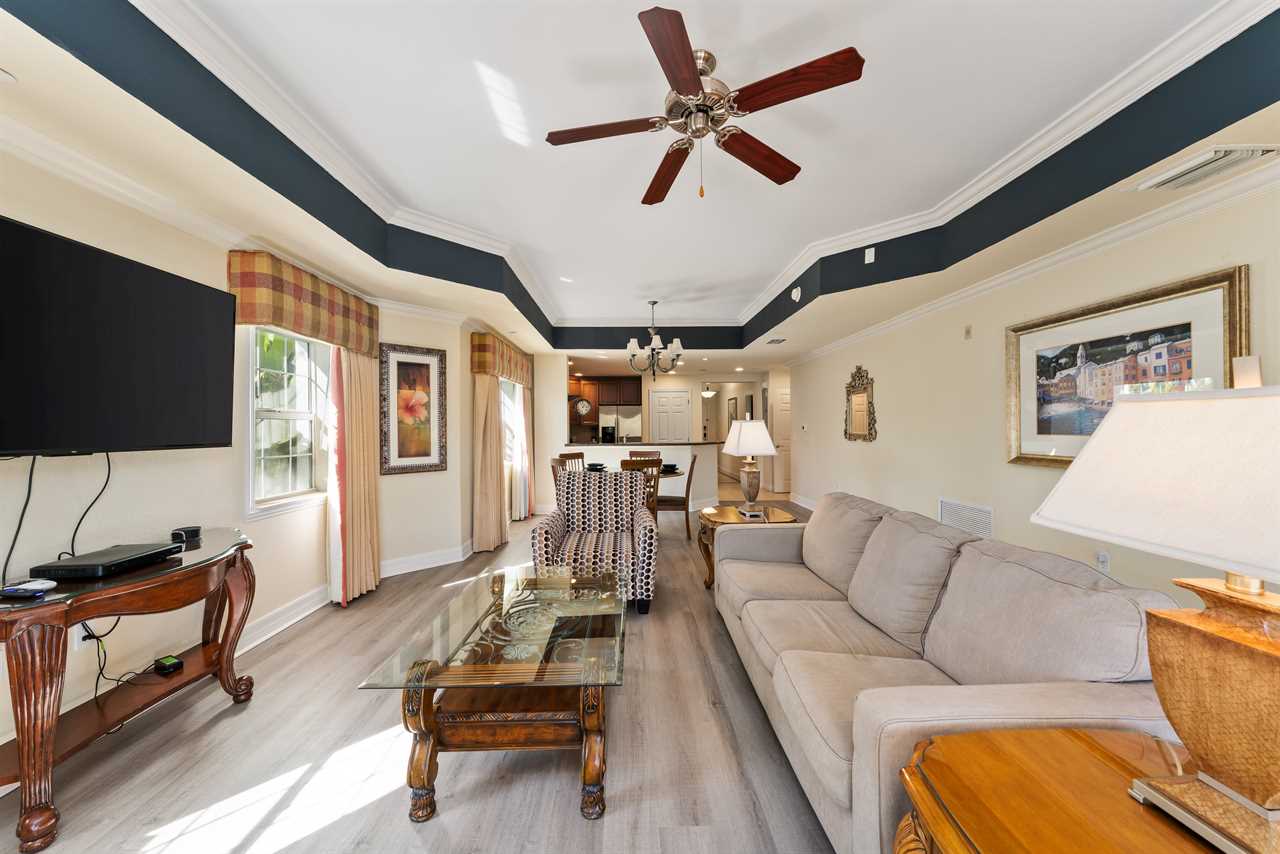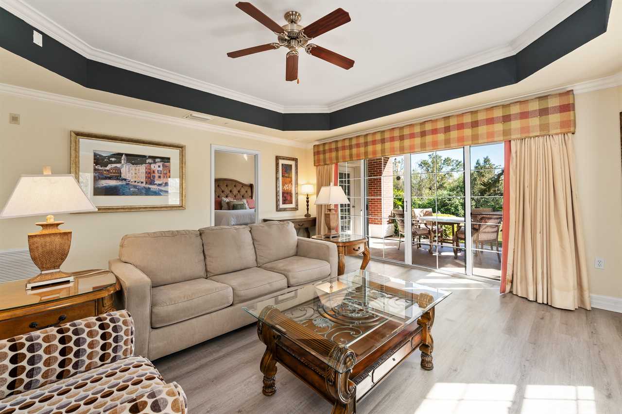 Nestled in the exclusive Villas South community within Reunion Resort, this inviting condo offers a serene retreat with modern comforts and picturesque golf course views. The living room is a cozy haven featuring a plush sofa and chair, complemented by a wall-mounted smart TV for entertainment. Nearby, a dining table provides seating for five, perfect for meals or game nights.