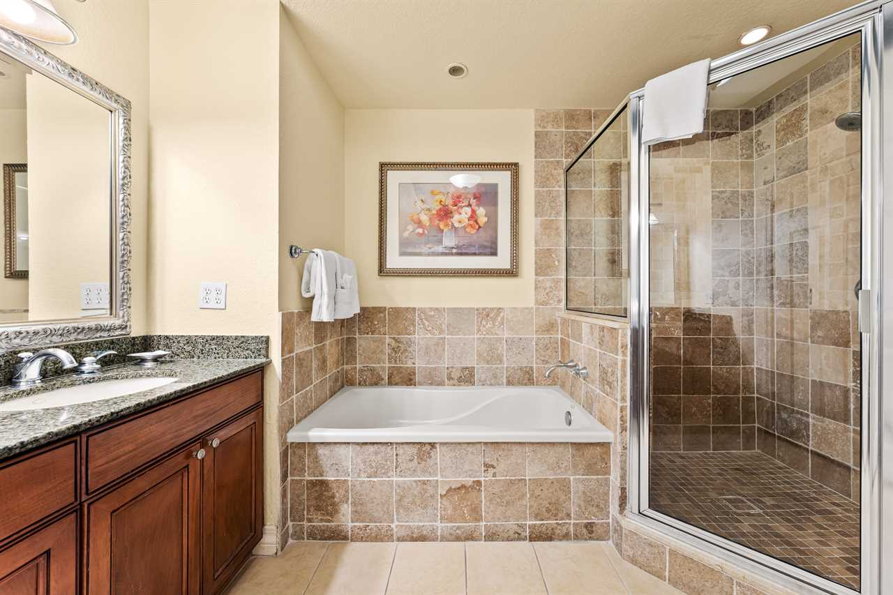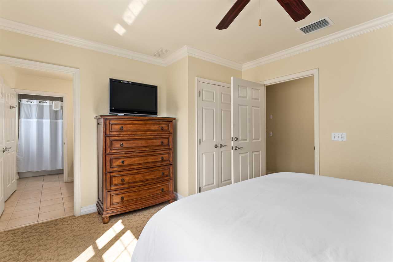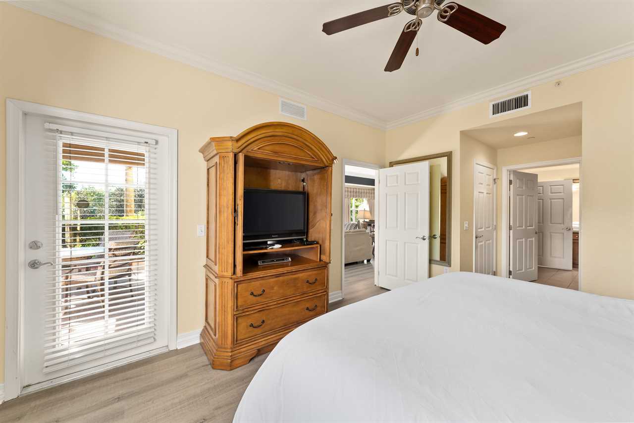 The right-side queen master bedroom boasts a flat-screen TV, ceiling fan, and an ensuite bathroom with a tub/shower combination. On the left, the full/full bedroom offers comfortable accommodations with a smart TV, ceiling fan, and access to a shared hall bath with a tub/shower combo. At the back of the condo, the king master suite offers a private escape, complete with a flat-screen TV, ceiling fan, patio access, and an ensuite featuring both a tub and a separate bath.