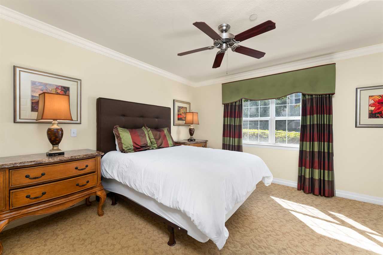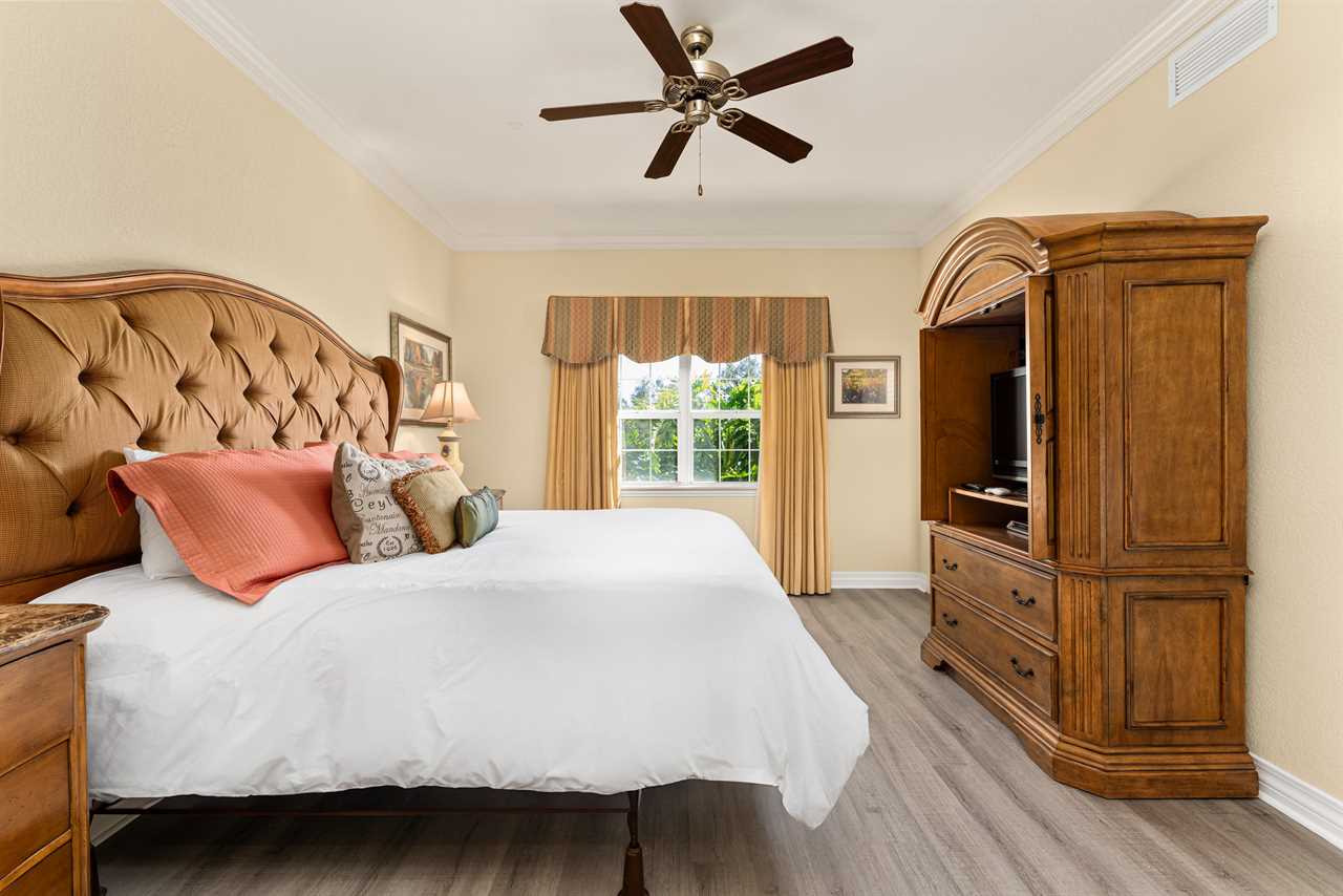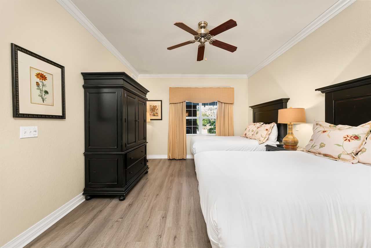 The right-side queen master bedroom boasts a flat-screen TV, ceiling fan, and an ensuite bathroom with a tub/shower combination. On the left, the full/full bedroom offers comfortable accommodations with a smart TV, ceiling fan, and access to a shared hall bath with a tub/shower combo. At the back of the condo, the king master suite offers a private escape, complete with a flat-screen TV, ceiling fan, patio access, and an ensuite featuring both a tub and a separate bath.