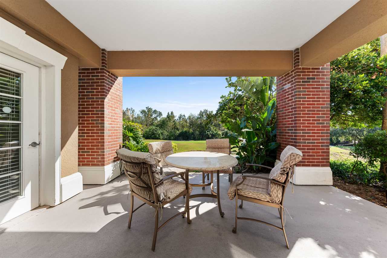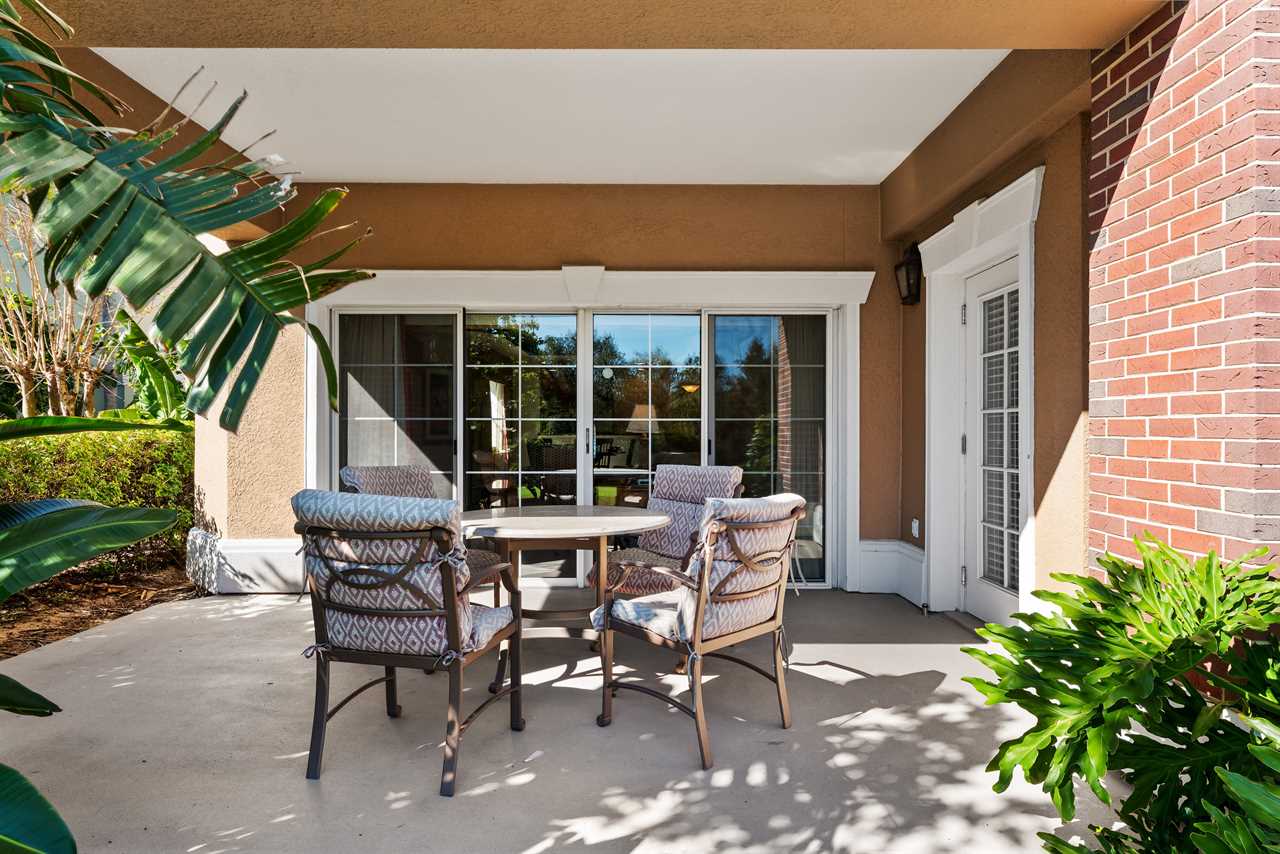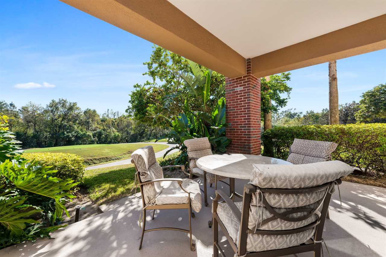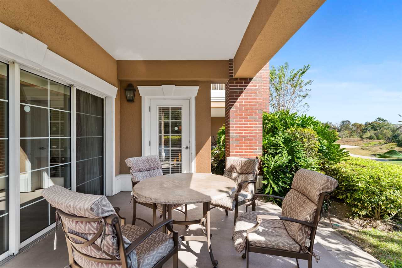 Step out onto the patio to enjoy tranquil golf course vistas, complete with a table and four chairs, and a touch of outdoor greenery in the adjacent yard space.