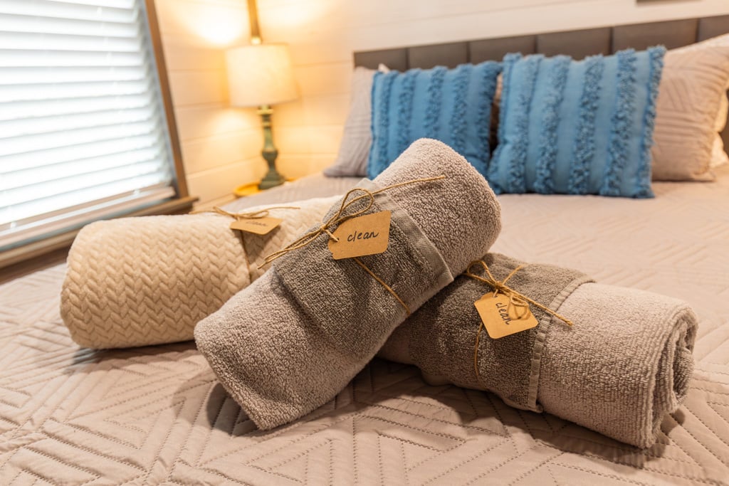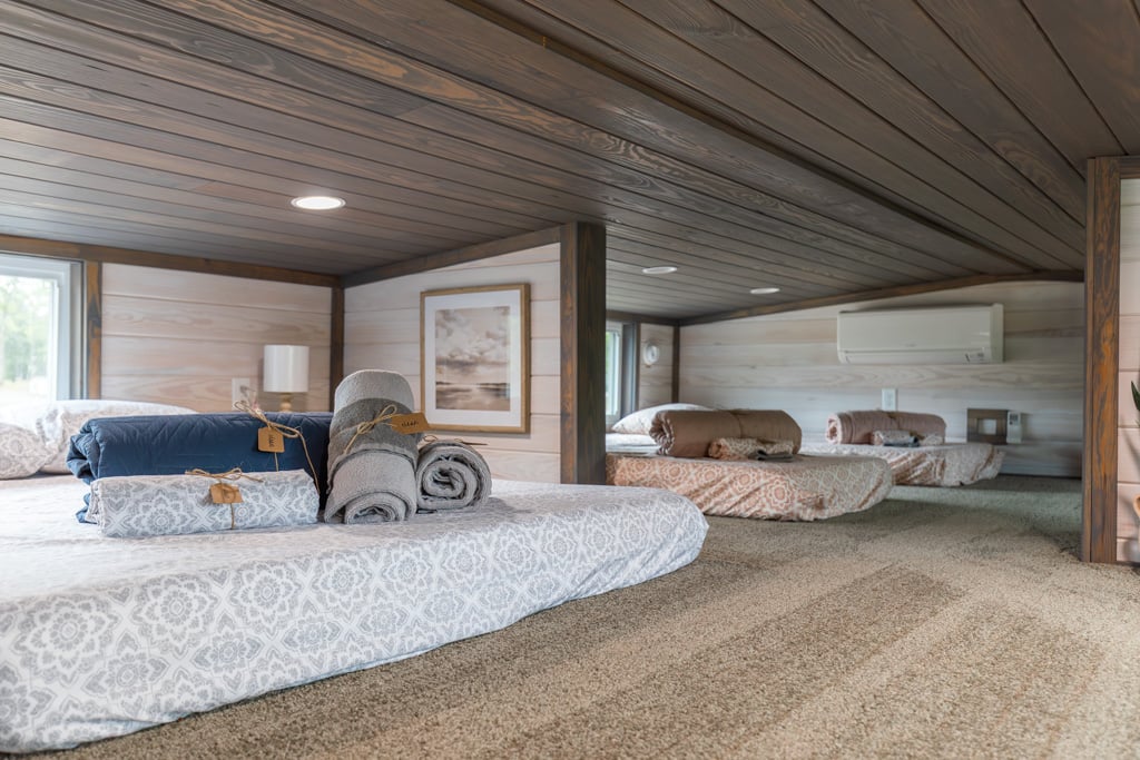 Master Bedroom: Queen Bed | Bedroom #2: Foldout Futon (Twin) | Upstairs Loft: Queen Bed (x1) & Twin Beds (x2) | Living Room: Queen Sofa Sleeper