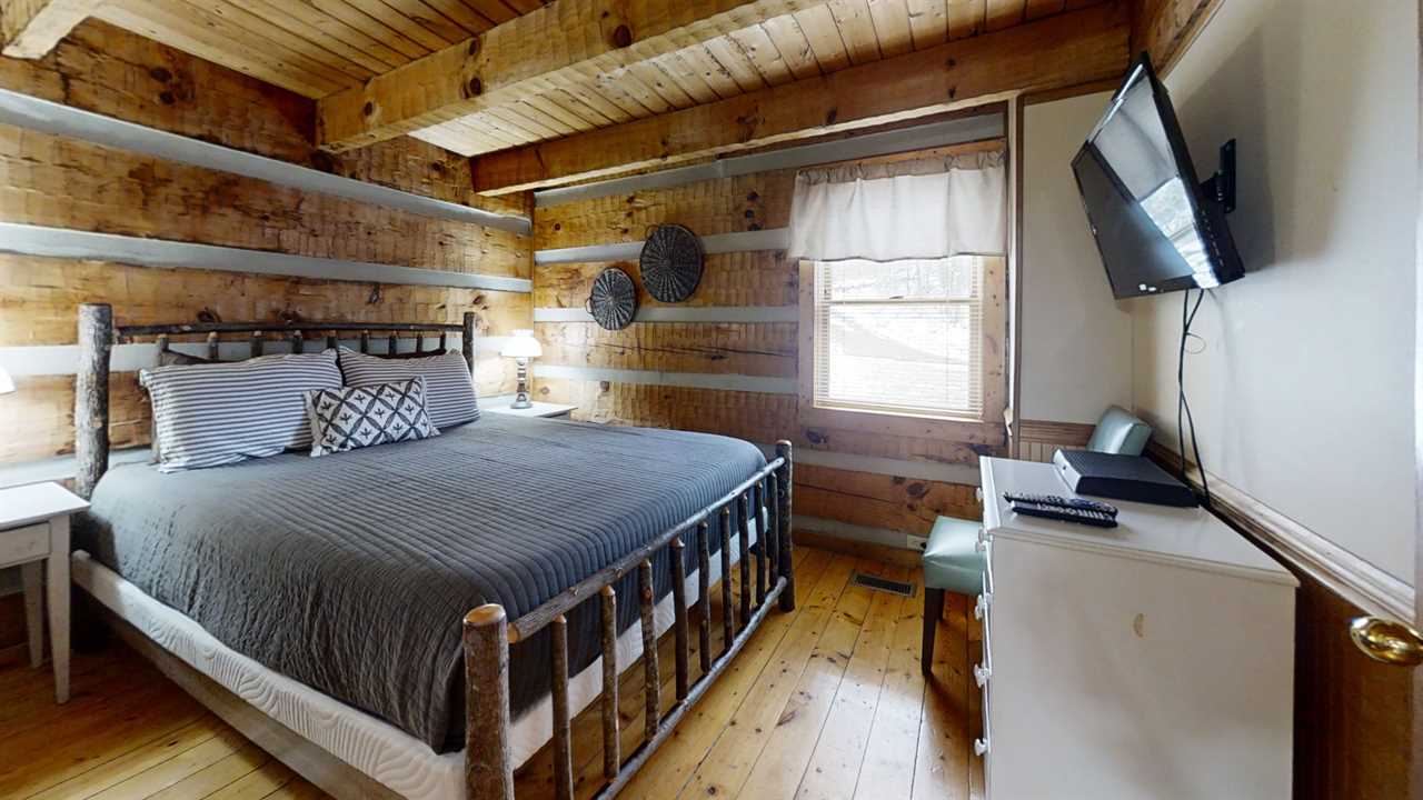 This living room is a warm, cozy space inviting relaxation and entertainment. The room's centerpiece is the crackling fireplace that provides warmth and ambiance enjoyed from the comfort of the cozy 3-person sofa, perfect for snuggling up with loved ones. The large flat-screen TV mounted above the mantle offers endless entertainment options. Two oversized, comfy chairs create an inviting spot to read a good book or enjoy a quiet moment. Open the double doors and step out onto the covered deck for a breath of fresh mountain air.