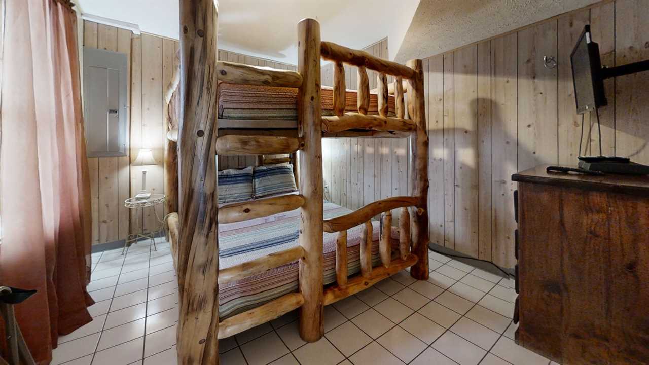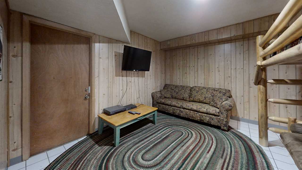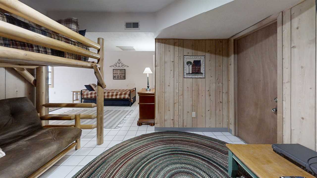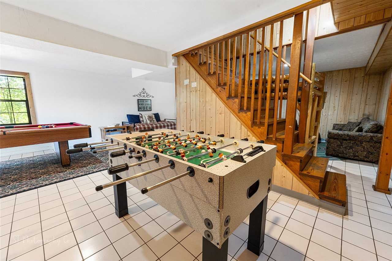 This game room is a fun and lively space designed to bring out the kid in everyone. The room has a full-size pool table, perfect for friendly competitions and laughs with friends and family. A Foosball Table is also set up for quick pick-up games or tournaments, providing hours of entertainment for all ages. This spacious room also has a twin bed and additional chairs, allowing seating for everyone to spread out and have fun without feeling cramped. A table with four chairs is perfect for family game nights. A sitting area around the corner has a comfy sofa, a futon bed, a twin bed for additional guests at night, and a flat-screen TV. This game room is the perfect spot to make memories and have fun!