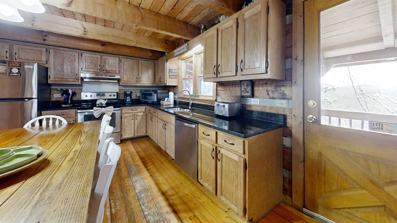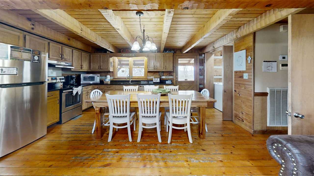 The kitchen and dining area are a culinary haven that combines functionality with style. The fully equipped kitchen features stainless steel appliances, including a refrigerator, stove, and microwave, making meal preparation a breeze. A coffee maker is also provided for a morning pick-me-up. The dining area boasts an 8-person table, perfect for family gatherings or corporate meetings. The room is illuminated by natural light pouring in through large windows, and the warm tones of the cabin's wooden accents create a cozy atmosphere that invites relaxation and conversation. Dish towels, dish starter soap, and dishwasher starter pods are provided.