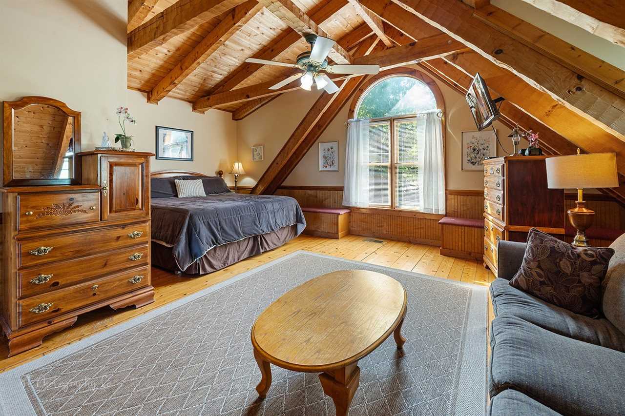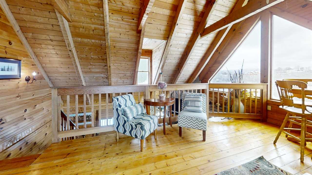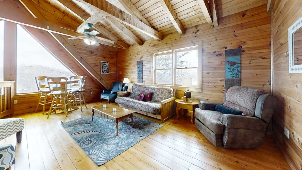 Nestled in the heart of the loft area, this inviting space features a cozy futon, perfect for lounging or accommodating guests at bedtime. A table with four matching chairs creates an ideal setting for meals or games, while three comfortable armchairs offer additional seating for relaxation. Large windows frame stunning mountain views, filling the room with natural light and offering a picturesque backdrop for any activity. This space seamlessly combines comfort and charm, making it a perfect retreat.