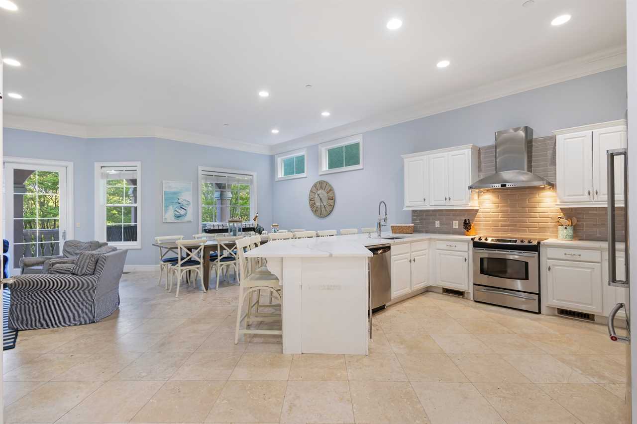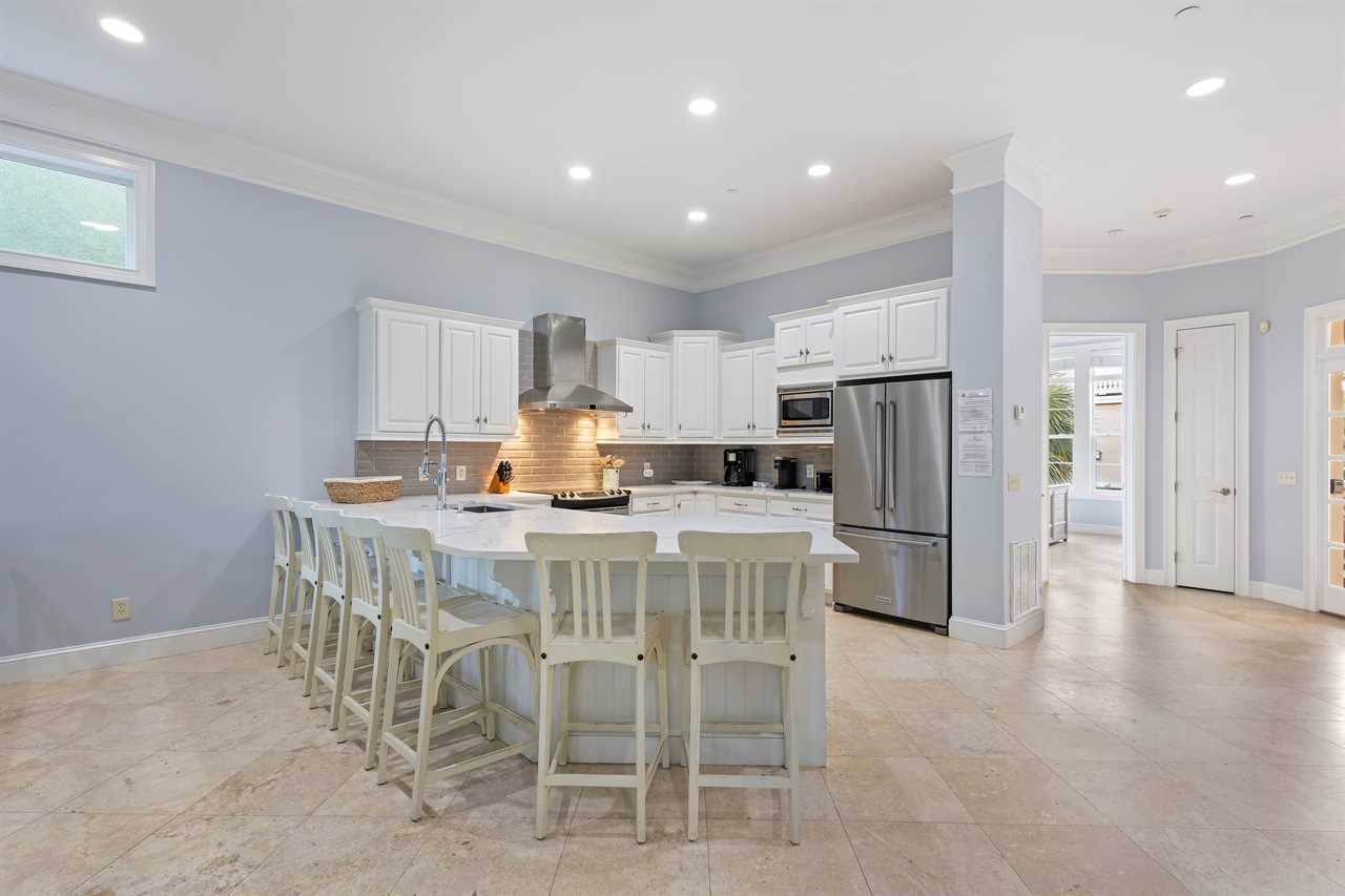 Whip up culinary delights in a fully equipped, modern kitchen featuring top-of-the-line appliances. Savor your creations at the expansive dining table or gather around the island bar to watch the chef's masterpiece come to life.