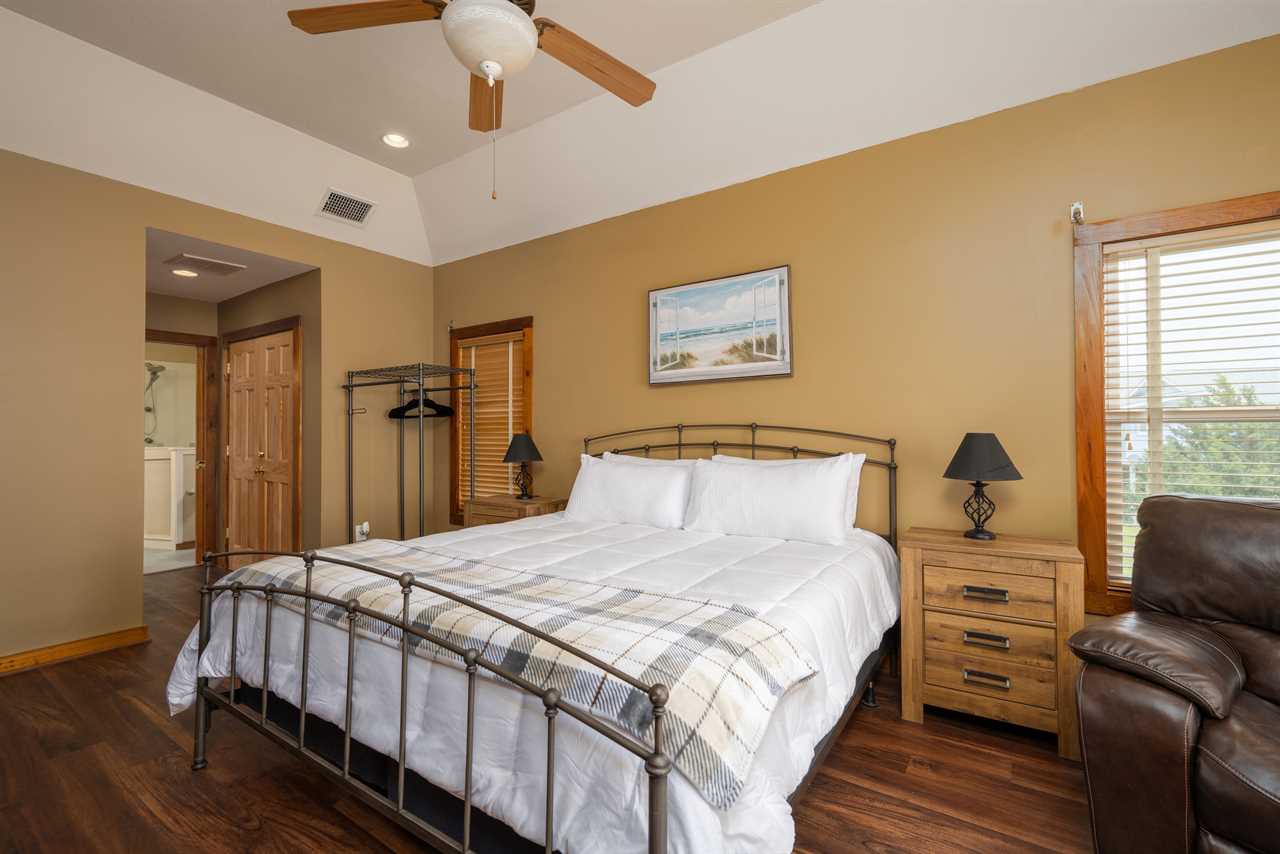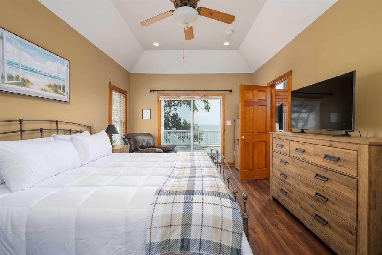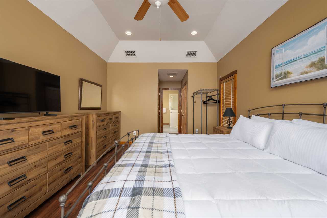 Primary Bedroom – King bed, smart TV, private en-suite bath with walk-in shower