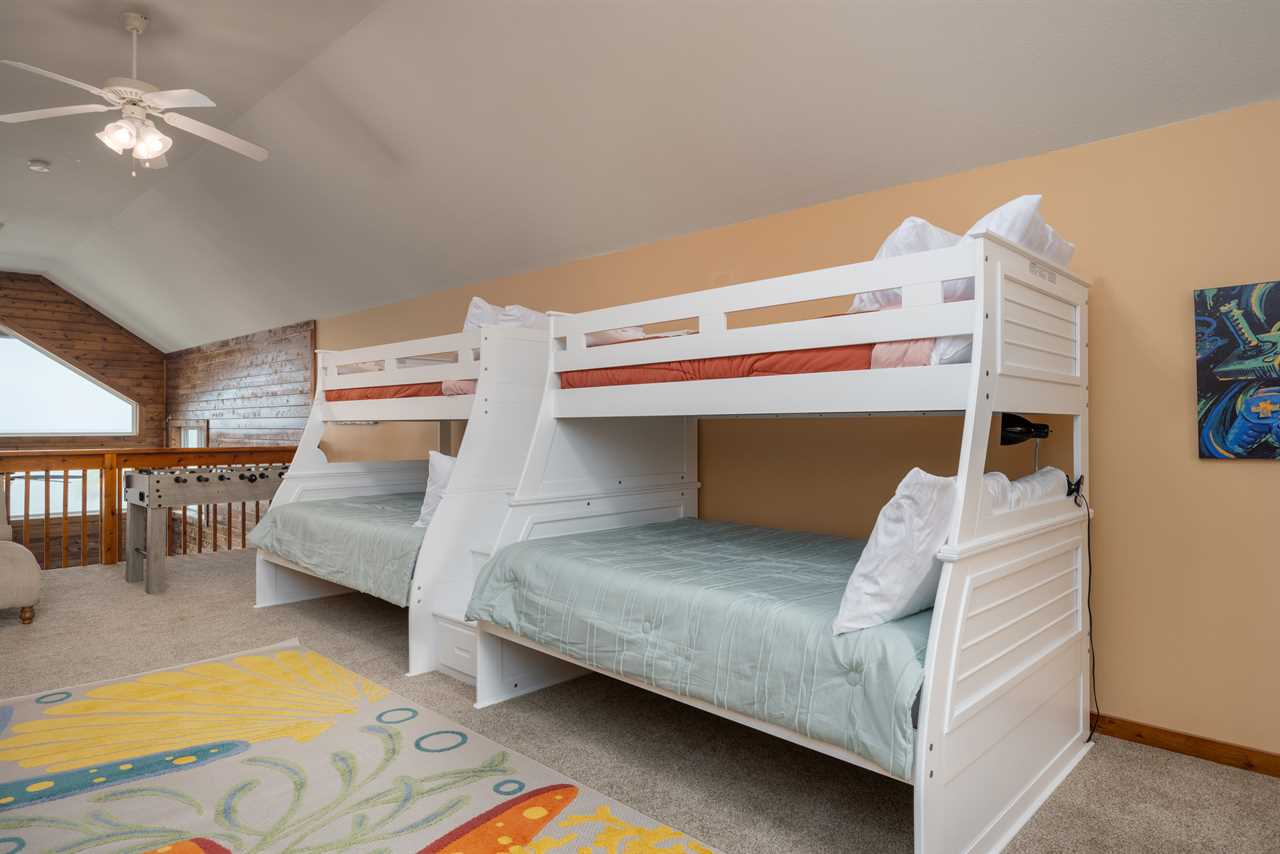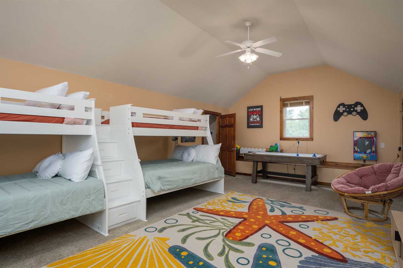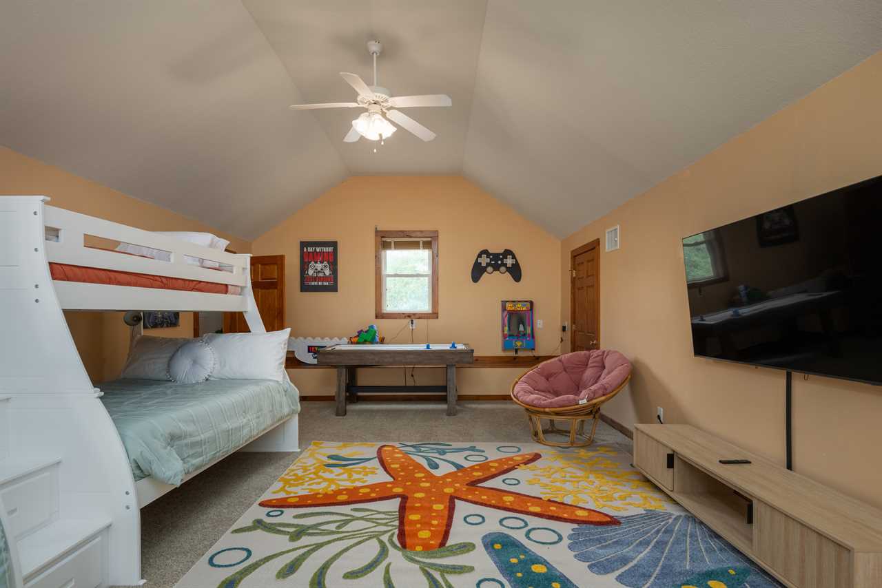Loft Bedroom – A teen-friendly haven with two twin-over-full bunk beds, smart TV, and a game zone.