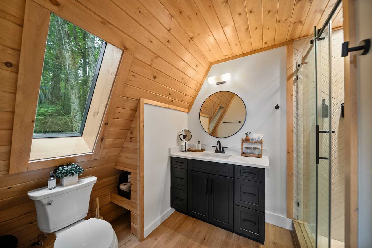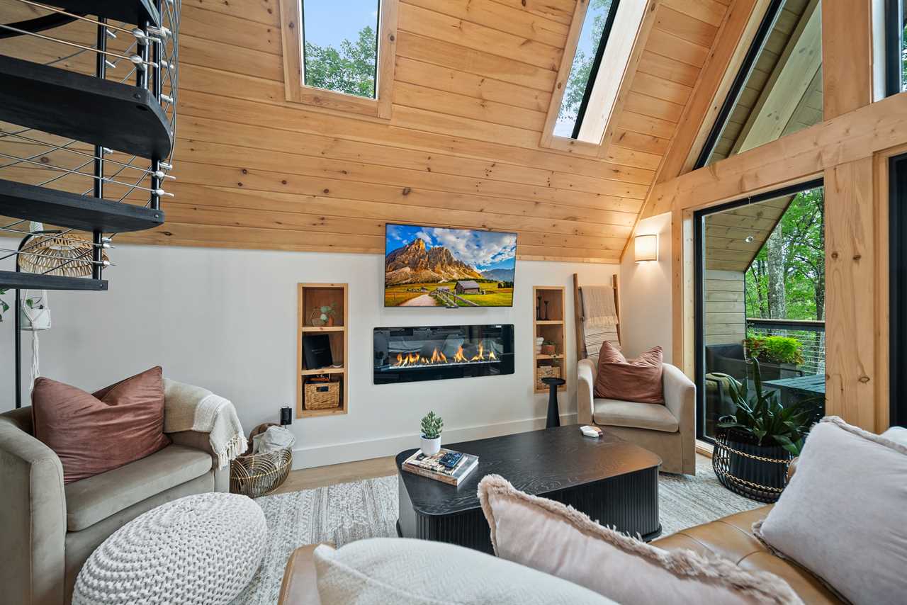 Climb the steps to the tree level to enter your new favorite hideaway. Inside, the soaring A-frame architecture surrounds you with natural light, wood accents, and panoramic forest views with the timeless Blue Ridge mountains visible beyond the trees. The main level features a plush queen bed for easy, restful nights, while the sleeping loft at the top of the spiral staircase offers a spacious king bed tucked beneath vaulted ceilings and skylights: the perfect place to wake with the sun or gaze at the stars.