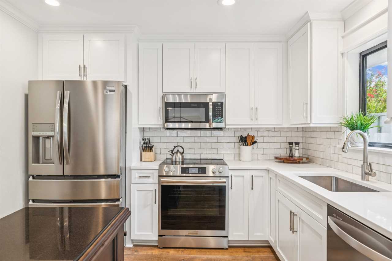 Cook up delicious meals in the fully equipped modern kitchen featuring a flat top stove, stainless steel appliances, plenty of counter space, and a spacious dining table with seating for 8.