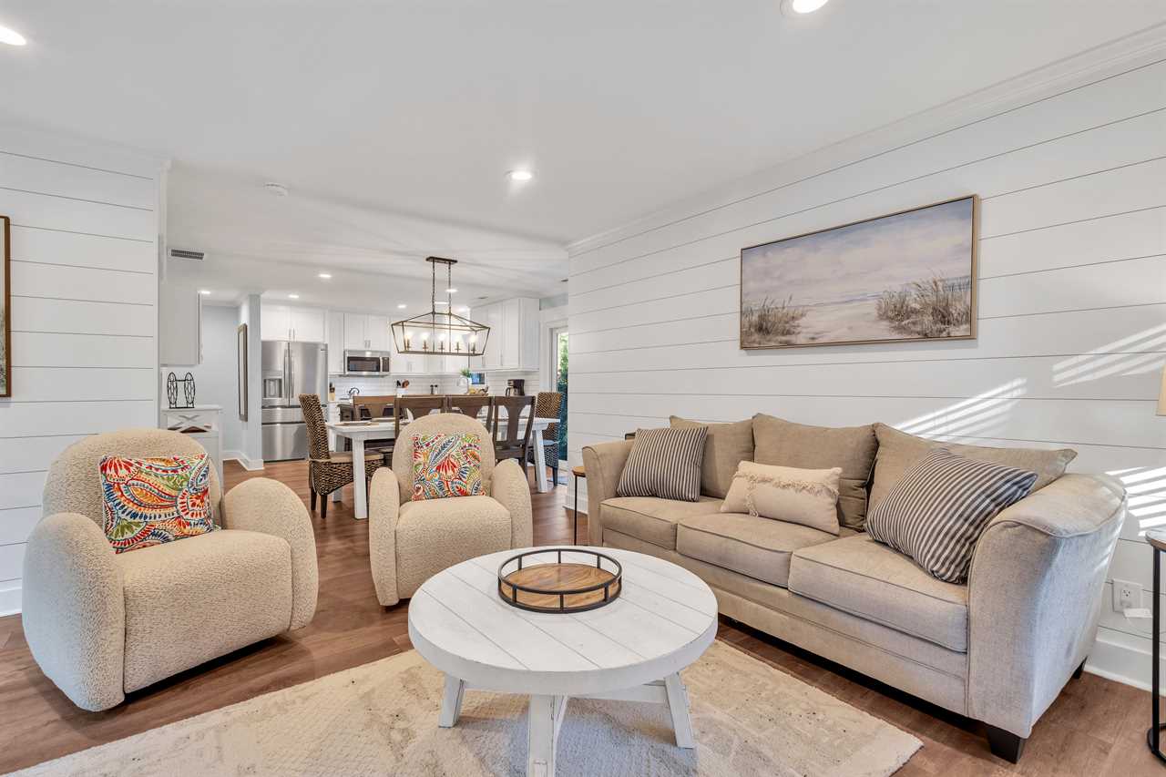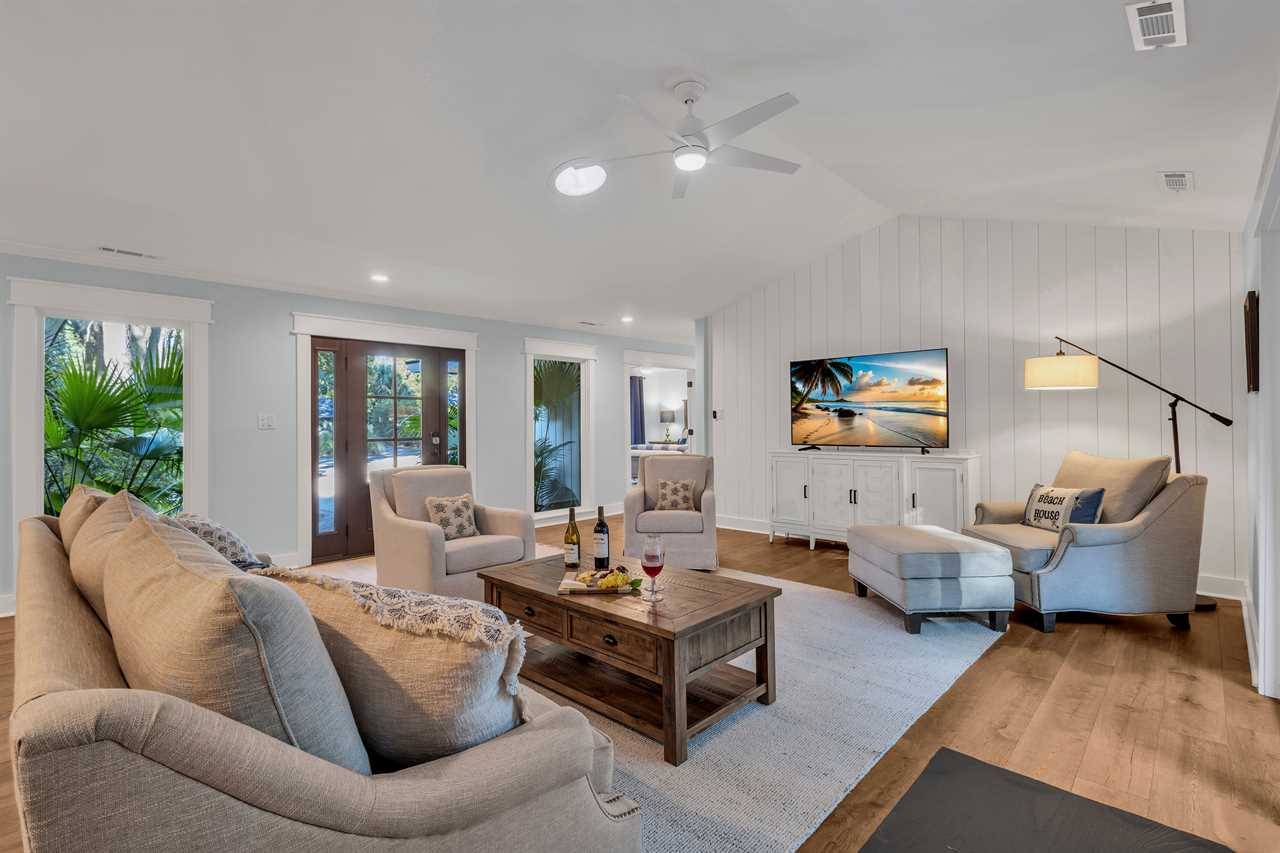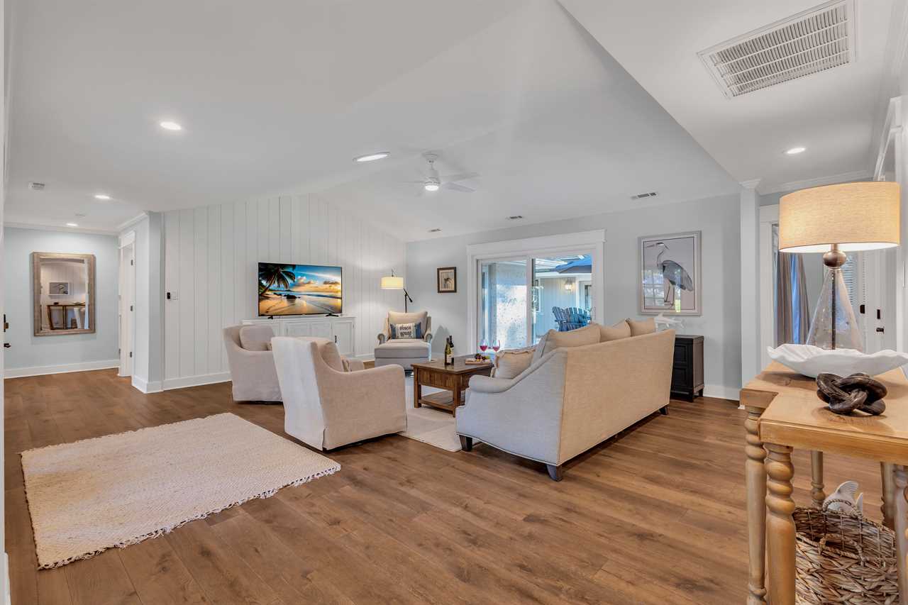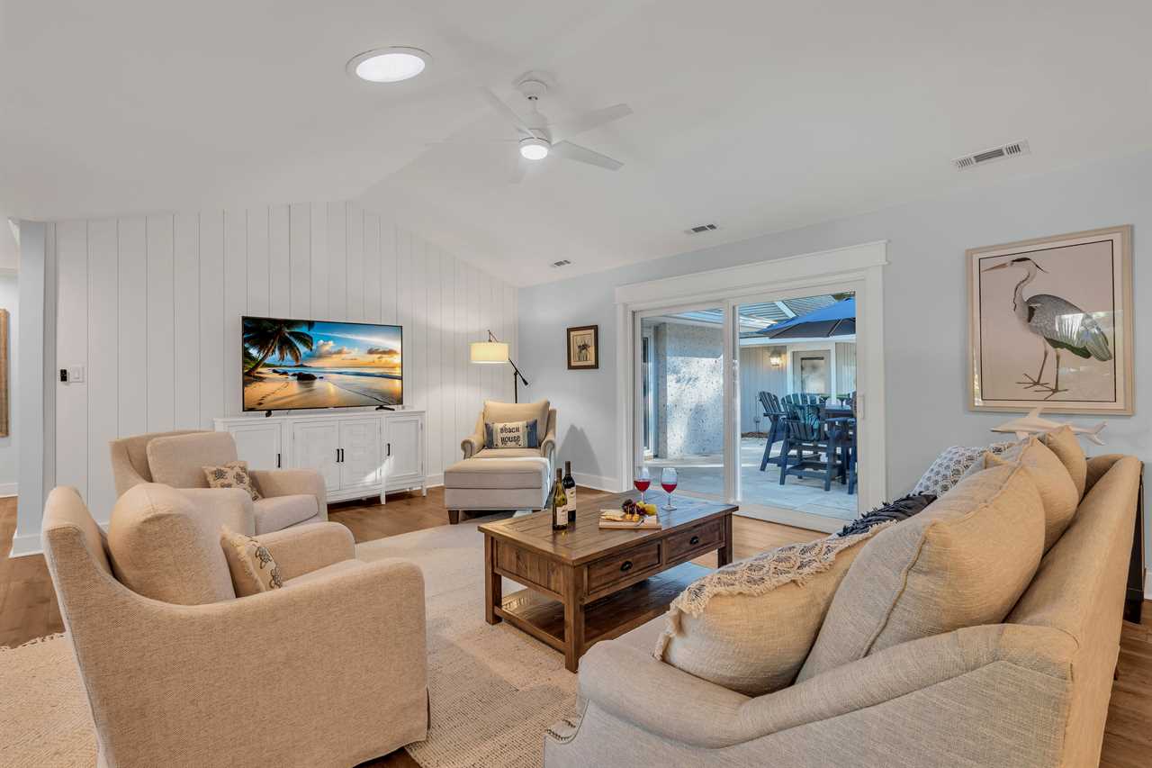 Adjacent to the kitchen is a coastal living room where a sleeper sofa and Smart TV await. A sliding glass door leads you out to the backyard pool patio. In the main living area, vaulted ceilings and natural lighting allow for comfort and relaxation for the whole group.