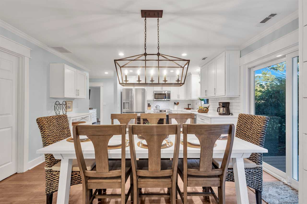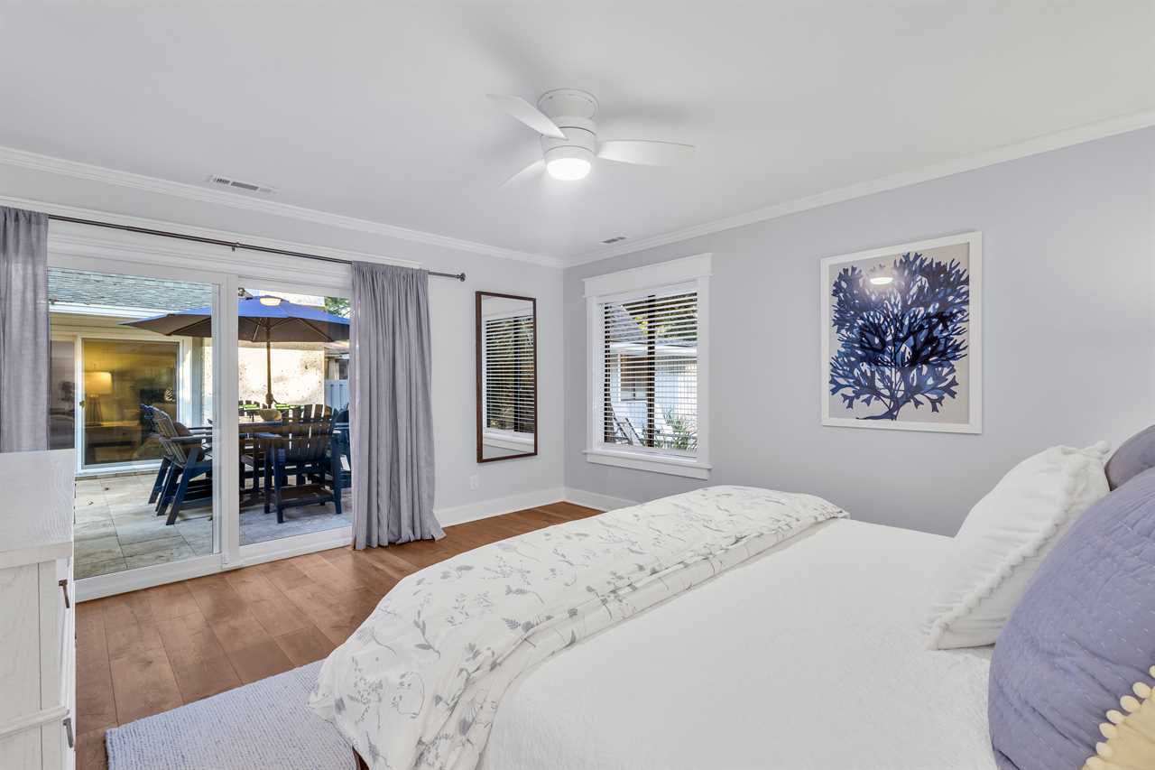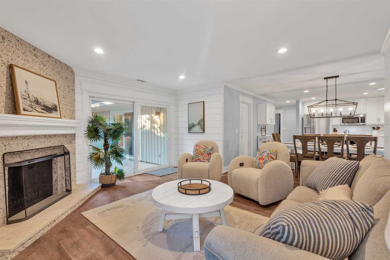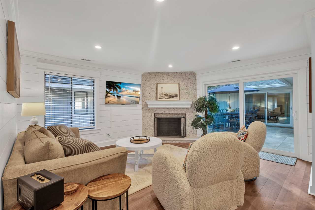 Adjacent to the kitchen is a coastal living room where a sleeper sofa and Smart TV await. A sliding glass door leads you out to the backyard pool patio. In the main living area, vaulted ceilings and natural lighting allow for comfort and relaxation for the whole group.