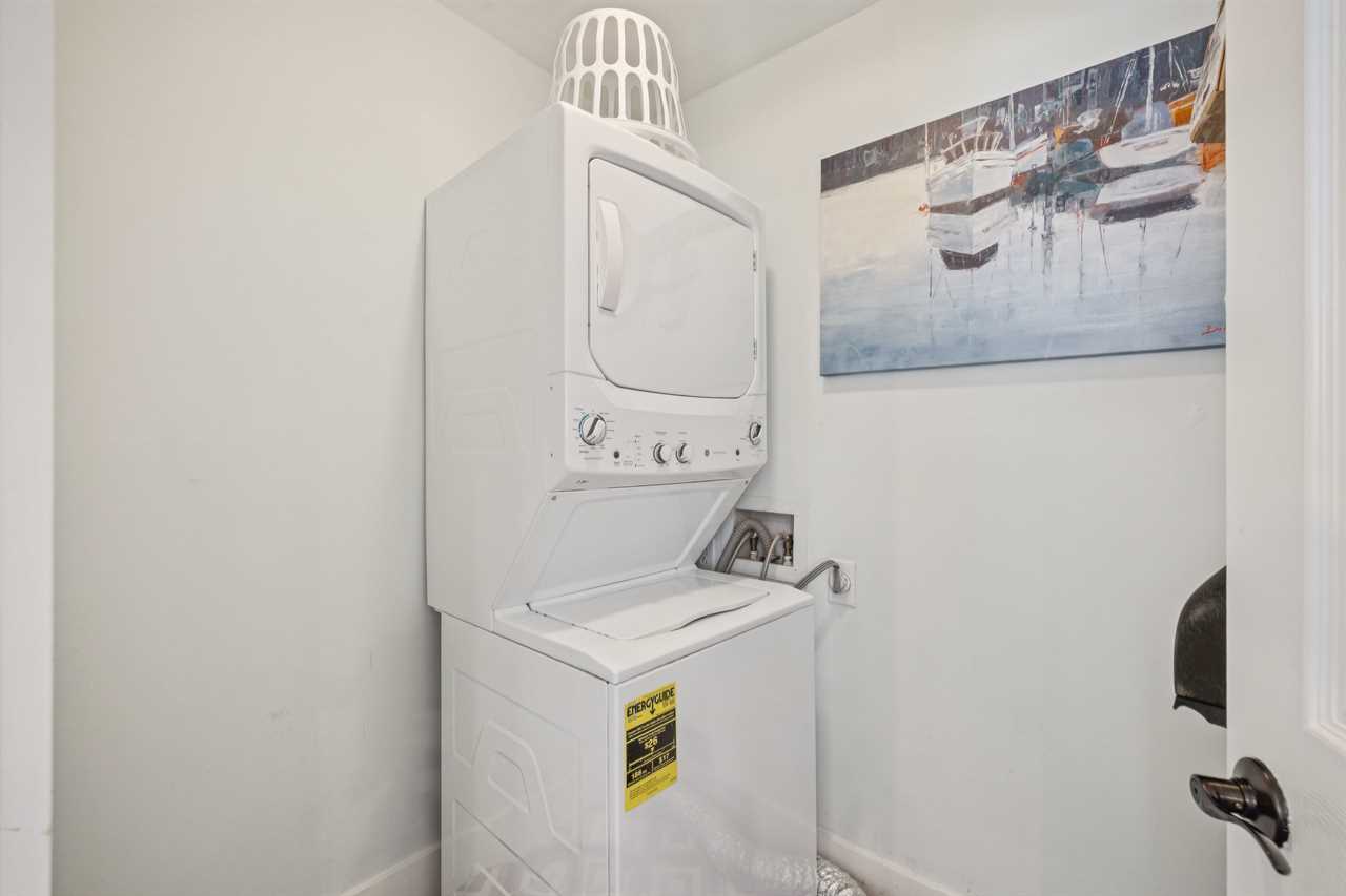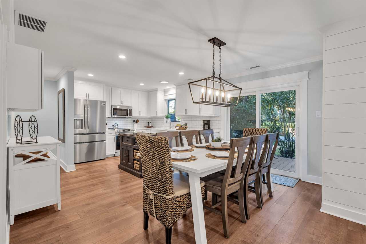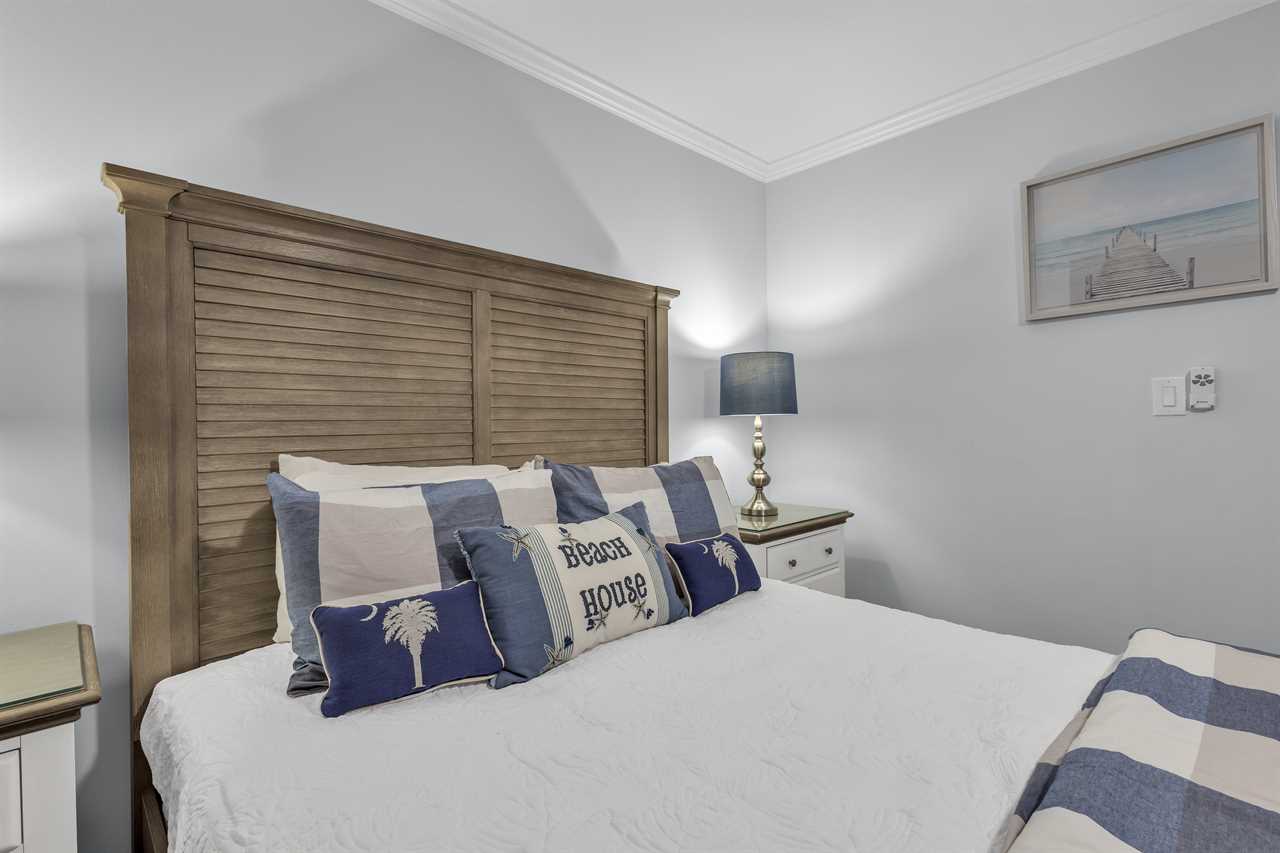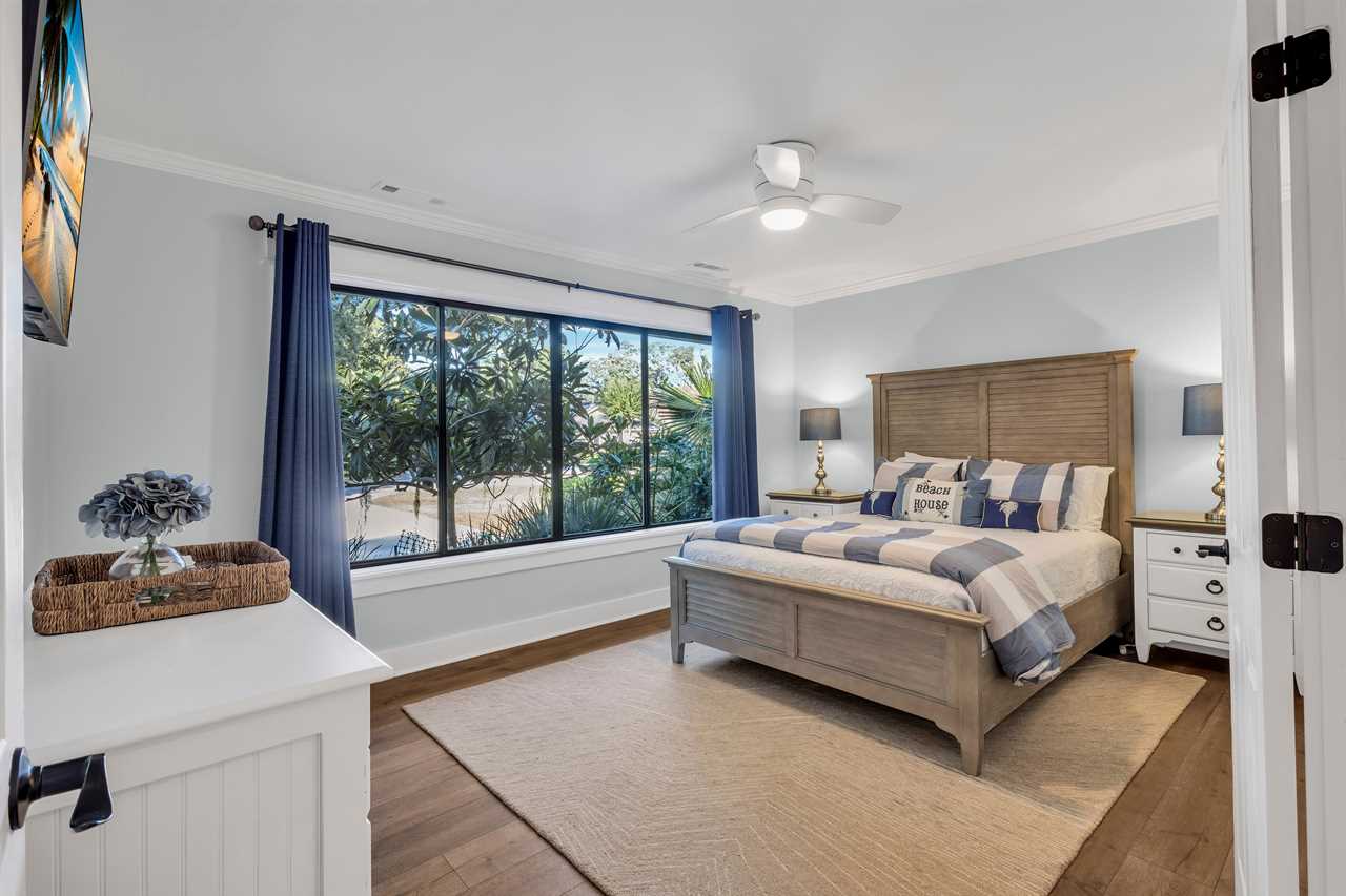 Adjacent to the kitchen is a coastal living room where a sleeper sofa and Smart TV await. A sliding glass door leads you out to the backyard pool patio. In the main living area, vaulted ceilings and natural lighting allow for comfort and relaxation for the whole group.