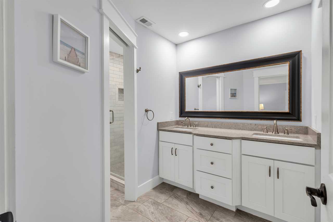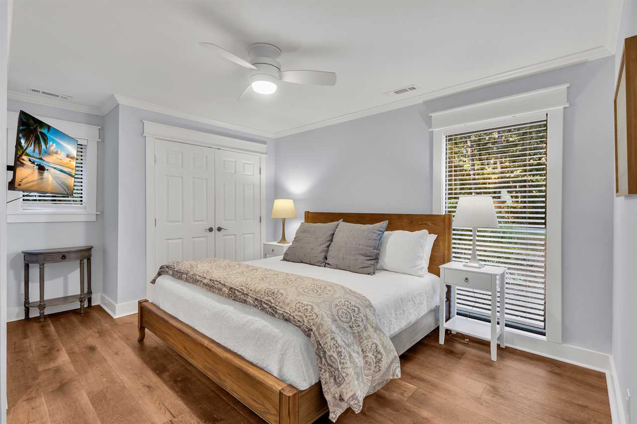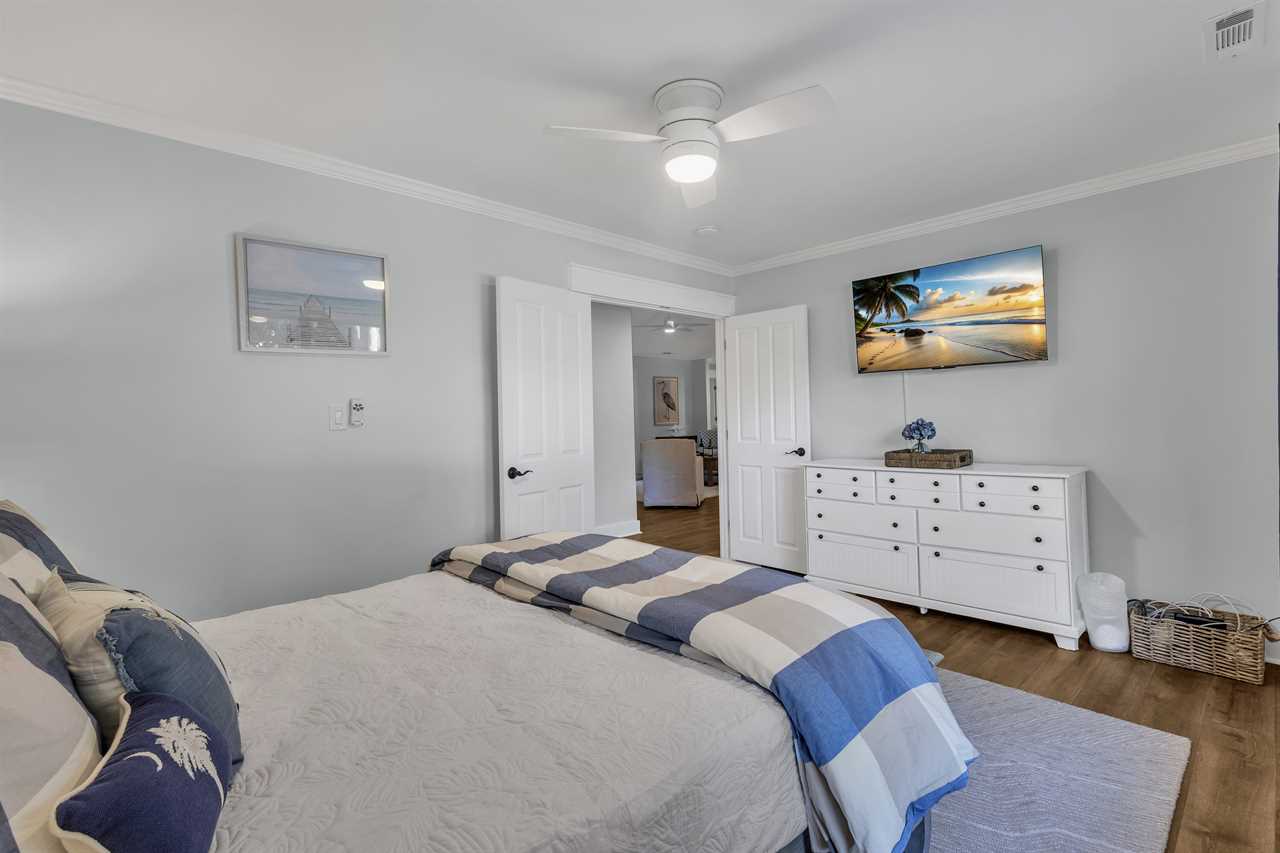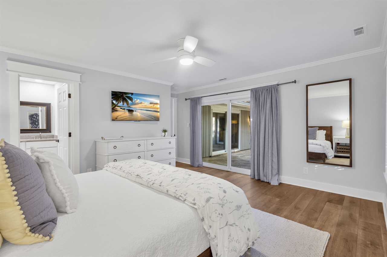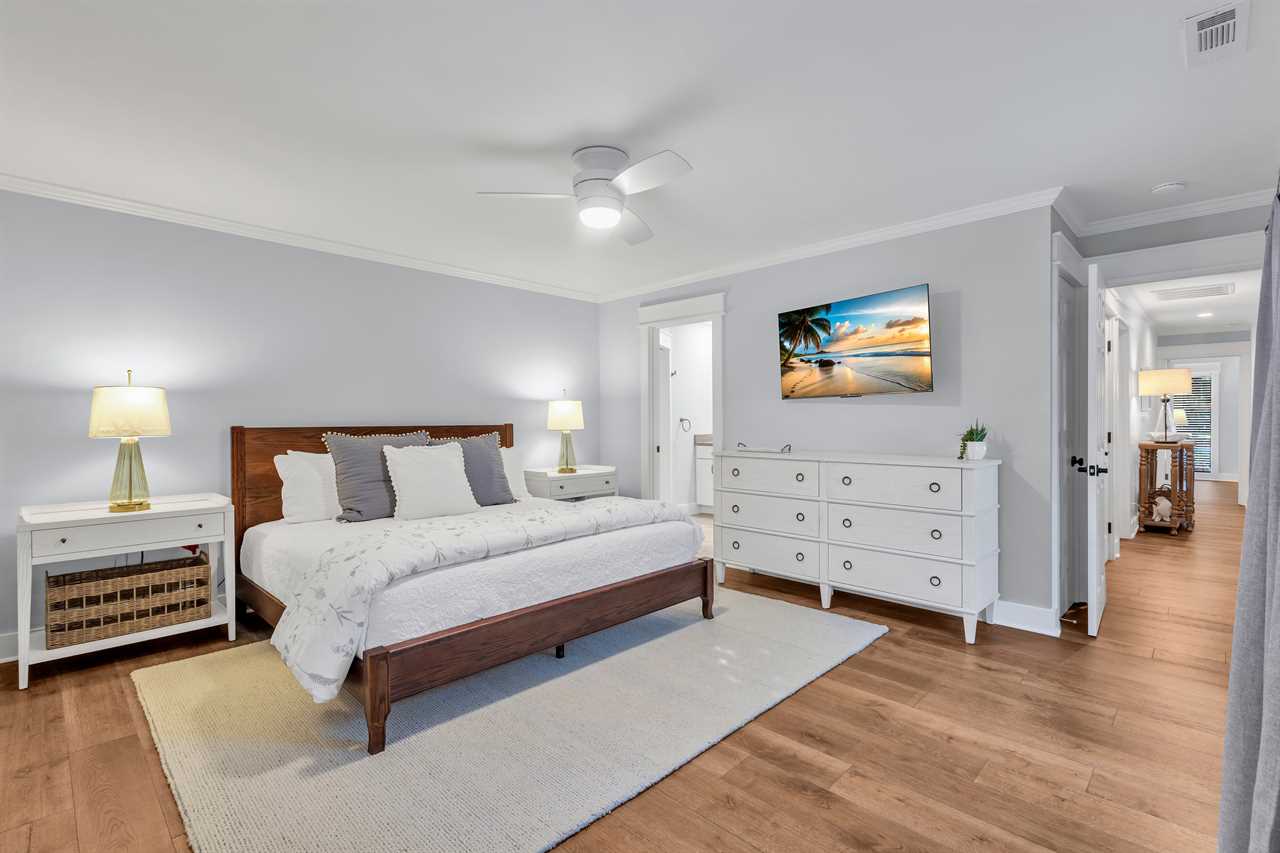 ✓ Bedroom 1: King Primary suite, en-suite bathroom with double vanity and walk-in shower, Smart TV, access to backyard patio